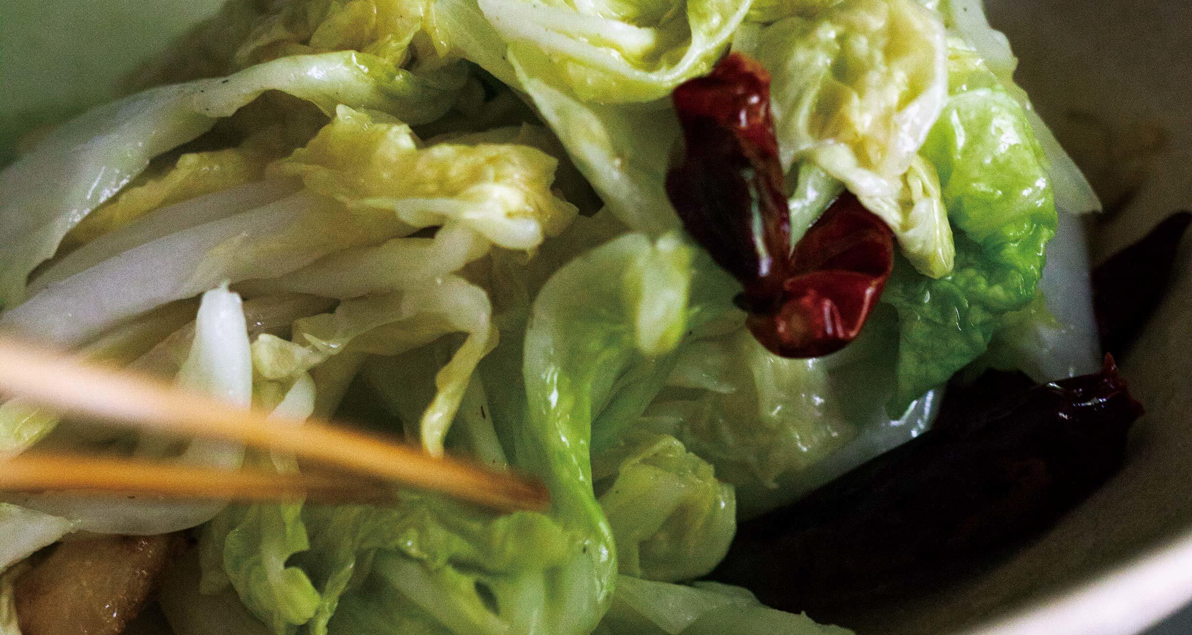 中国・西安で食べた炒め物が印象的で、アレンジした料理です。水1リットルに塩大さじ2を加えて、海水に近い塩水をつくることから始めます。ここに白菜を漬けますが、包丁で切らずに手でちぎることで味がよくしみます。同時に白菜の水分が抜けて、浅漬けのようなシャキシャキした食感が生まれます。炒めるときは水気をきらず、むしろ残してフライパンへ。塩水と油が乳化して、これがおいしいソースとなって白菜をコーティングします。