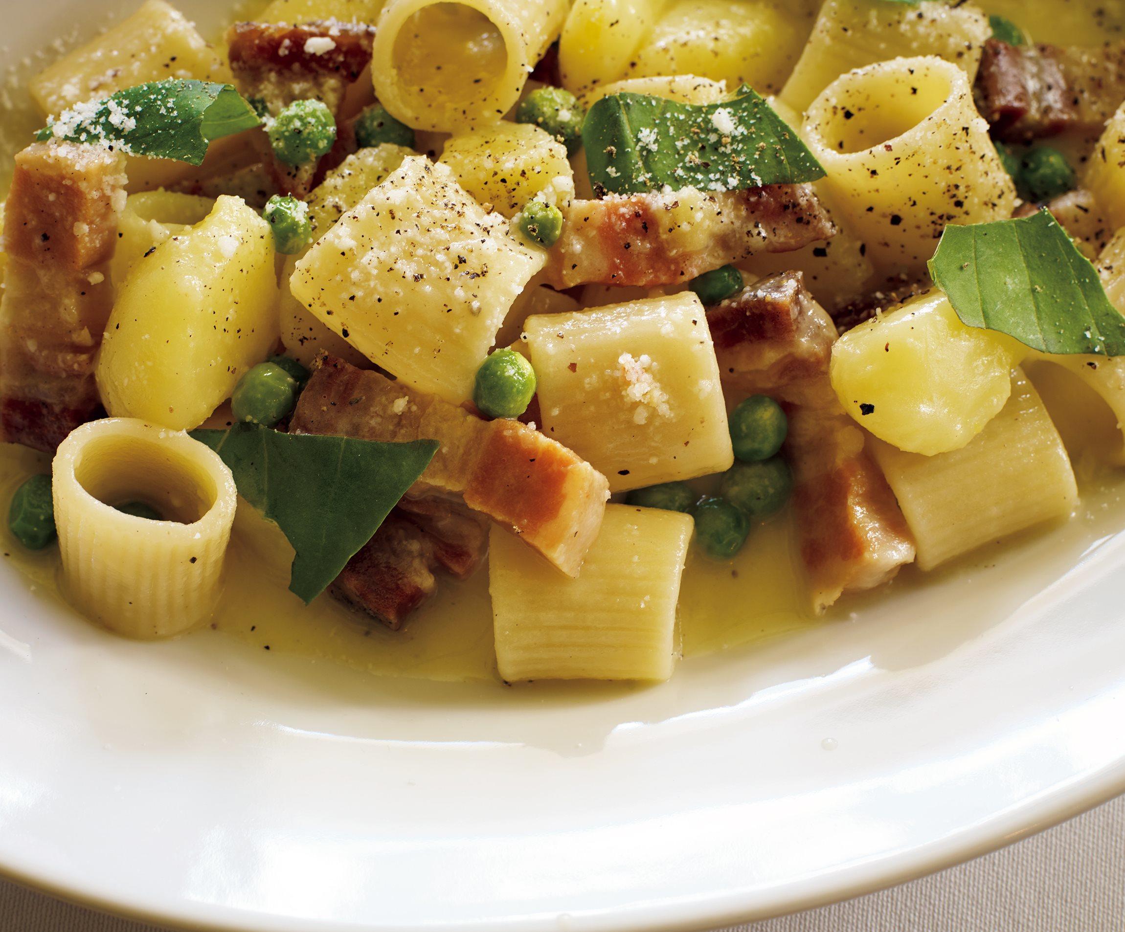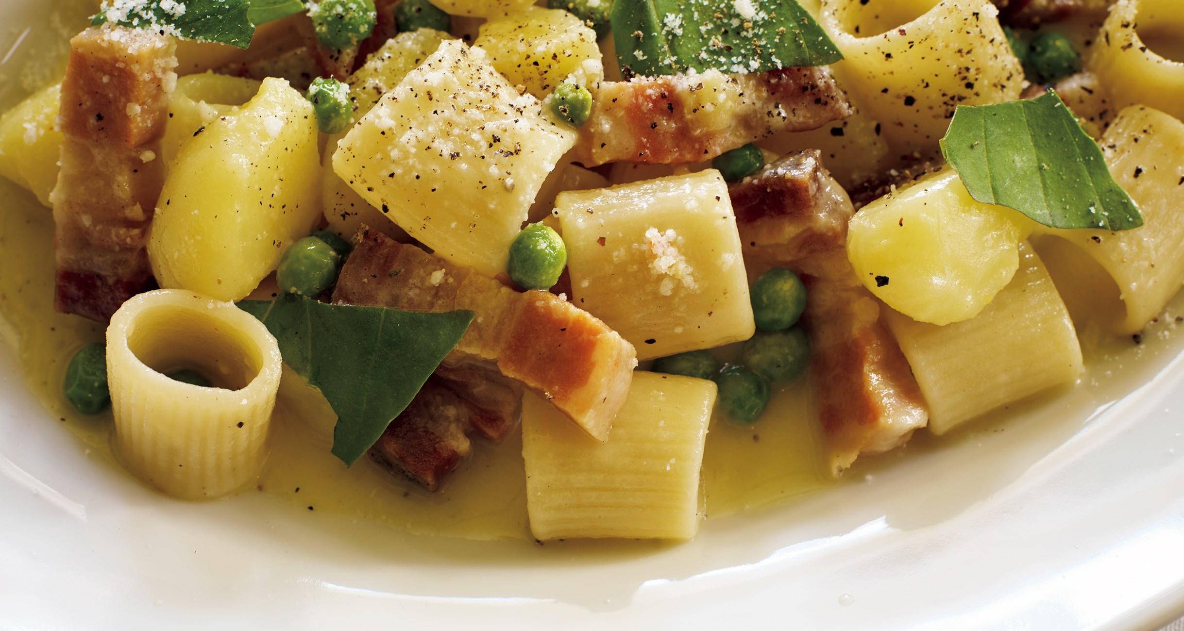 黒胡椒をたっぷりふって、中火で煮込む(隠し味にバジル1枚を入れても)。蓋をしないで煮るとじゃがいもの外側から火が入るので、外側をヘラで崩してソースになじませる。パスタのゆで上がり2分前にグリーンピースを入れる。