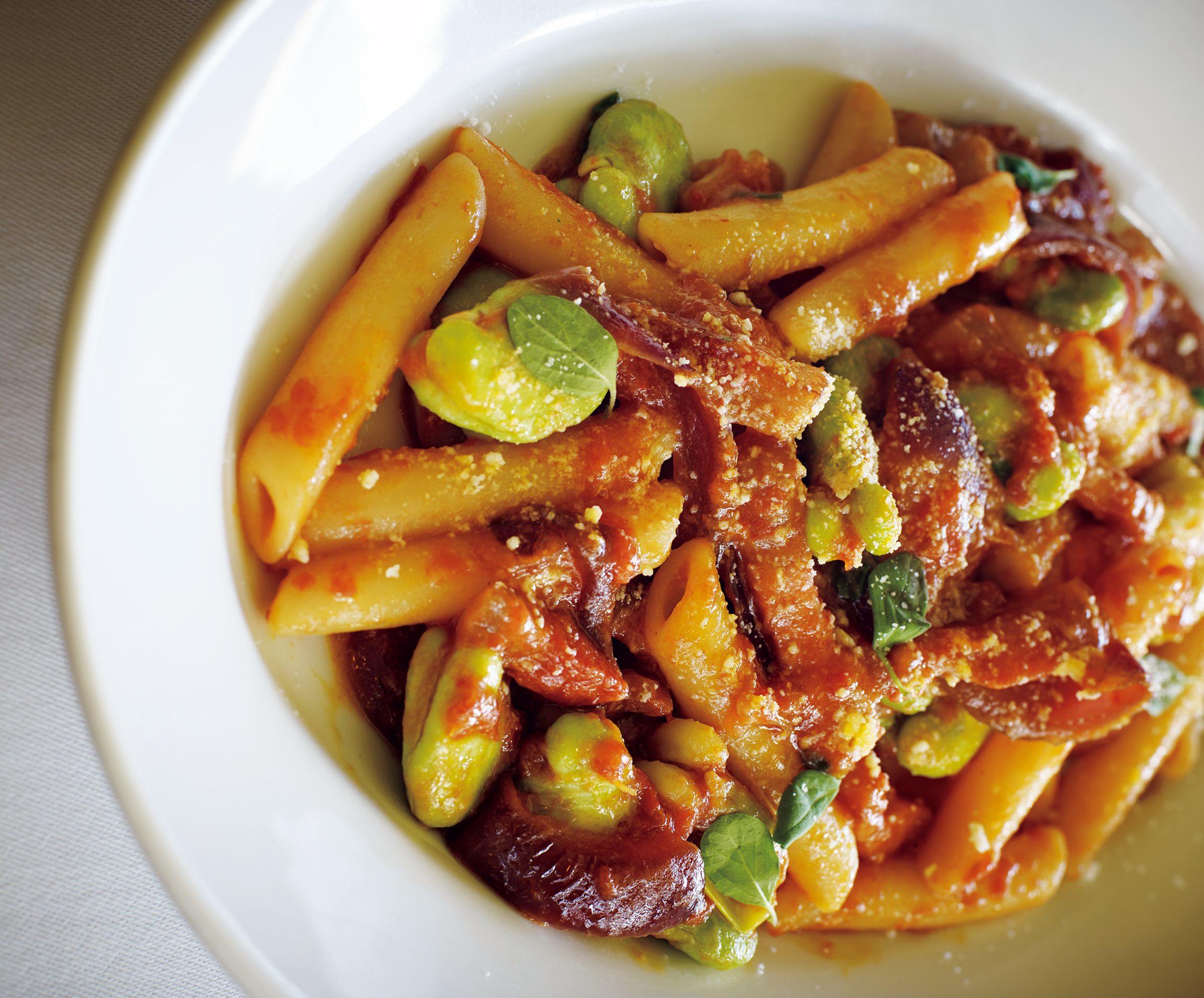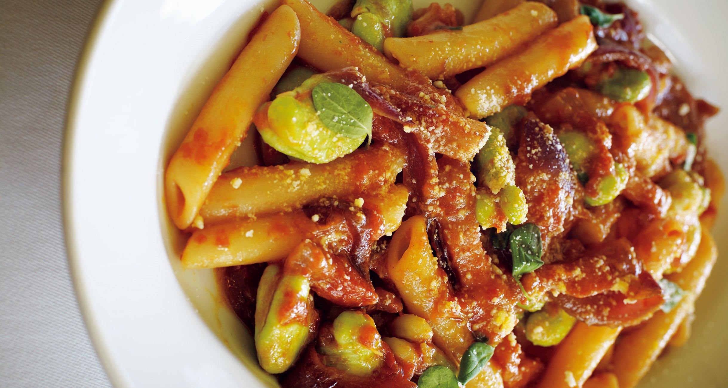 たとえ取り除いたとしても、グアンチャーレの脂の旨味は絶対に必要。赤玉ねぎの甘味を吸わせたそら豆が滋味深い。赤ワインのつまみに良さそうだ。