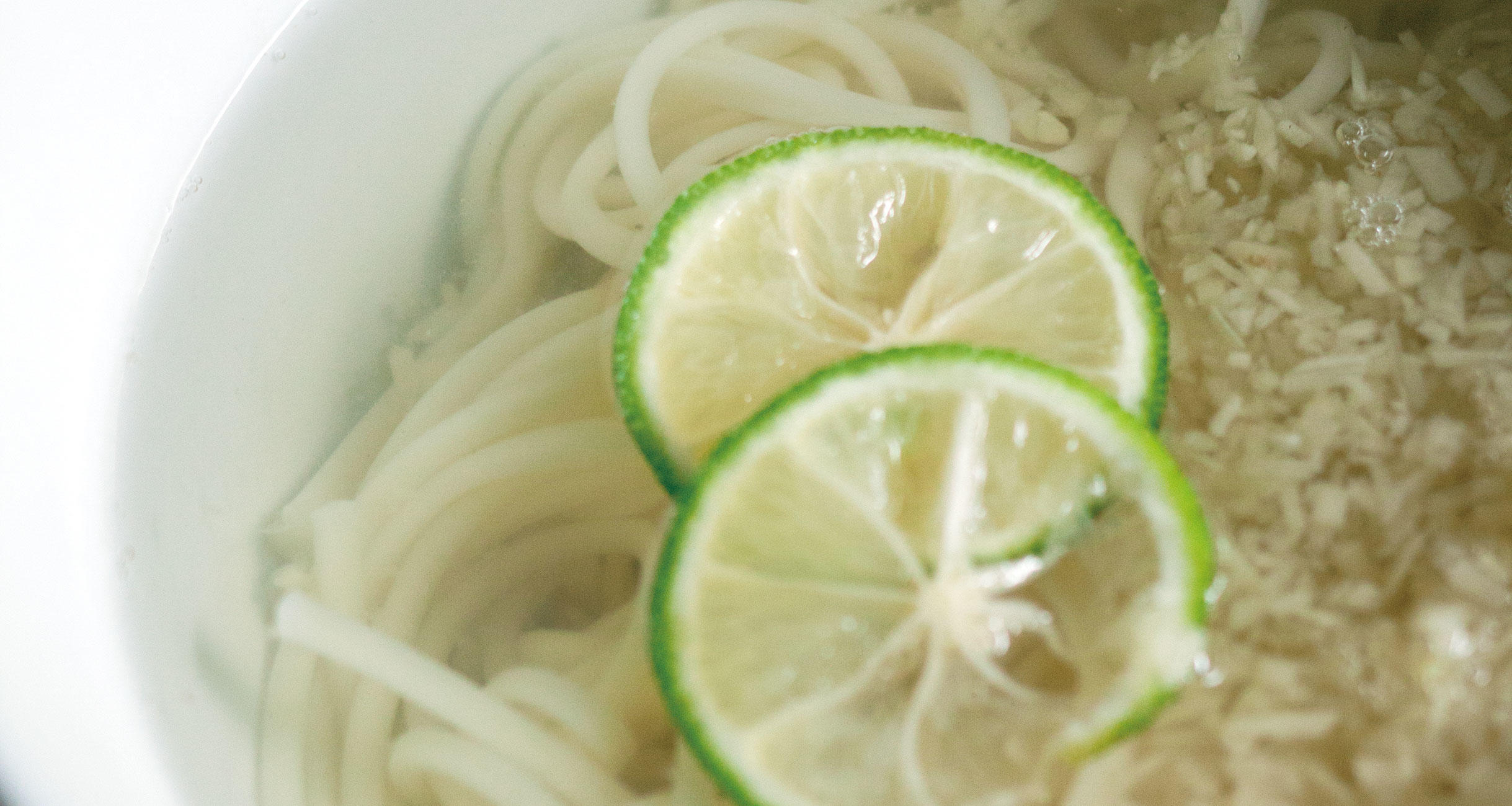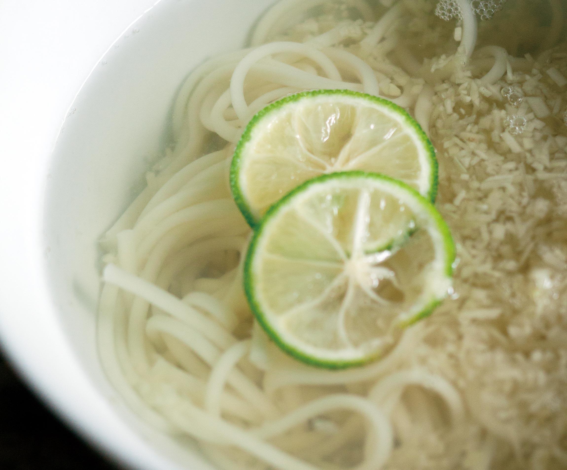 器に1を注ぎ、うどんを合わせる。仕上げにったぷりの生姜と青柚子をのせる。柑橘は、黄柚子やすだちなど、好みの柑橘類でよい。