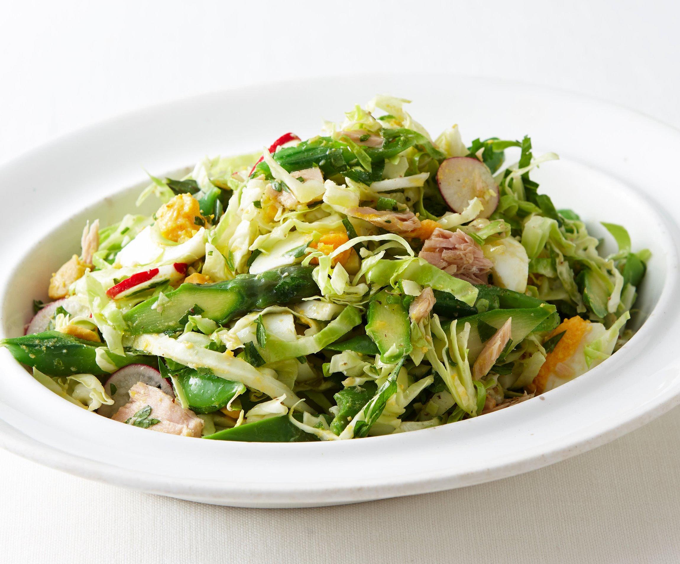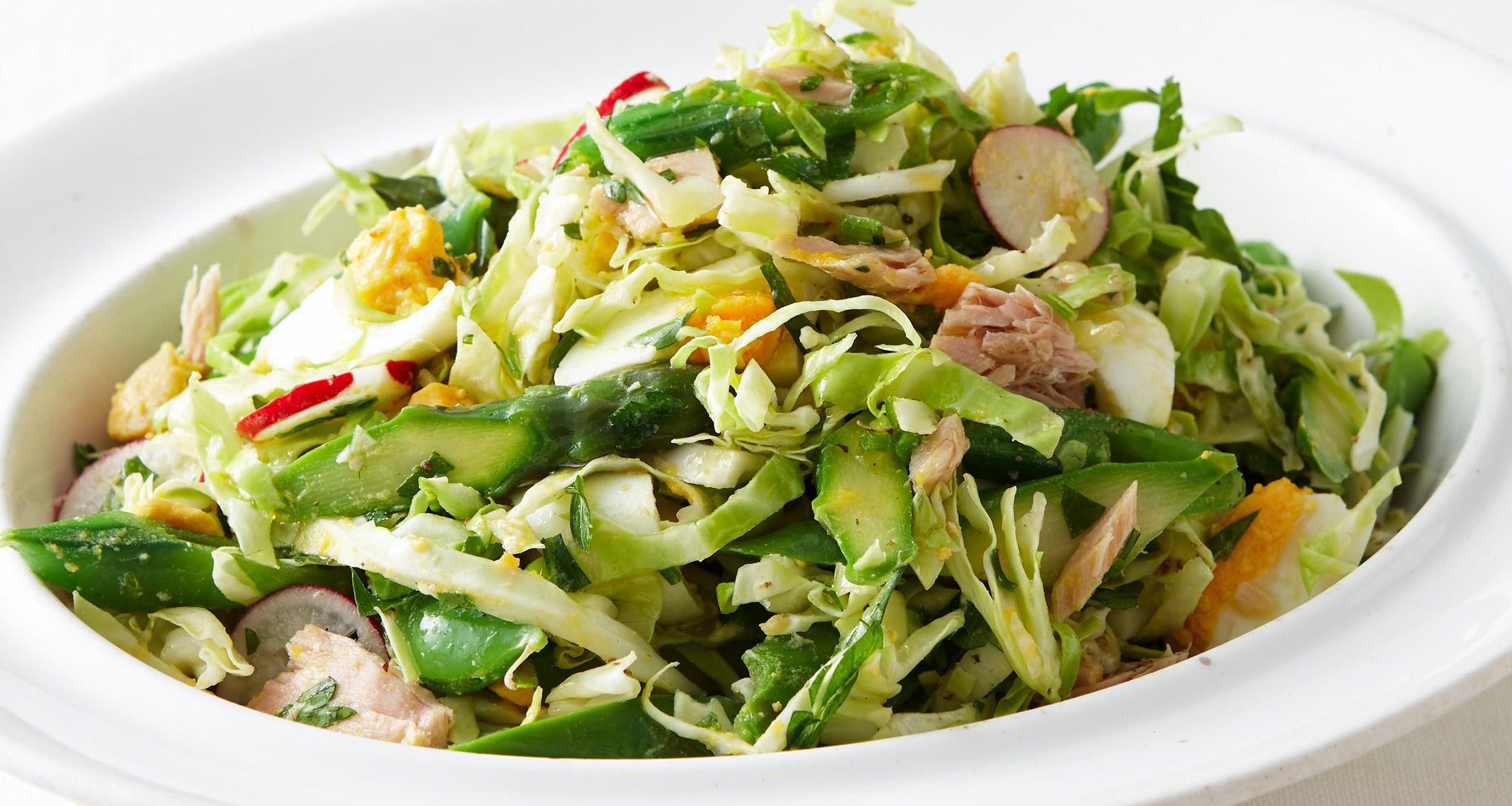 春キャベツは幅5㎜の太めのせん切りにし、ラディッシュはごく薄切りにして全部を合わせて冷水にさらし、シャキッとさせる。ツナは缶汁をかるく切り、ゆで卵は縦6等分に切る。