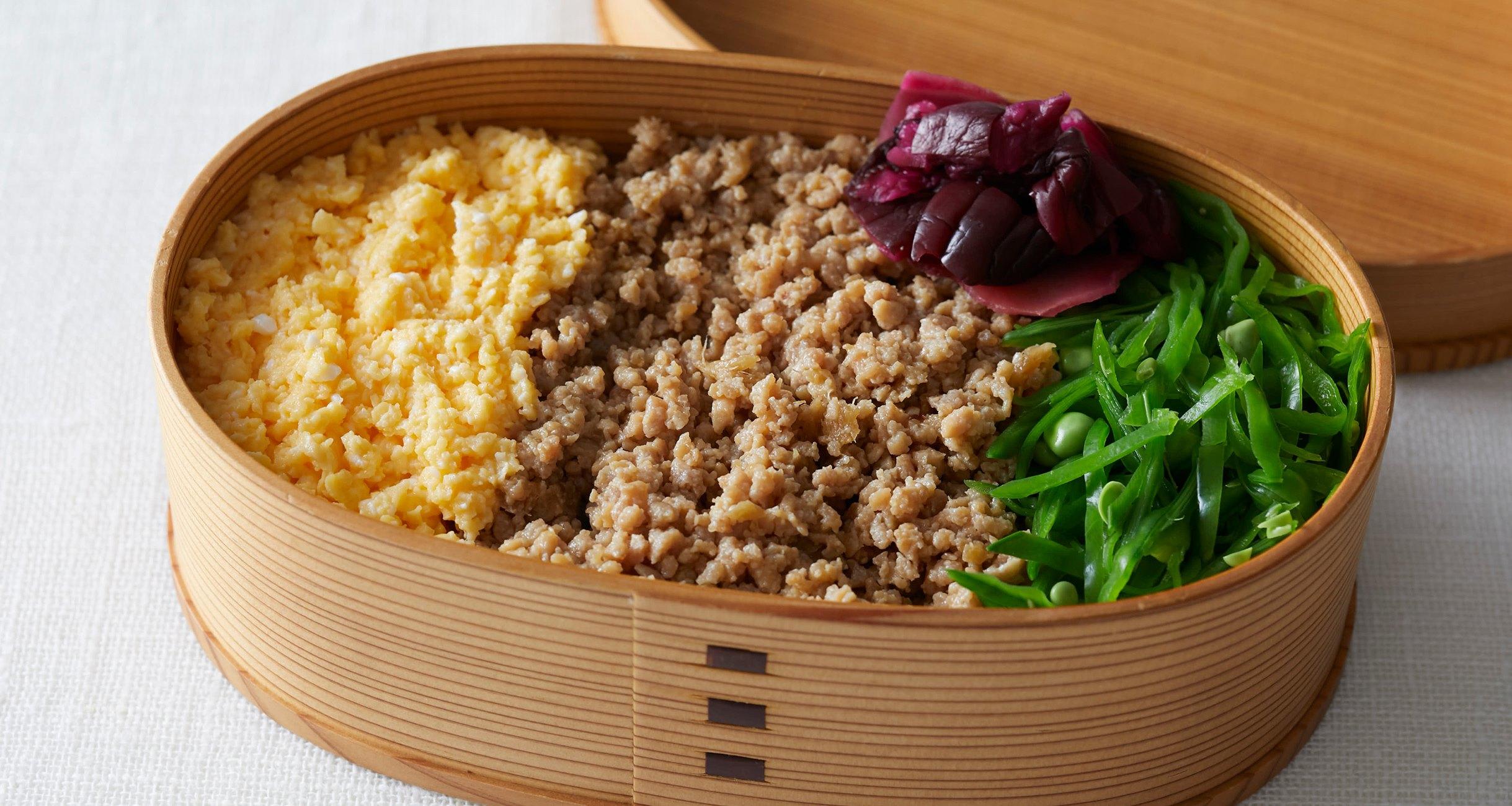 弁当箱にご飯を敷き詰め、鶏そぼろ、炒り卵、絹さやをのせる。しば漬けを添えて完成。