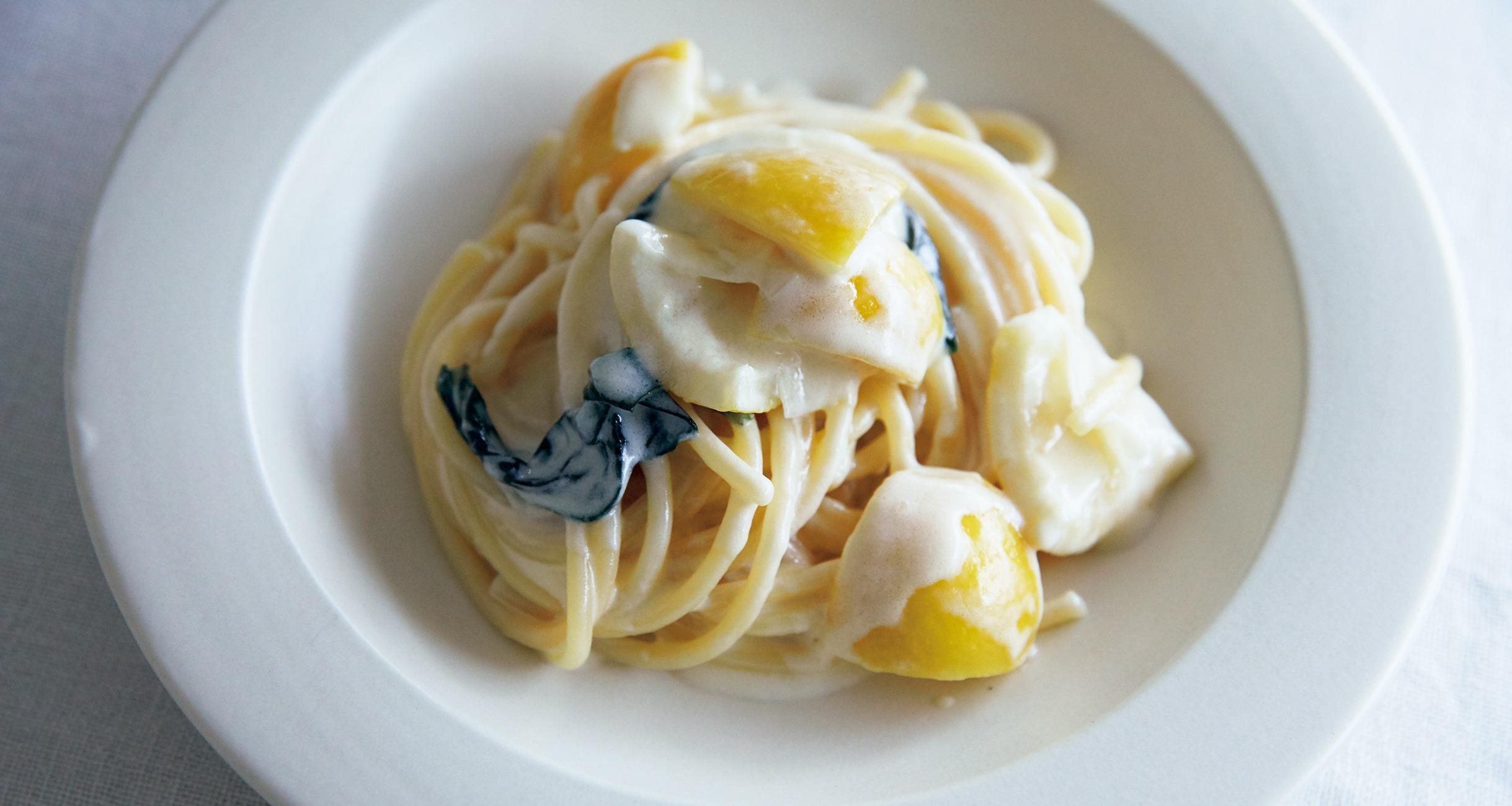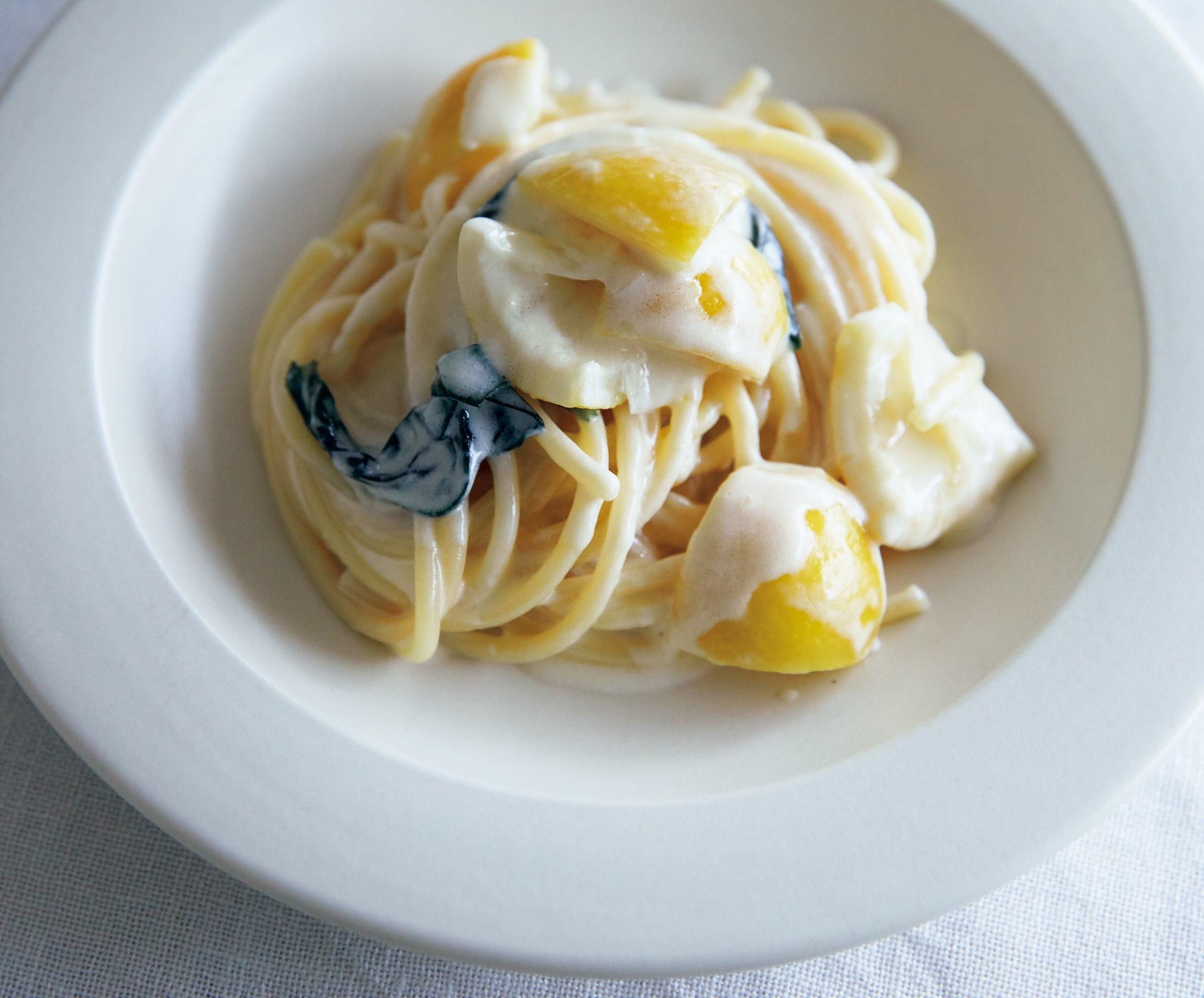 レモンを丸ごと生かすパスタです。レモンの風味を全体になじませるため、パスタのゆで汁に一口大に切ったレモンをそのまま入れると、レモンを練り込んだパスタみたいな味になりますよ。このゆで汁も美味しいです。小麦タンパクの旨味と、塩味とレモンの香り。ミネストローネに使ってもいいですね。南イタリアには、オイルとレモンとペペロンチーノでつくるレモンパスタがあります。これもさっぱりして美味しいのですが、今回はレモンと乳製品の相性が良いことを知っていただきたいので、生クリームとサワークリームを使ったクリームパスタにします。少し酸味があるほうが軽く仕上がるのでサワークリームがオススメです。ソースとパスタを和えるときは、パスタとともにゆでたレモンも入れ、ゆで汁を使って乳化させます。このパスタ、ちょっと冷めてもクリームチーズケーキみたいに美味しく食べられますよ。