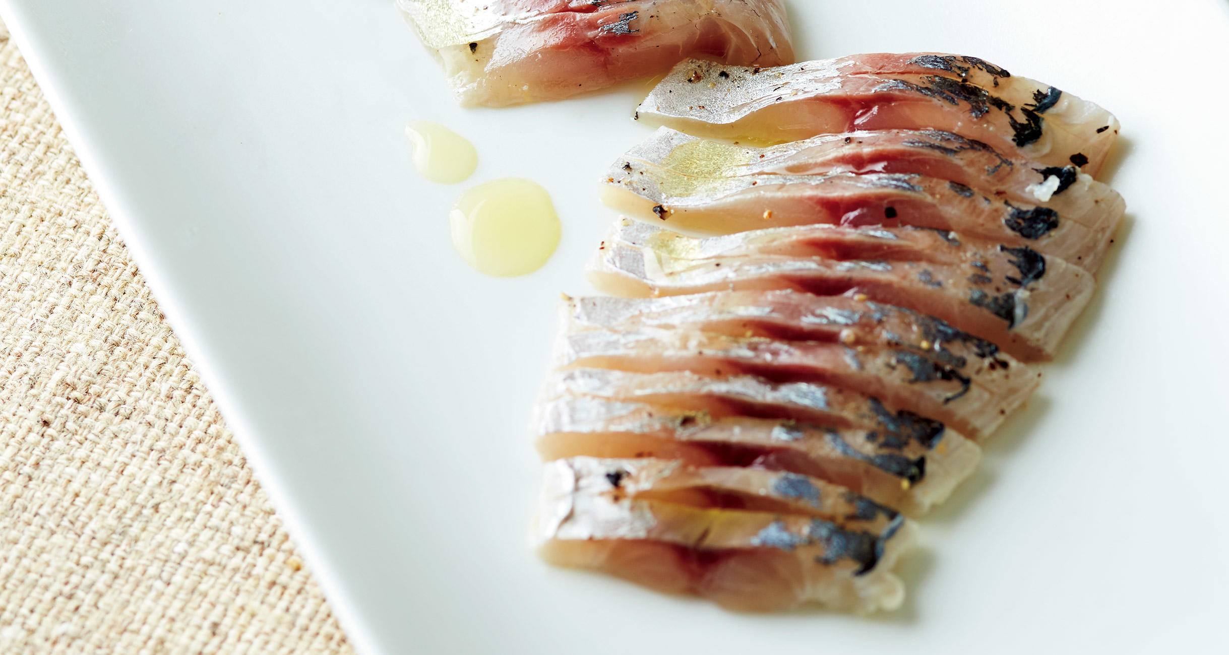 青魚と胡椒はそもそも相性がよく、魚の脂の旨味、酢の酸味、胡椒の香り。バラバラの特徴をまとめてくれるのが、オリーブオイル。胡椒をふってからオイルをかければマイルドに、胡椒が後だとスパイシーに感じる。順序が変わるだけで、魚の味も驚くほど変わります。