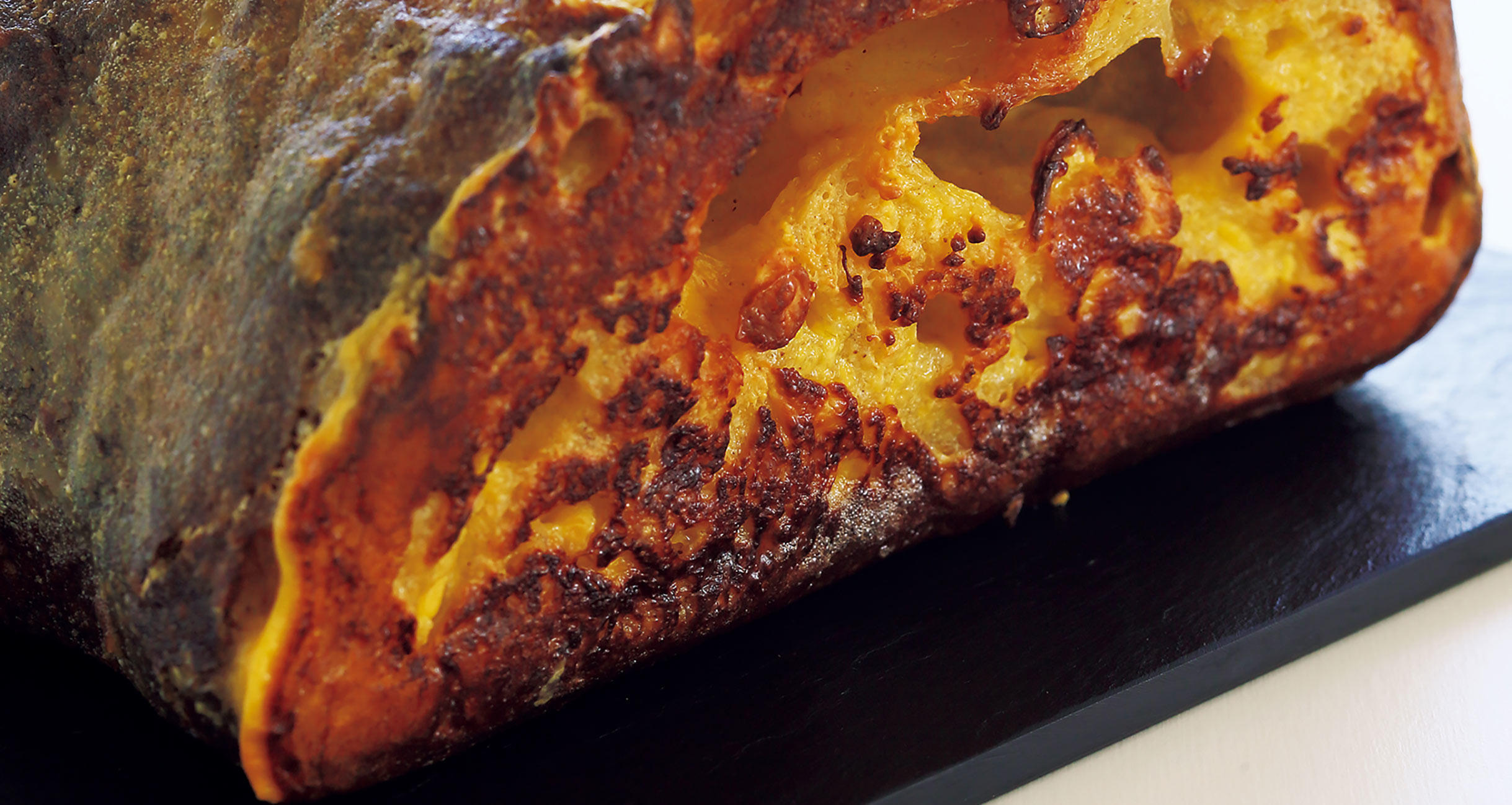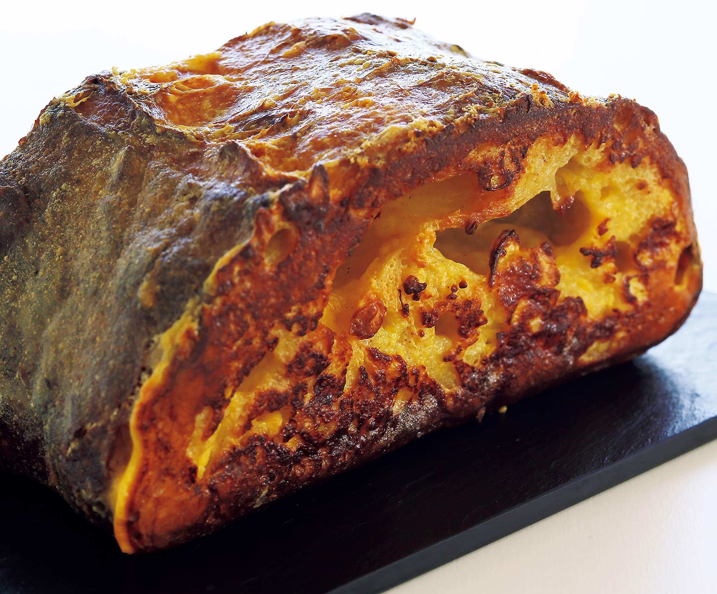 香ばしいパンの塊をカットすると、気泡部分にしっとりとした卵が入っている。しっとり、ほわっと、やわらかなおいしさ。「パンの空洞にスクランブルエッグが入っているようなイメージです。パンは必ず気泡が大きなものを選んでください」と狐野さん。
