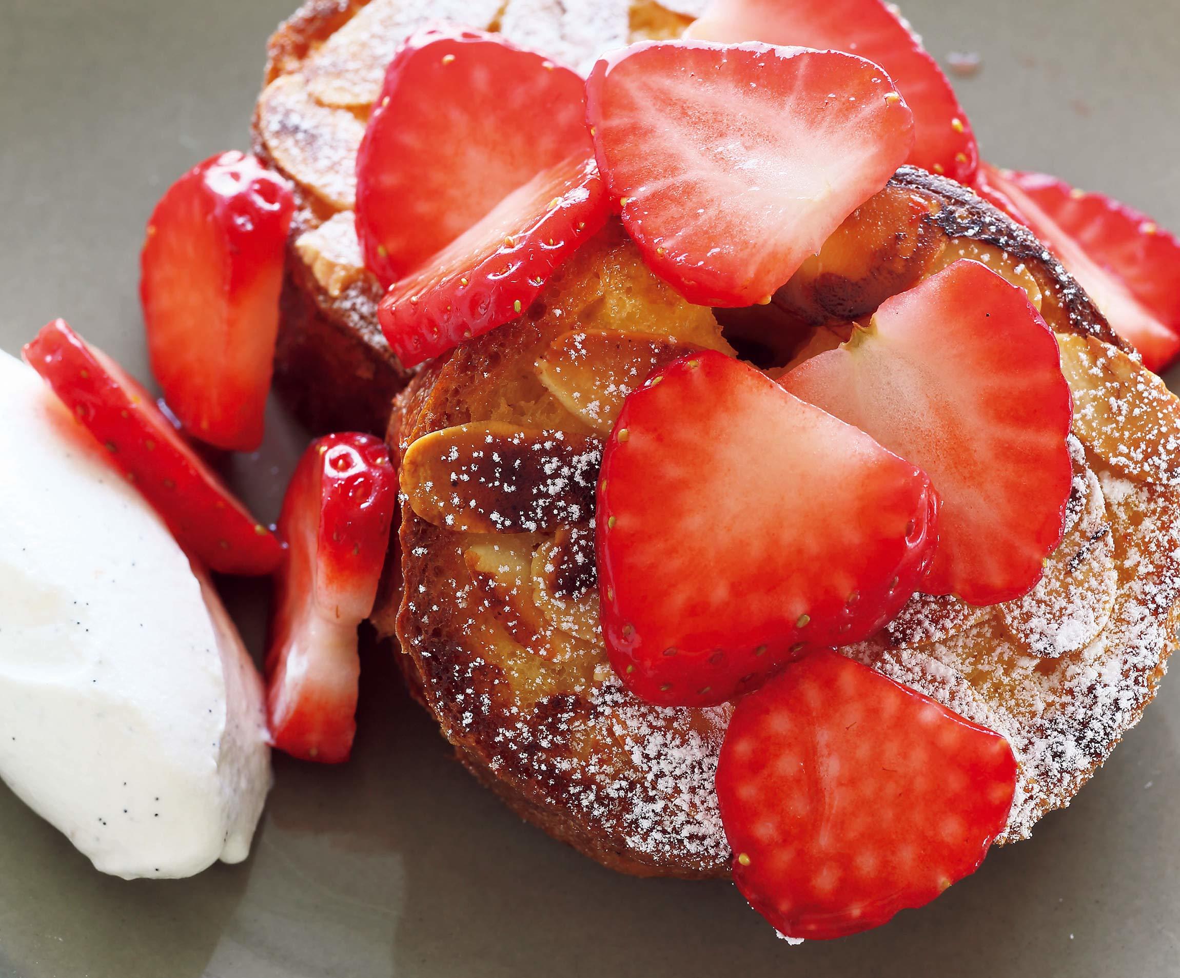 「パリのビストロでデザートとして人気があるんですよ」と教えてくれたのは、ブリオッシュのデザートフレンチトースト。ブリオッシュにたっぷりの卵液を含ませるのだ。焼いてみればびっくり、プリンのようになめらかで口溶けのいい、新食感になるではないか。