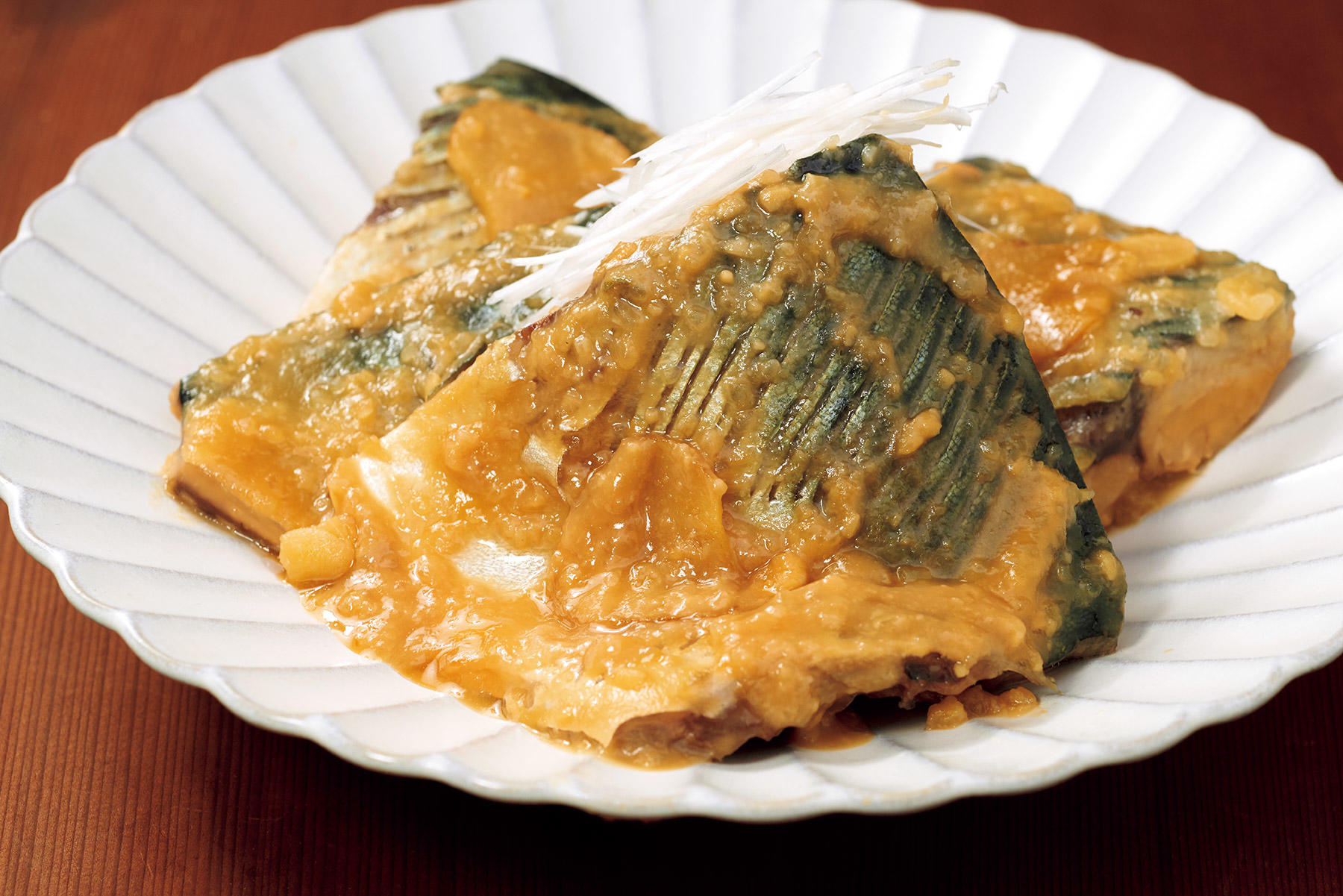 器に盛りつけ、好みで白髪ねぎを飾る。繊細な飾り包丁のおかげで、皮と身が一緒にほぐれ、こっくりした煮汁がからんで最高!