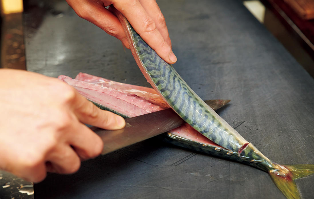 三枚おろしにしたサバは、先に胸ビレを除き、腹骨をそぎ取って、骨抜きで小骨を抜いておく。皮目に3~4mm幅の飾り包丁を斜めに入れ、半身をそれぞれ2等分する。