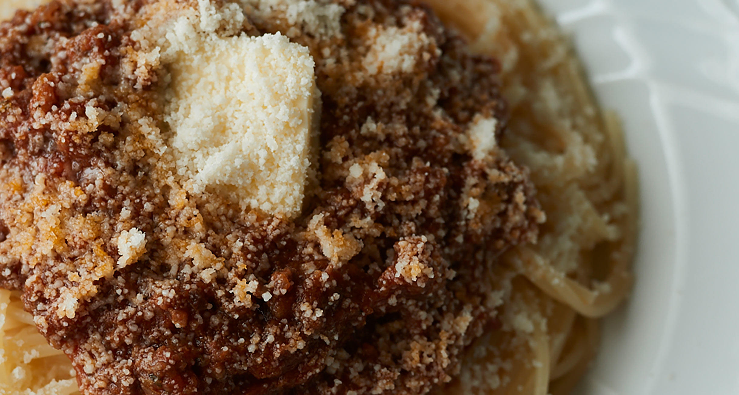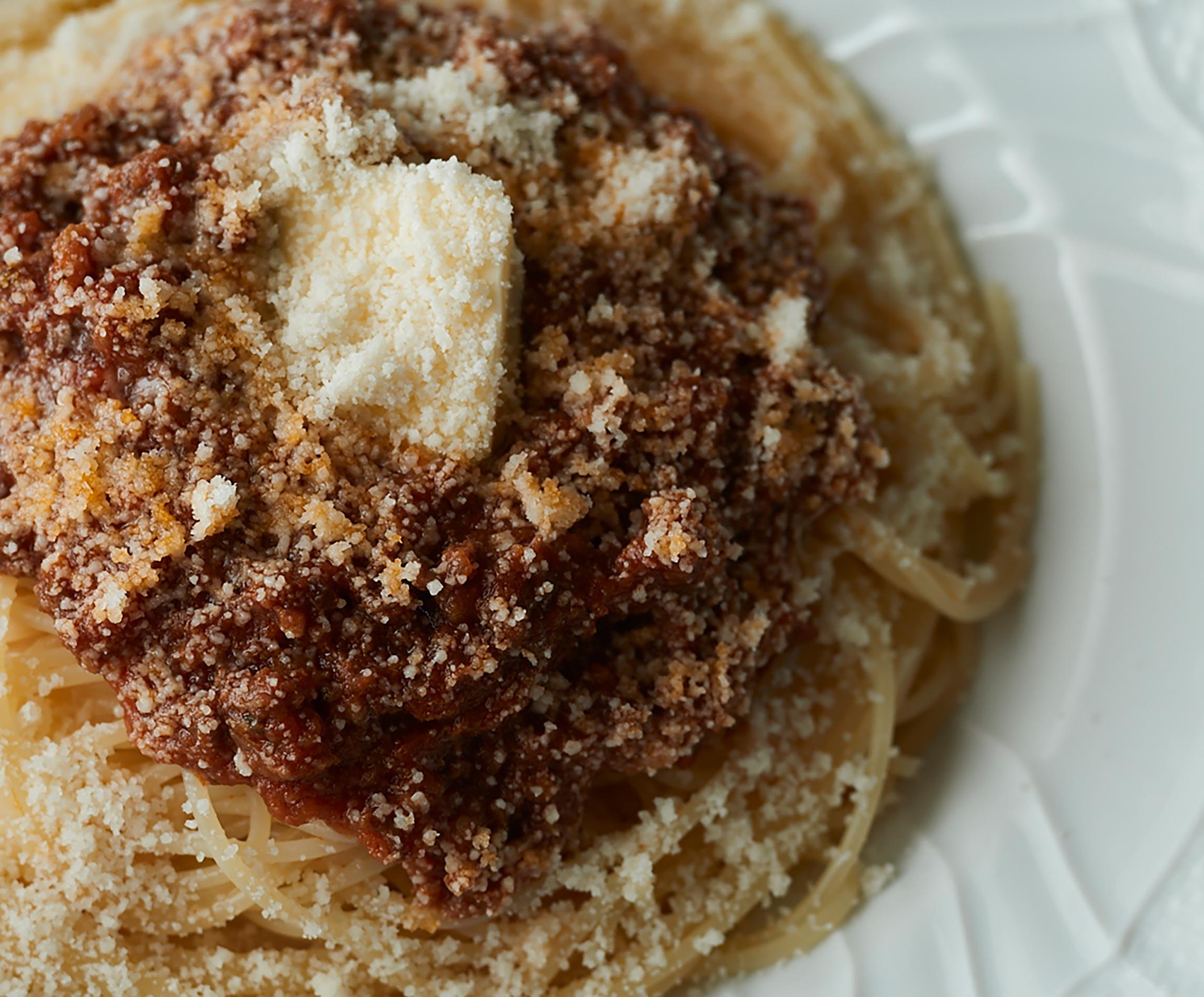 ゆで上がったパスタを器に盛り、熱々のミートソースをかけ、仕上げにバター、パルメザンチーズを好みの量のせる。