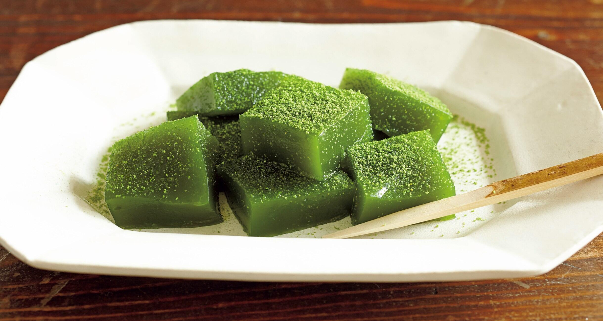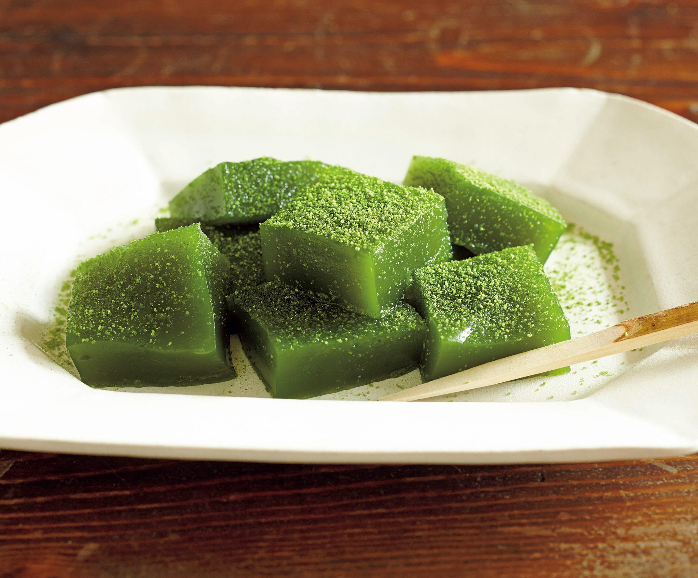 強烈な緑色が、この季節によく合う抹茶のわらび餅です。なんとも言えない“ぷるん”とした食感が、喉に気持ちいい。仕上げの抹茶きな粉の香りが、後からグングン効いてきます。