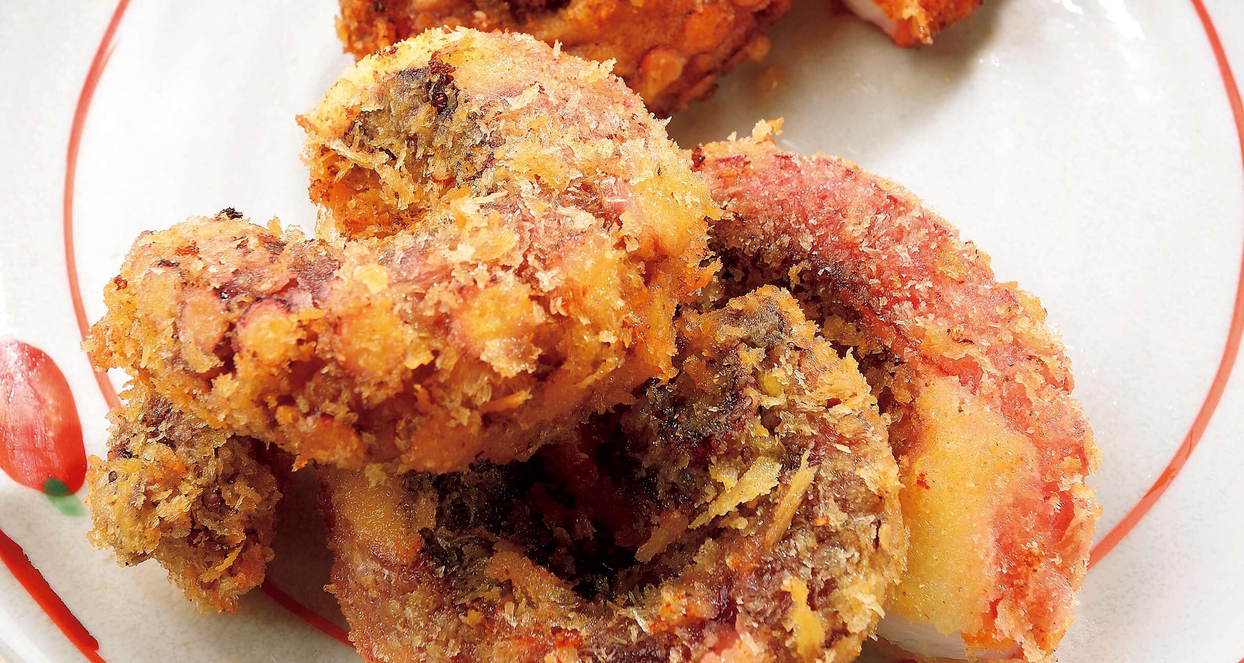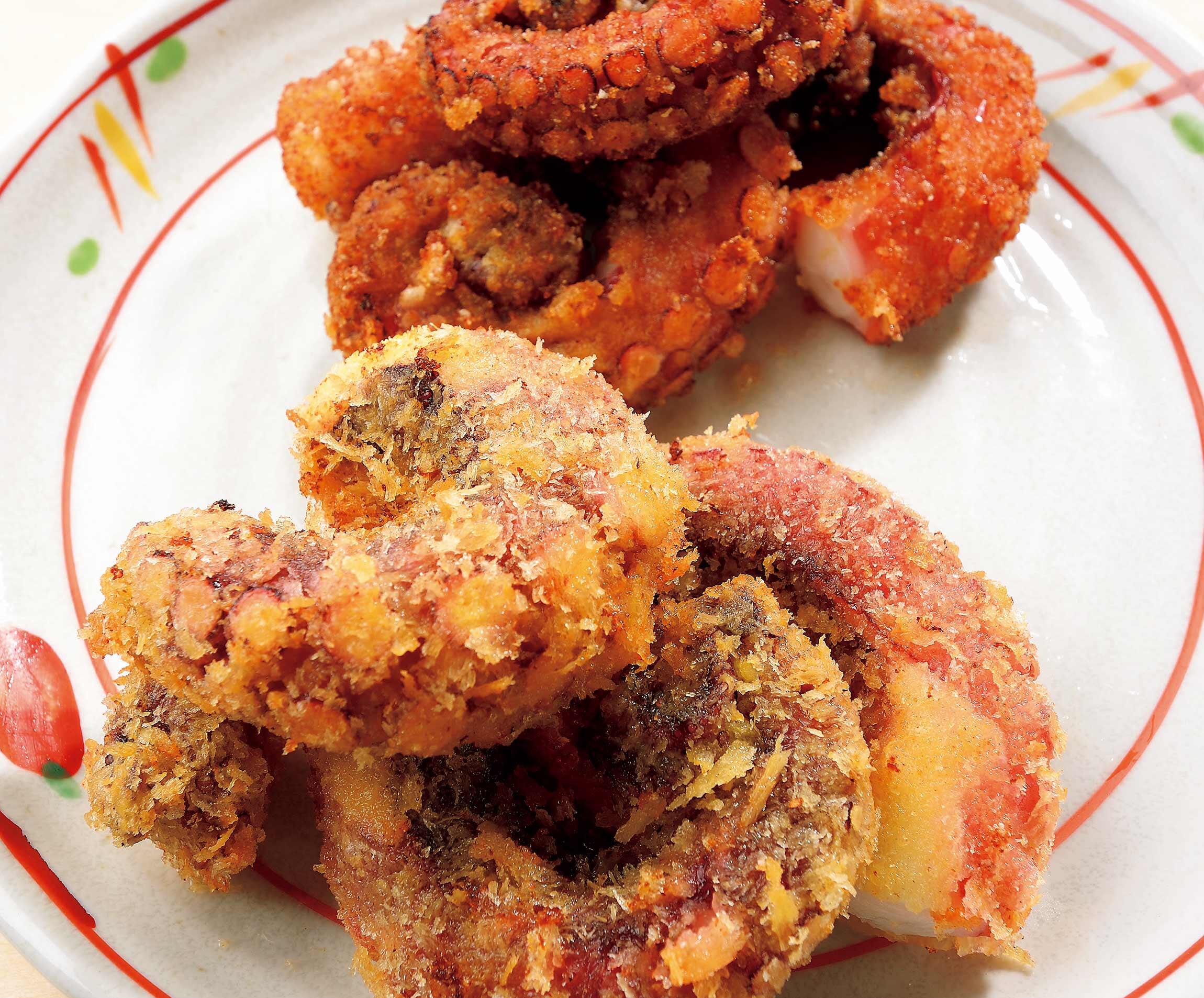 半分は牛乳入り衣で軽やかに揚げ、もう半分は歌舞伎揚を砕いた物を衣に使用します。歌舞伎揚を使ったものはちょっとジャンクな味わいで、ビールが進む一品になります。