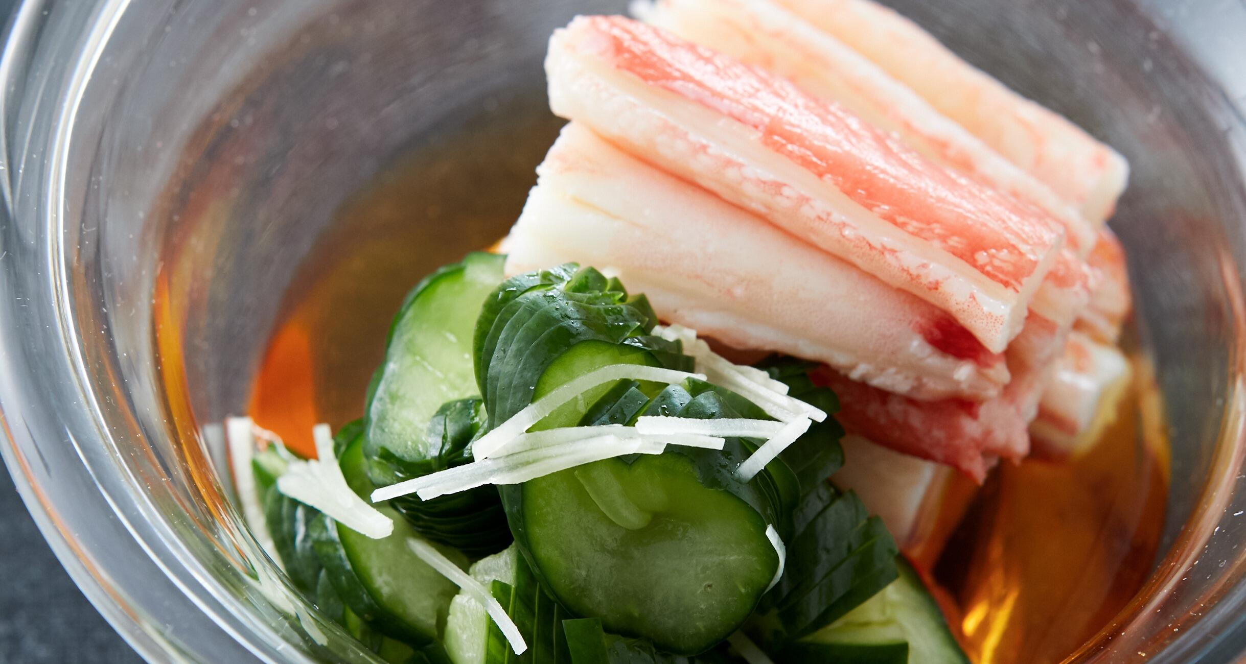 酢の物の定番。混ぜるのではなく盛り分けると料亭風になるのでお薦めです。ほぐした蟹なら全体に和えて盛りつけても良いです。