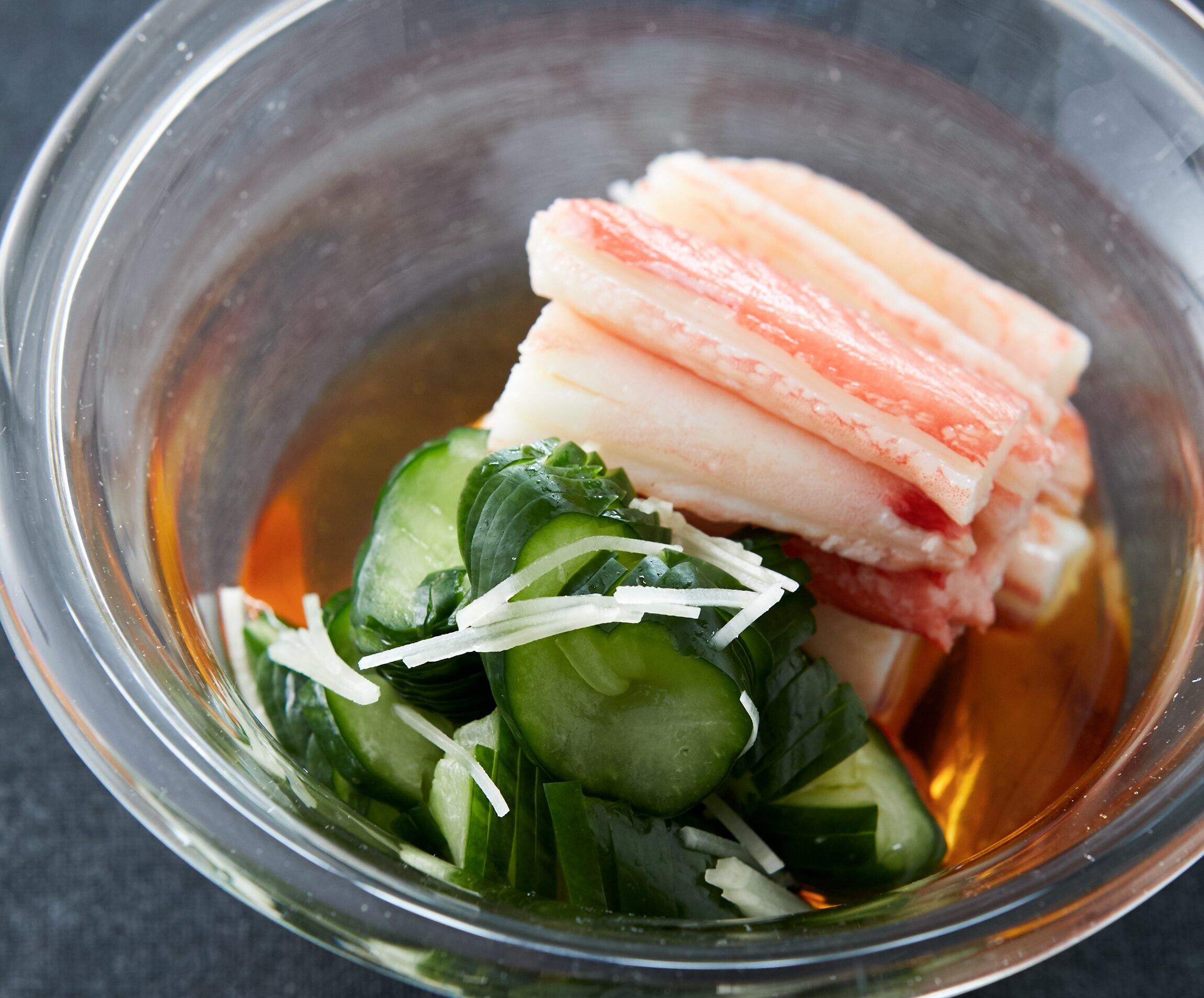 器に蟹、蛇腹きゅうりを盛り、三杯酢をかけ、生姜を散らす。