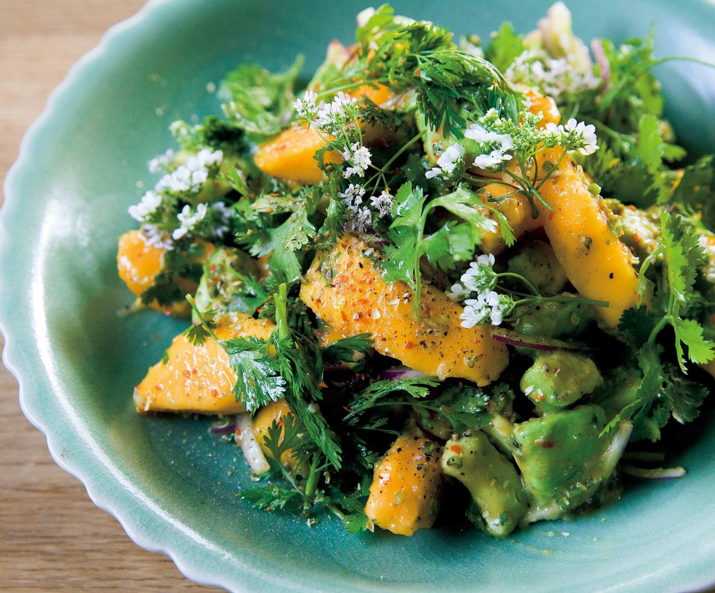 水気をしっかりきった赤玉ねぎを加えてひと混ぜし、オリーブオイルとスパイス類を入れ、軽く塩、胡椒をして、よく混ぜ合わせる。レモンの酸味で酸っぱくして食べるサラダなので、味をみて、好みでさらにレモン汁を加え、塩、胡椒で味を調える。最後にパクチーの葉とあれば花も加え、さっくり混ぜたら完成。