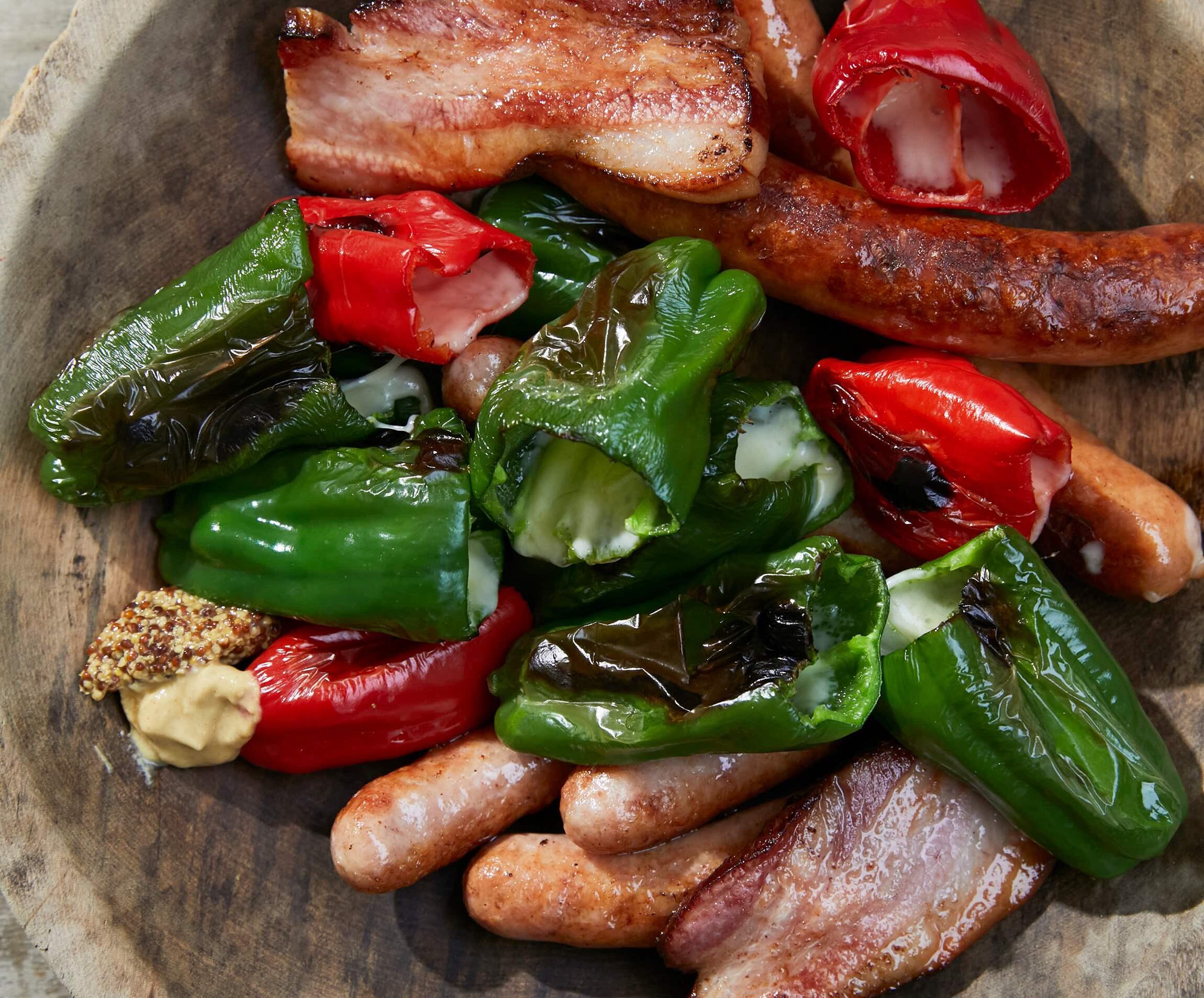 ベーコン、ソーセージも同様に香ばしく焼く。ピーマンとともに器に盛り合わせ、好みで粒マスタード、フレンチマスタードを添える。