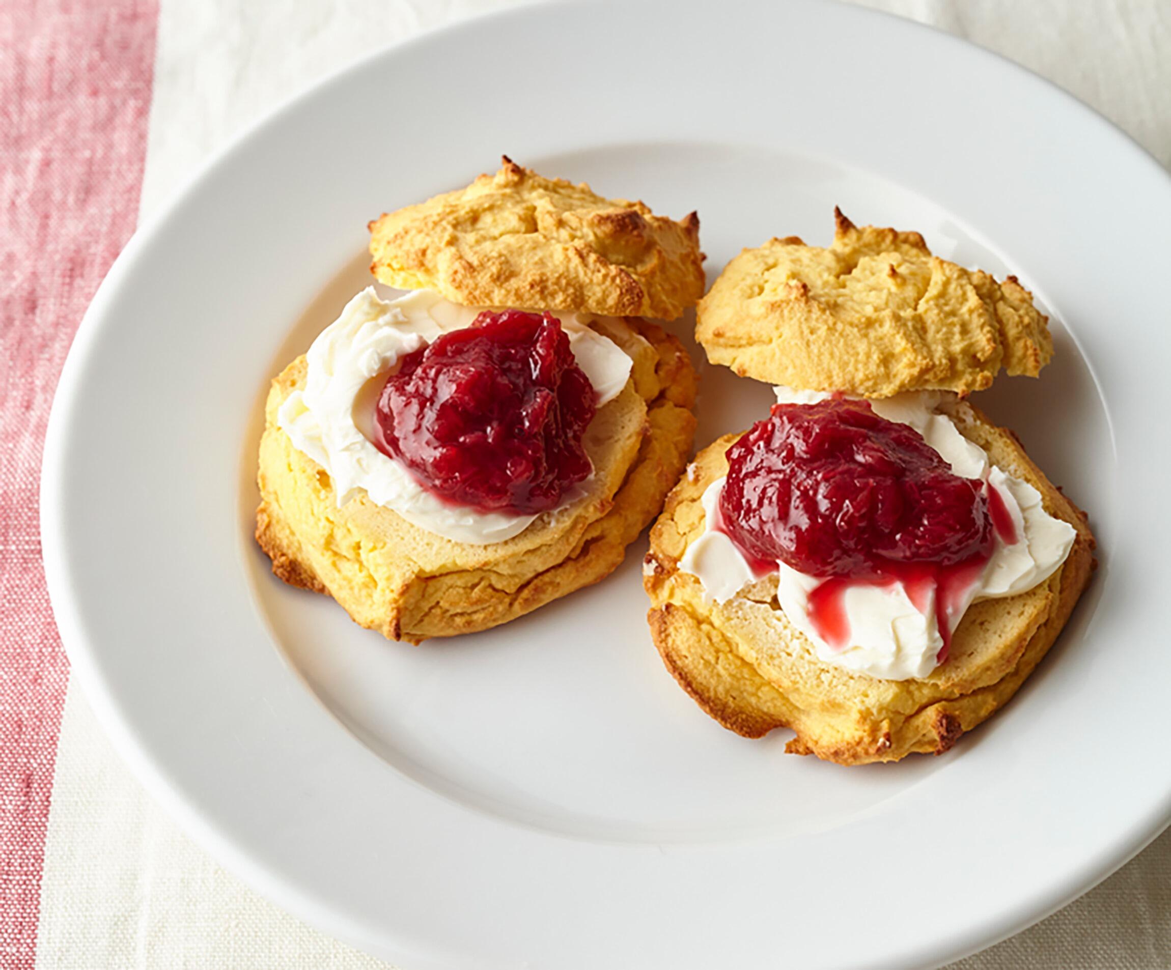 スコーンを横半分に切ってクリームチーズを塗り、ルバーブジャムをのせる。