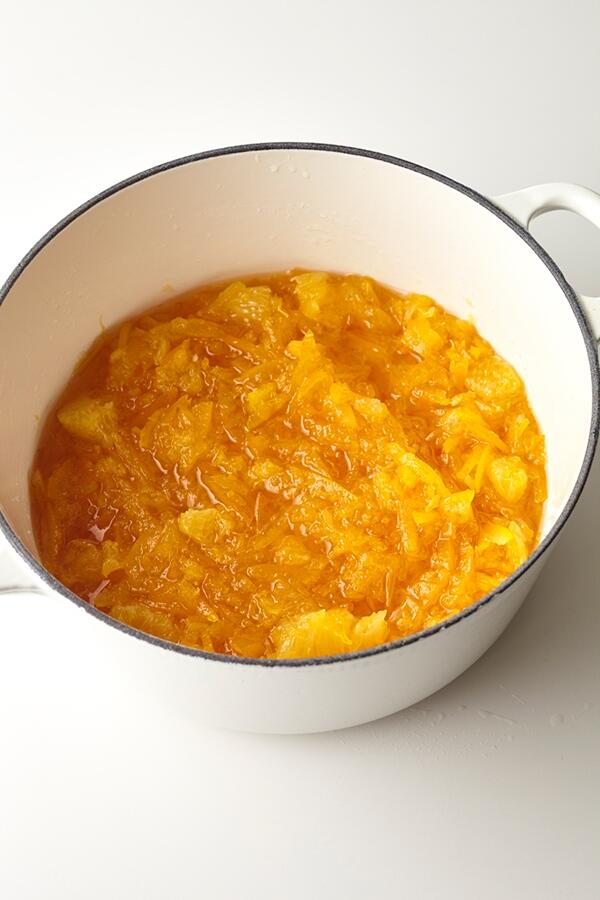 果肉は小房に分け、袋の上の口を細く切り落とす。袋の曲線に合わせて包丁を入れて、袋をそぎ落とす。果肉の薄皮をむいて種を取る。苦味がある薄皮を取り除いて煮るとやさしい味に仕上がる。