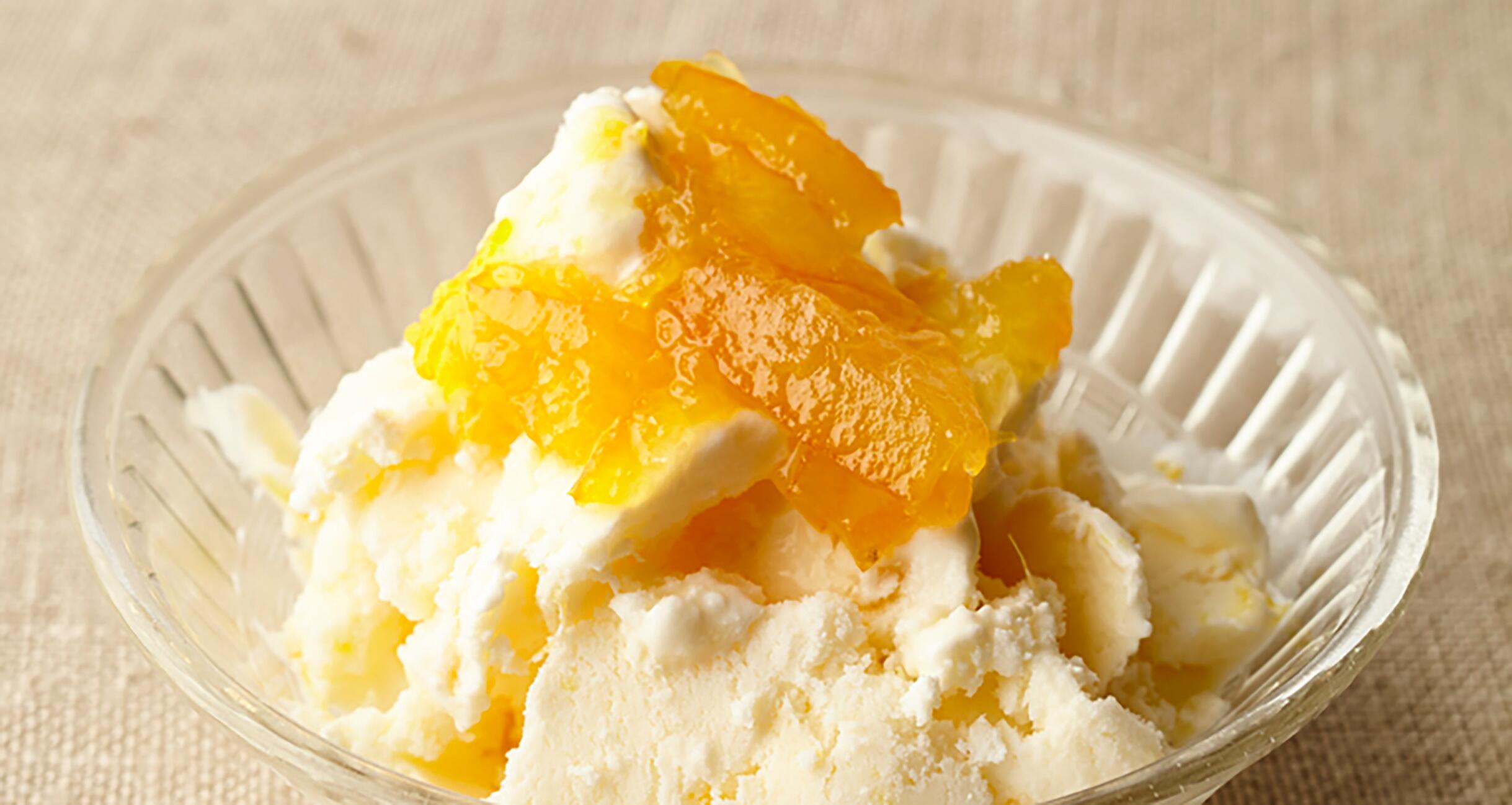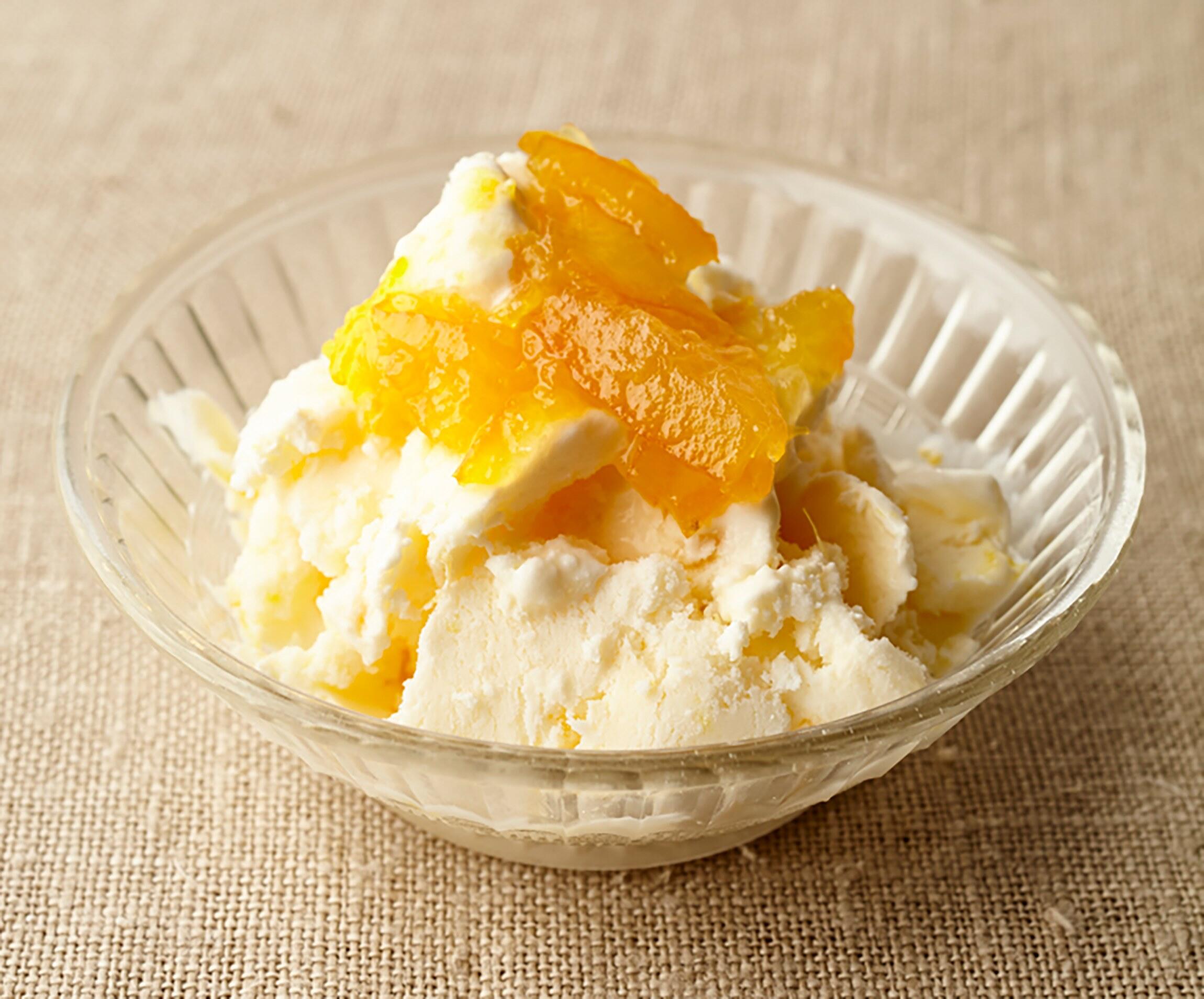 市販のバニラアイスクリームに同量のプレーンヨーグルトを混ぜて、爽やかで軽い味に。マーマレードの香りが口の中に広がります。
