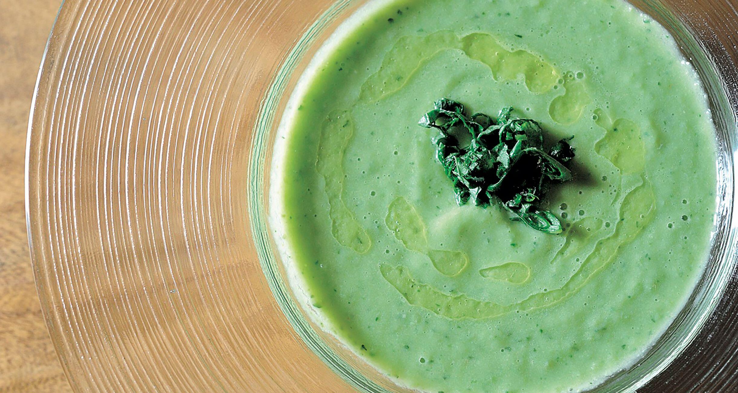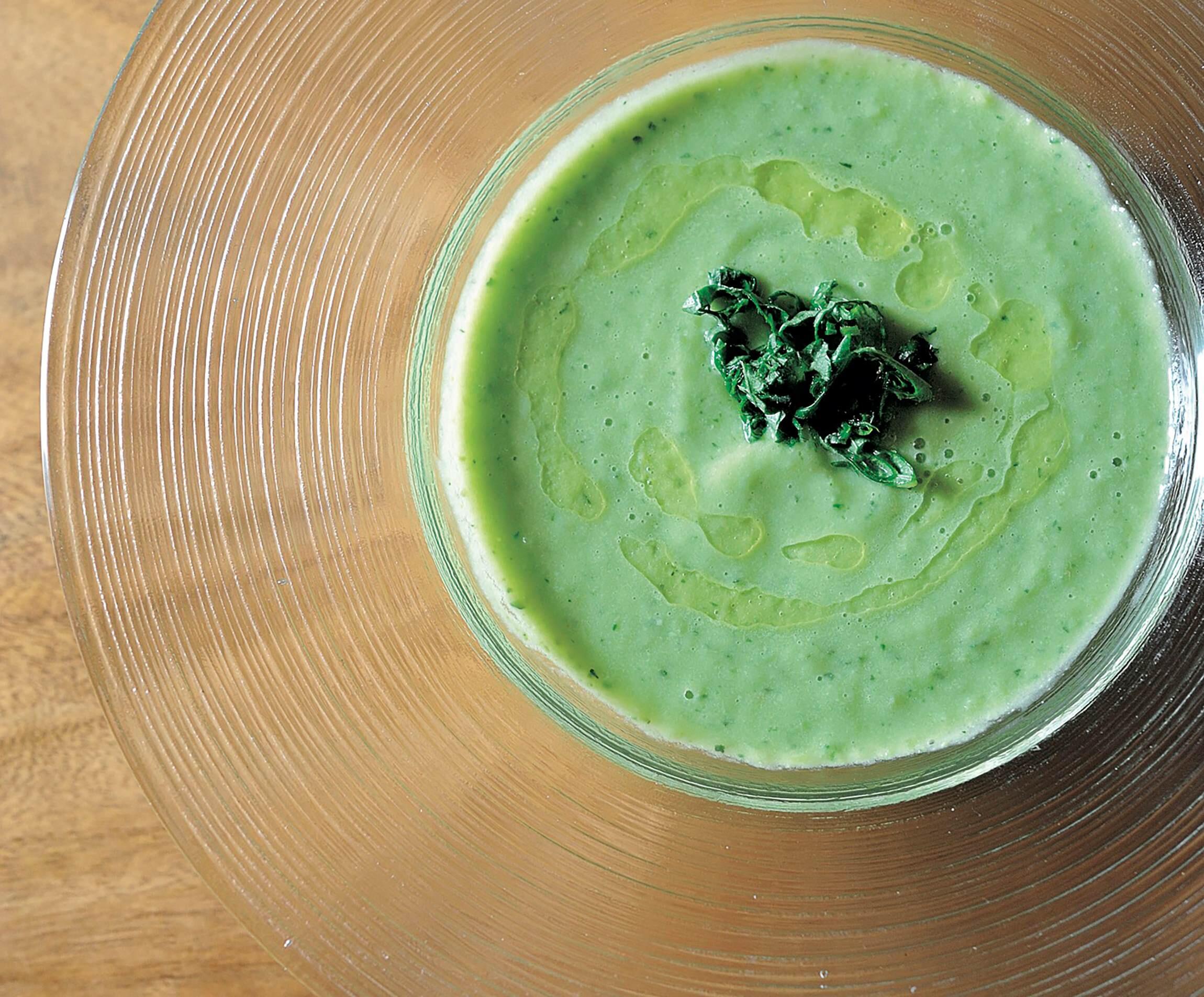 夏の最強スープ、ガスパチョのグリーンバージョンは、野菜を切ってミキサーで混ぜるだけと簡単なうえ、甘味、酸味、塩味、苦味、旨味がすべてバランスよく、しその香りも爽やか。今夏の定番料理にどうぞ。
