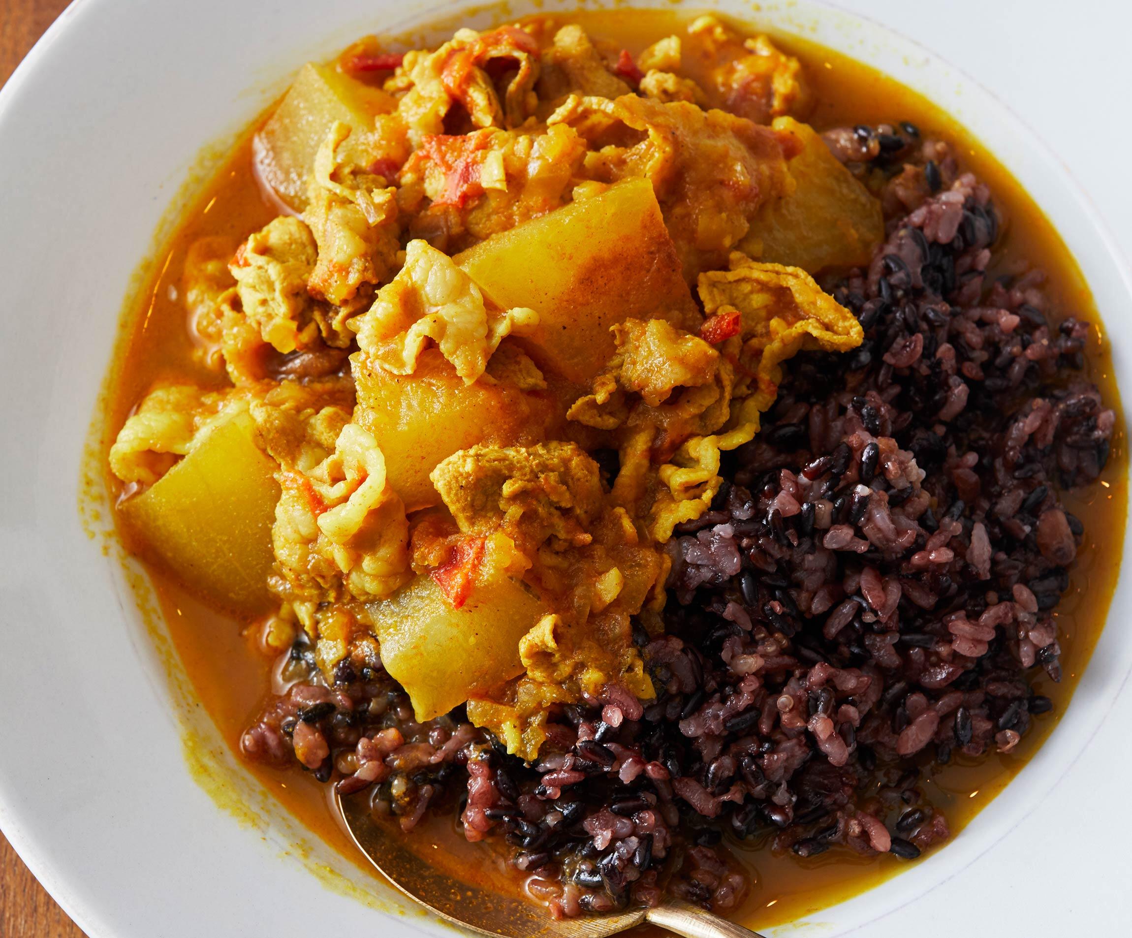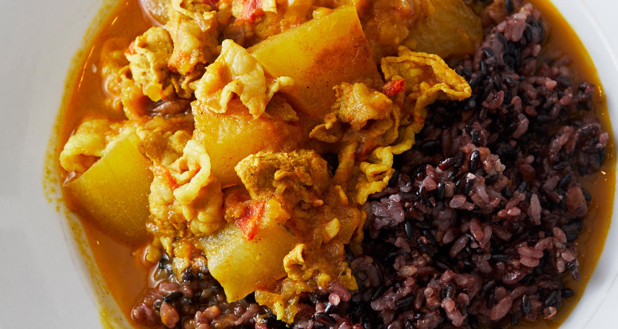 だし汁でつくる醤油風味の和風カレー。かくし味の梅干しがいい味わい。