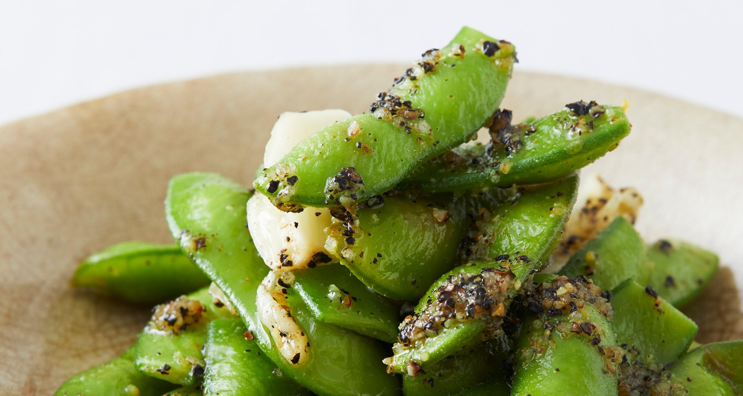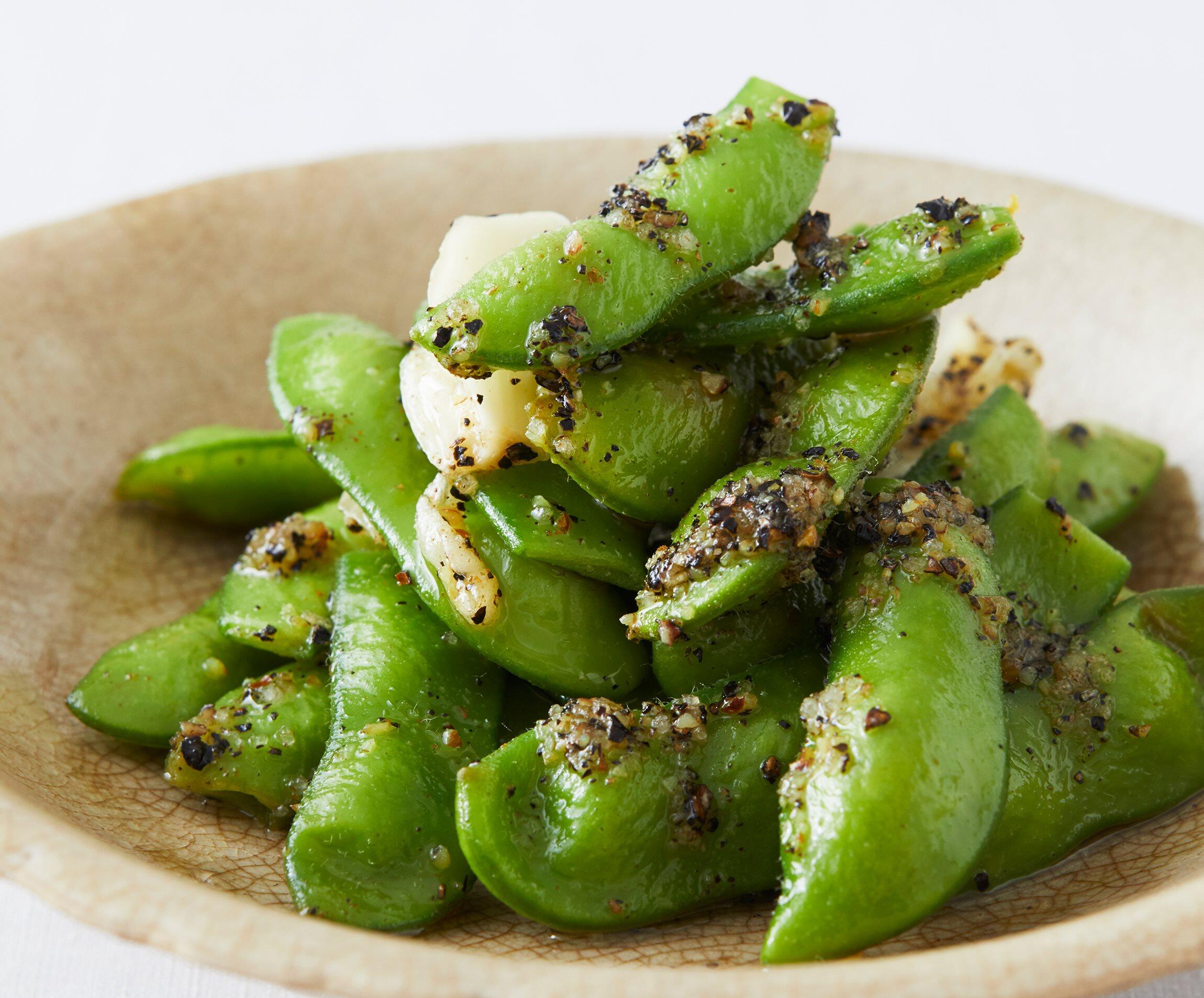 ゆでたての枝豆を入れて和え、さらに黒胡椒をふって和えてなじませる。