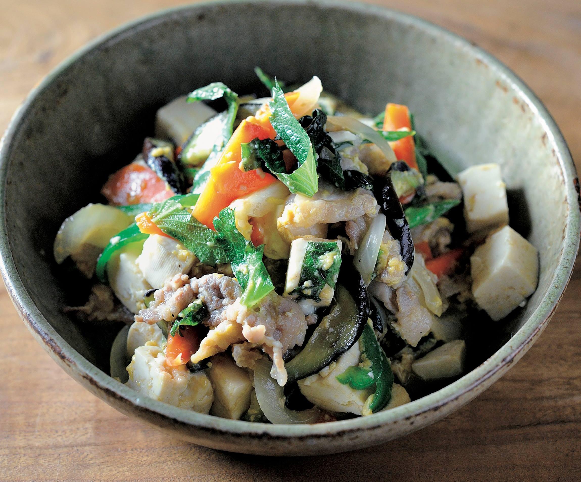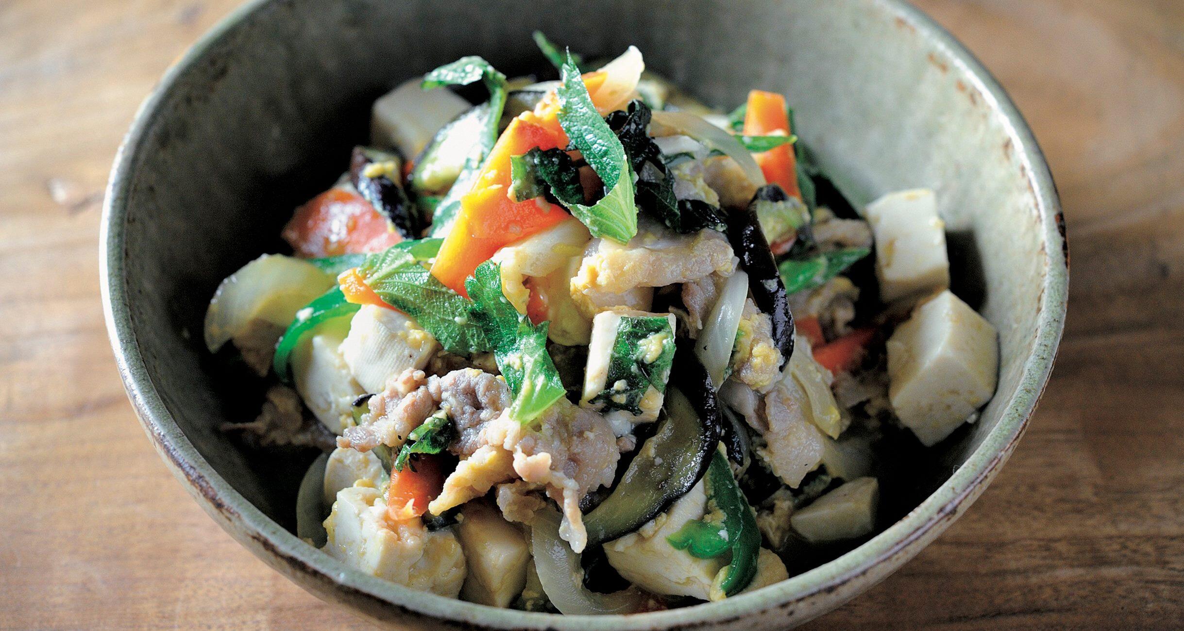 チャンプルーは、やさしく穏やかな味わいにしその香りがアクセントに。味つけは塩麹と淡口醤油、酒のみ。シンプルで穏やかな味わいを、しその香りと苦味が引き締める。