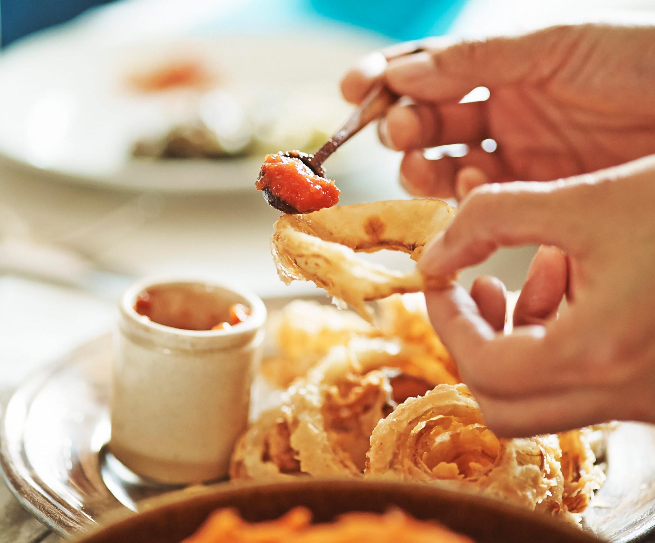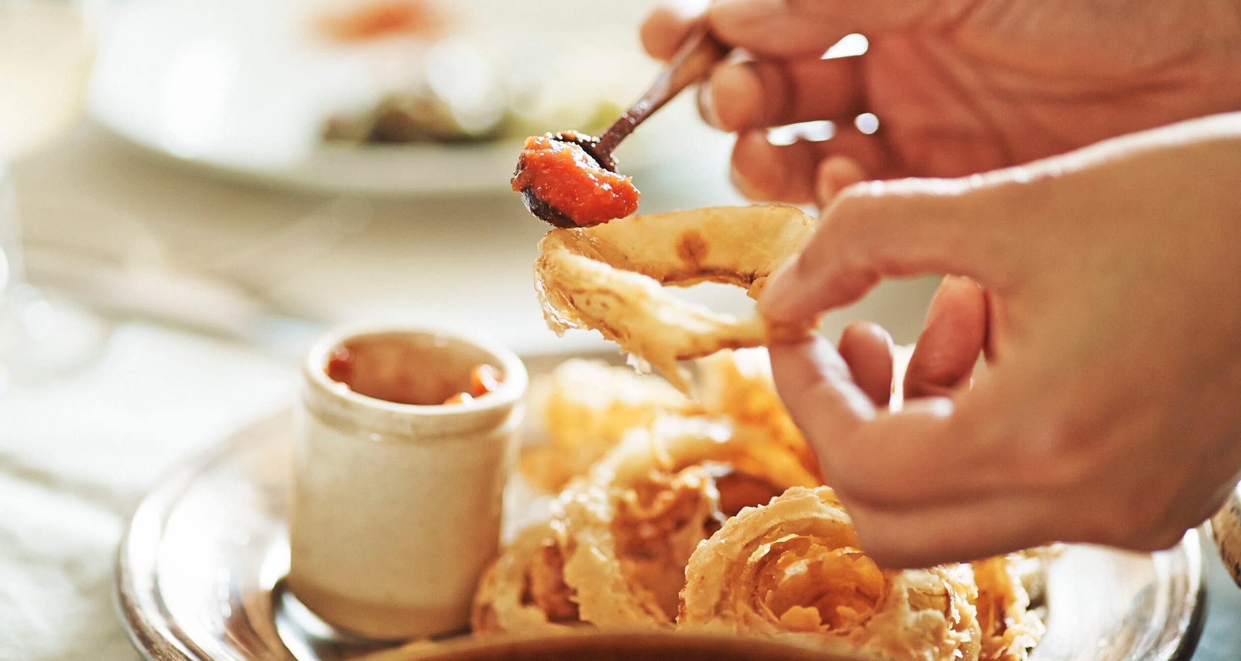 玉ねぎをレモン汁と牛乳に漬けてしっかりと水分を出すことで、ガリッとした衣に。時間がたってもクリスピーな食感が続くのも魅力。「アメリカ人になった気分でおおらかに、少しアバウトにつくるとよりおいしくなります」と坂田さん。