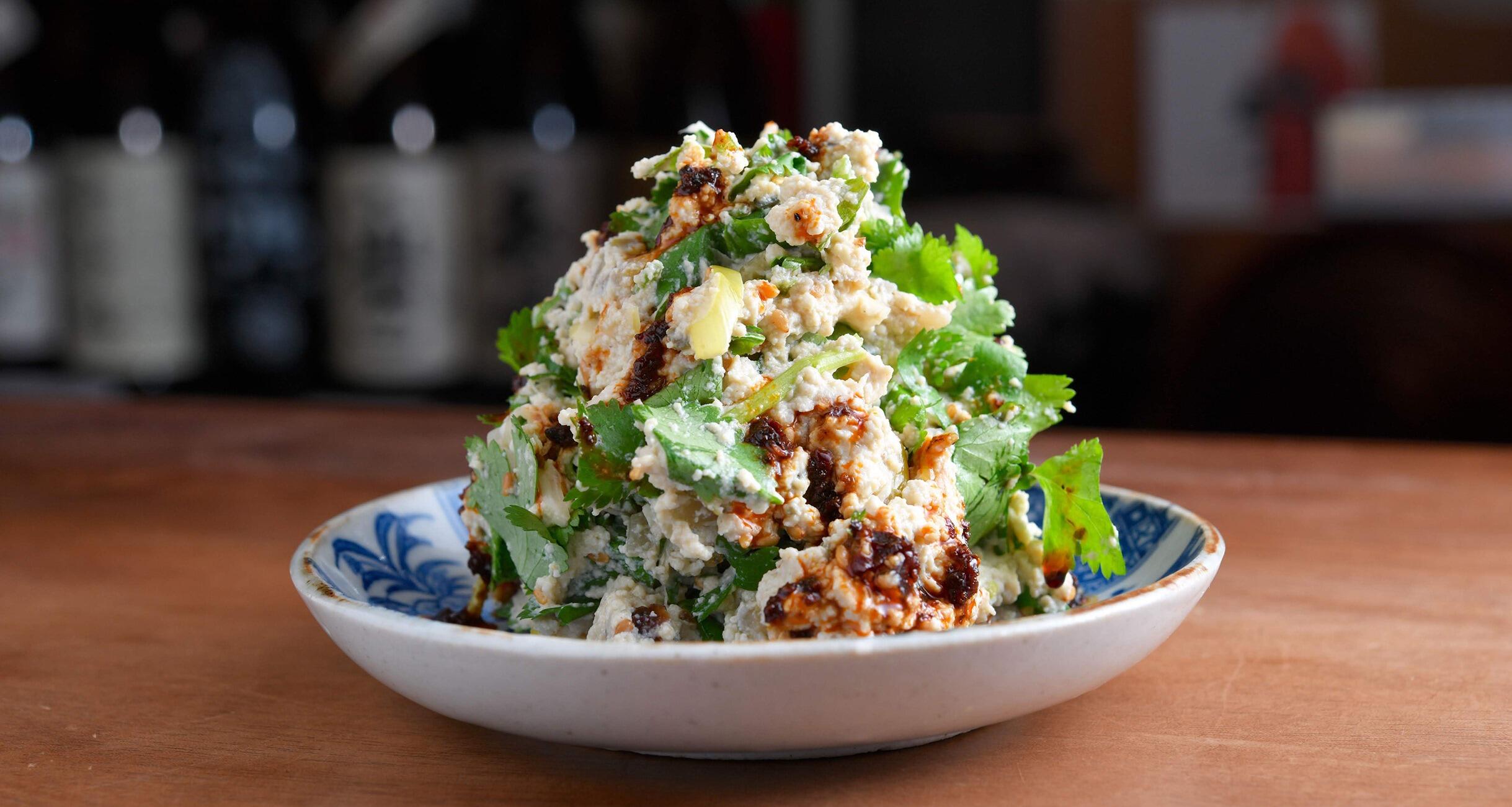 京都で大人気の居酒屋「ブランカ」に習ったのはパクチーの白和え。豆腐のまったりとした旨味とパクチーの香りが相まって、酒を呼ぶつまみになります。最後にかける辣油が、全体をシャープにまとめる秀逸な一皿です。