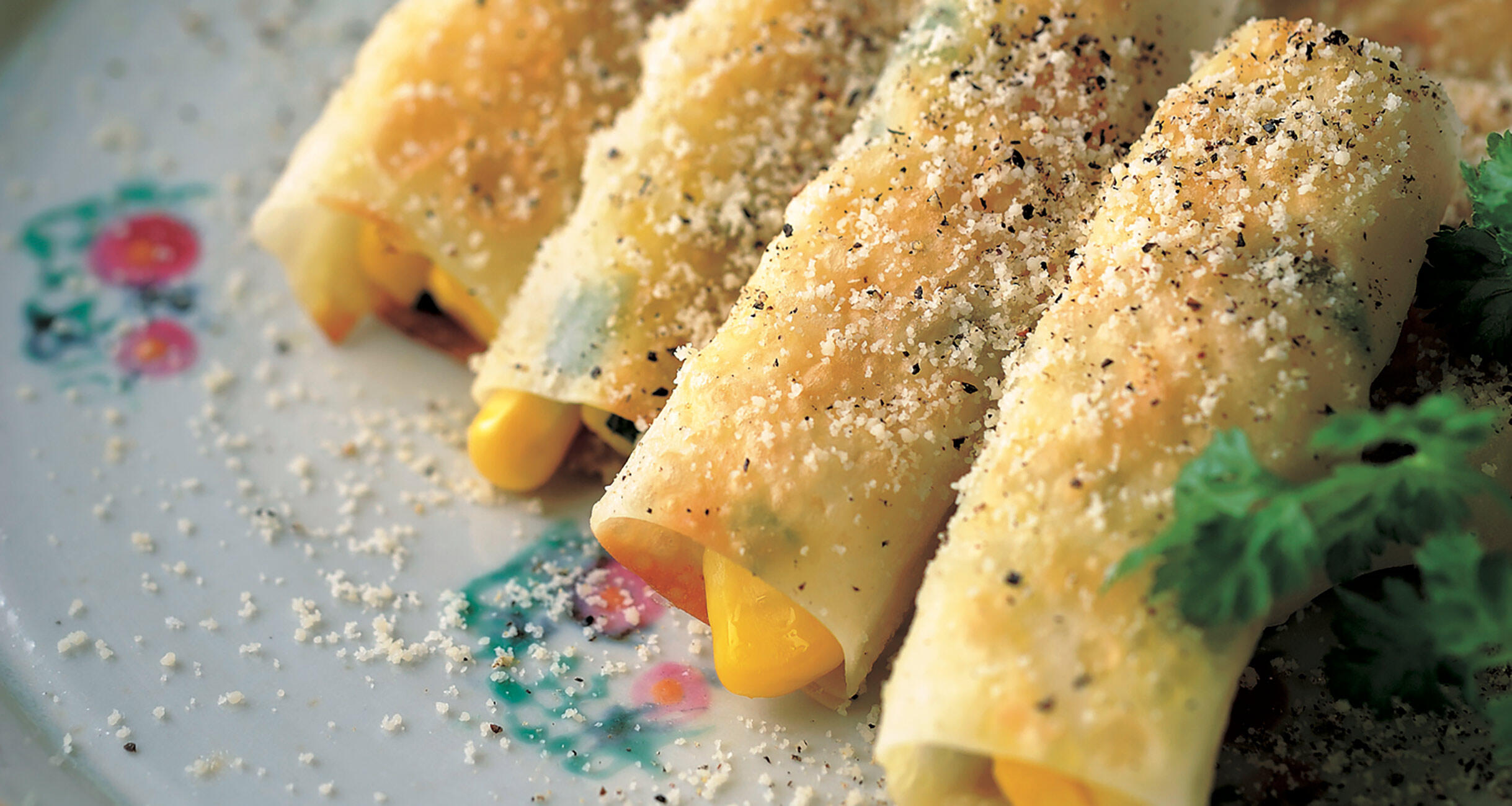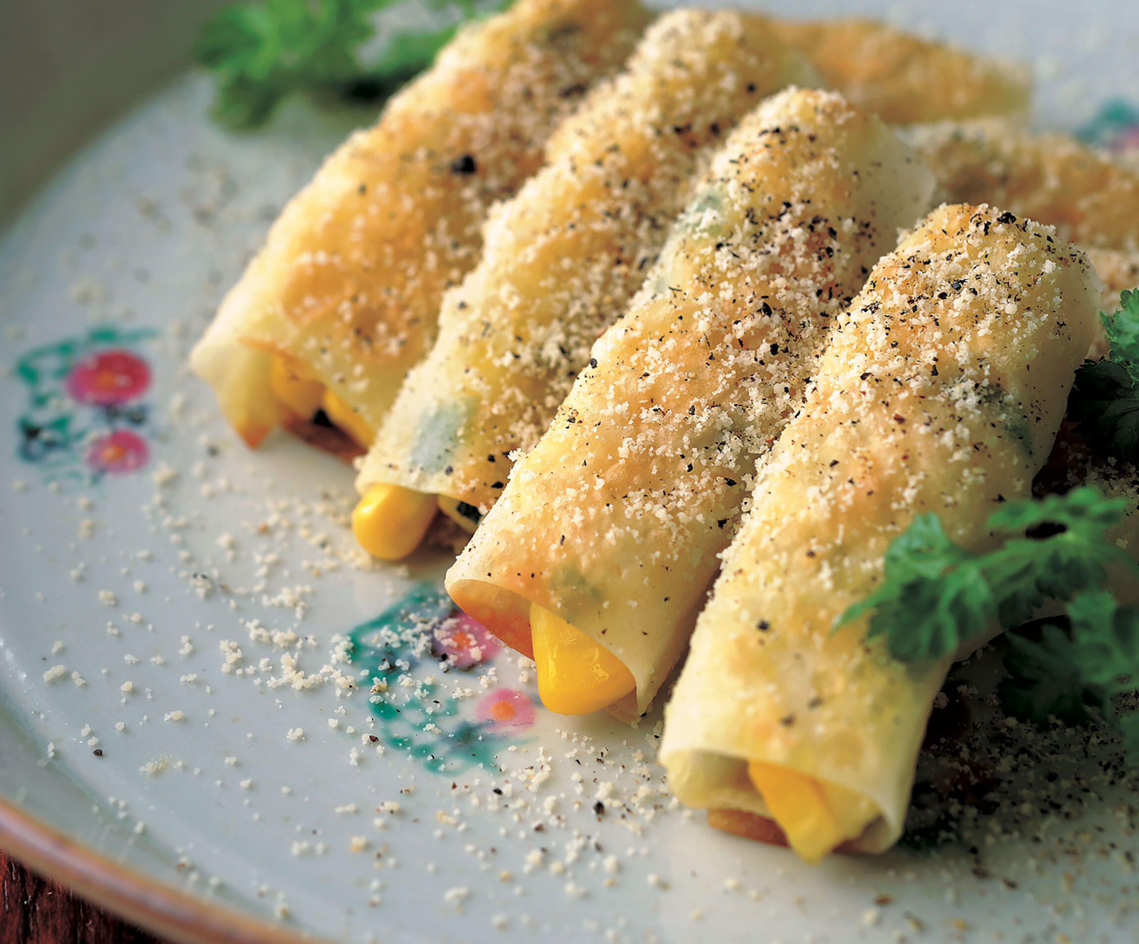 弾けるとうもろこし、パリパリと砕ける皮の香ばしさ、チーズの塩気と黒胡椒の辛味のハーモニー! ワンタンではなく、シュウマイの皮を使うことが、パリパリに仕上げるコツ。ラムのソーダ割りを合わせるのがお薦め!