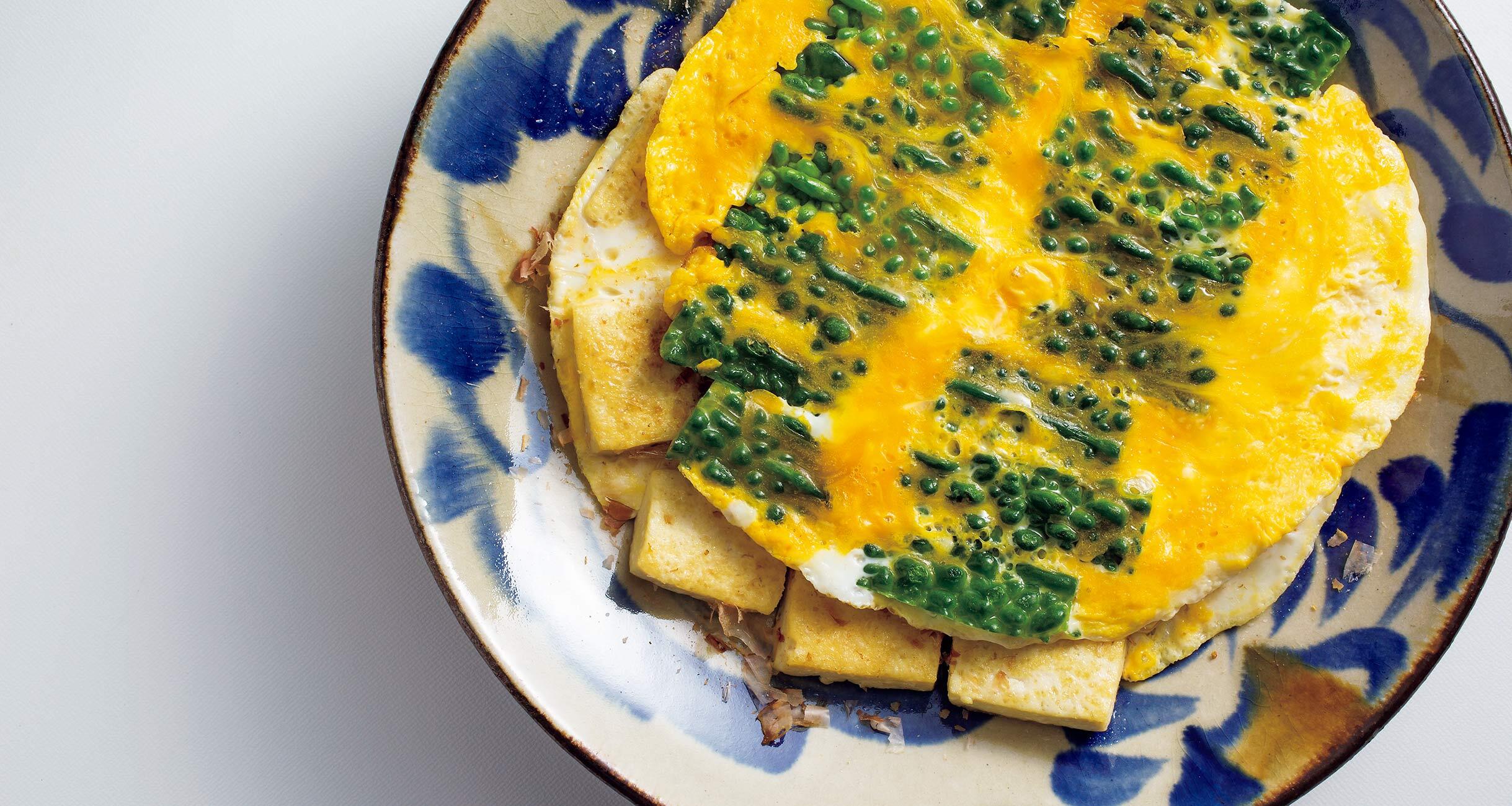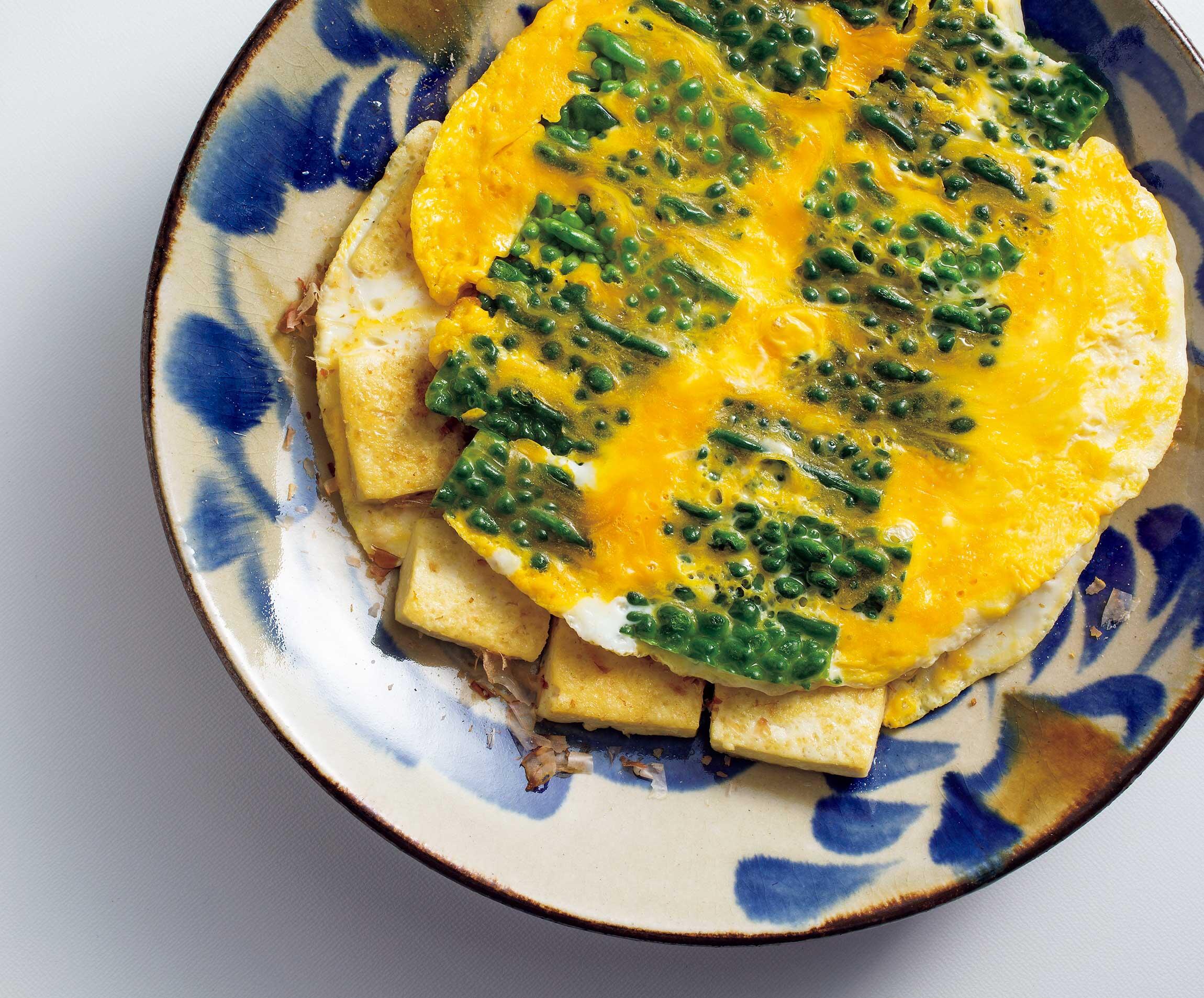 食べてみると、焼いた豆腐の香ばしさ、ゴーヤーのシャクシャクした歯切れよさと爽快な苦味、卵のふくよかな包容力が一挙に押し寄せて、新しいちゃんぷる~ワールドを発見するはず!二層の間にサンドした鰹節クンが、実にいい仕事をしてくれています。肉ナシだって物足りなさはまったくありません。クリアでシンプルな味だから、毎日だって飽きません。そして、弱火で焼くこのレシピなら、中華鍋や強火、勢いよく鍋を返す“腕”もまったく必要ありません。
