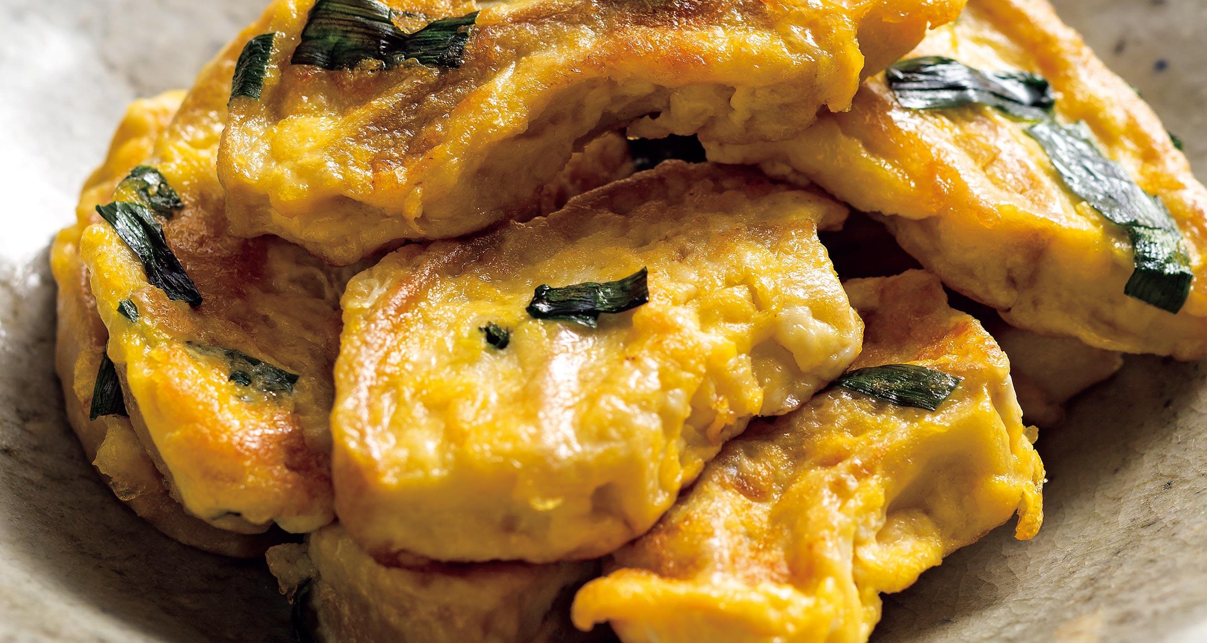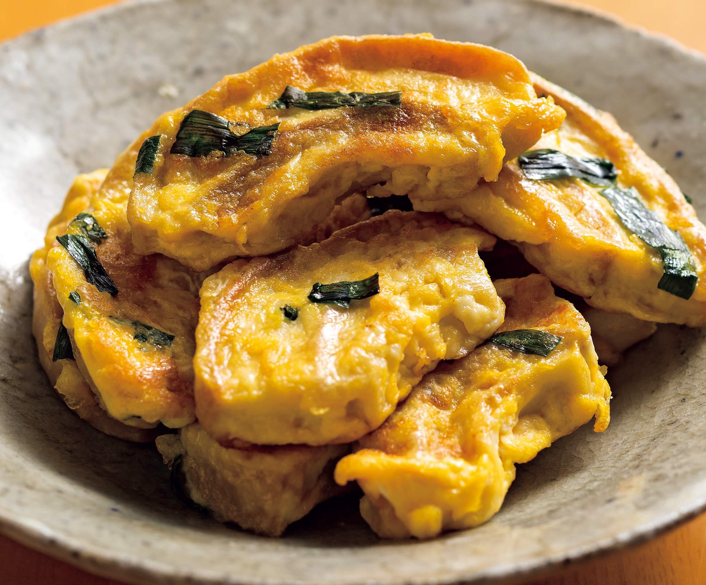 沖縄では車麩が一般的で、用途に合わせて切って使います。今回のレシピは一般的に手に入る麸を使っても、もちろんOK。麸は水で戻すよりも、味つけしただしで戻すと味わいが深くなります。卵をからめて焼けば、おいしくて、ボリュームたっぷりのご馳走に!
