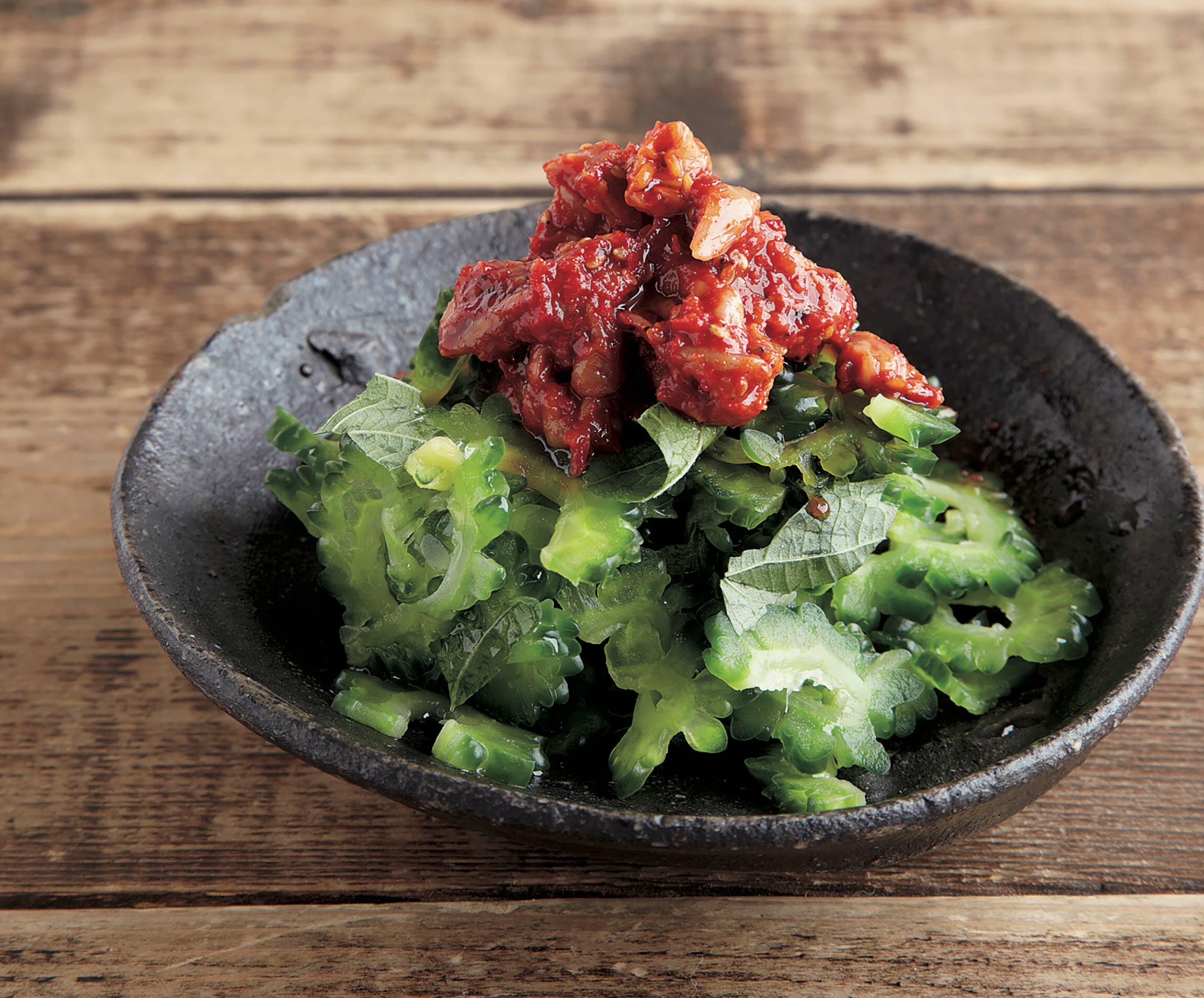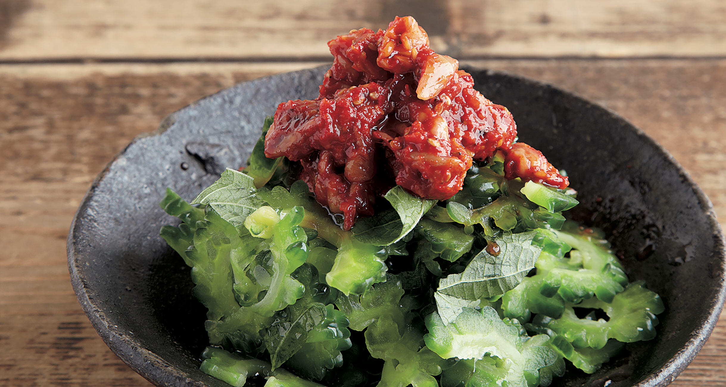 青臭さを取り除いたゴーヤーは、噛みしめるたびに口に程よい苦味が広がる。そこに青じそのスッーとする香りが重なり絶妙な味わいに。夏にモリモリ食べたい。チャンジャをのせただけの簡単つまみなので、気軽につくってみよう。