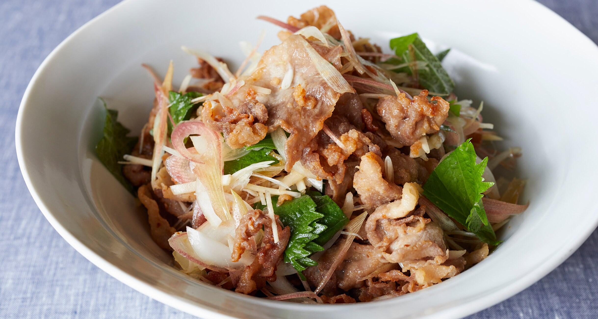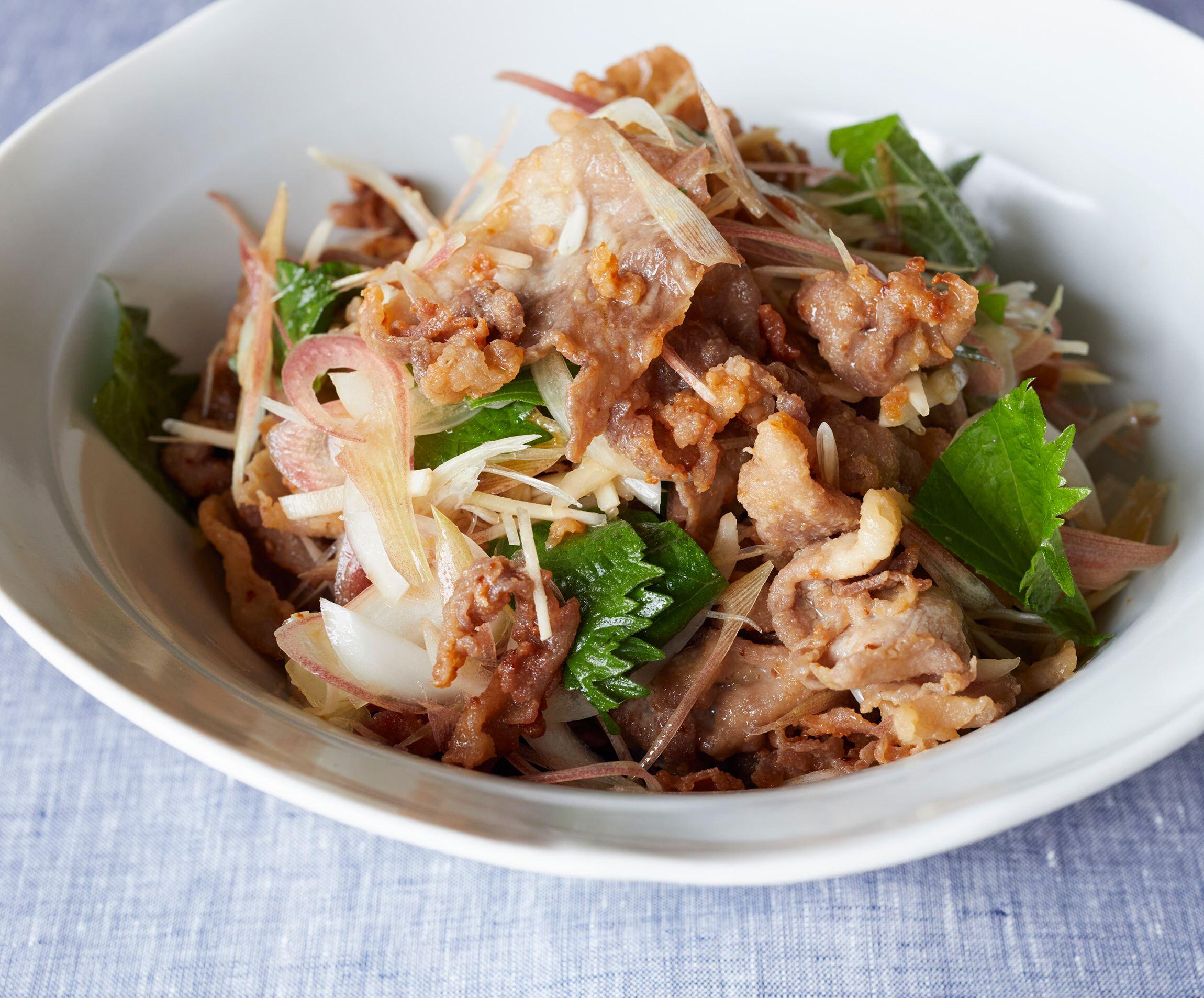 豚肉は大きなものは半分に切る。香味野菜の玉ねぎは縦半分に切り、繊維に沿って薄切りにする。みょうがは縦薄切りにする。青じそは縦半分に切り、横に幅2cmに切る。生姜はせん切りにする。香味野菜を合わせて冷水にさらしてパリッとしたら、サラダスピナーで水気をきる。