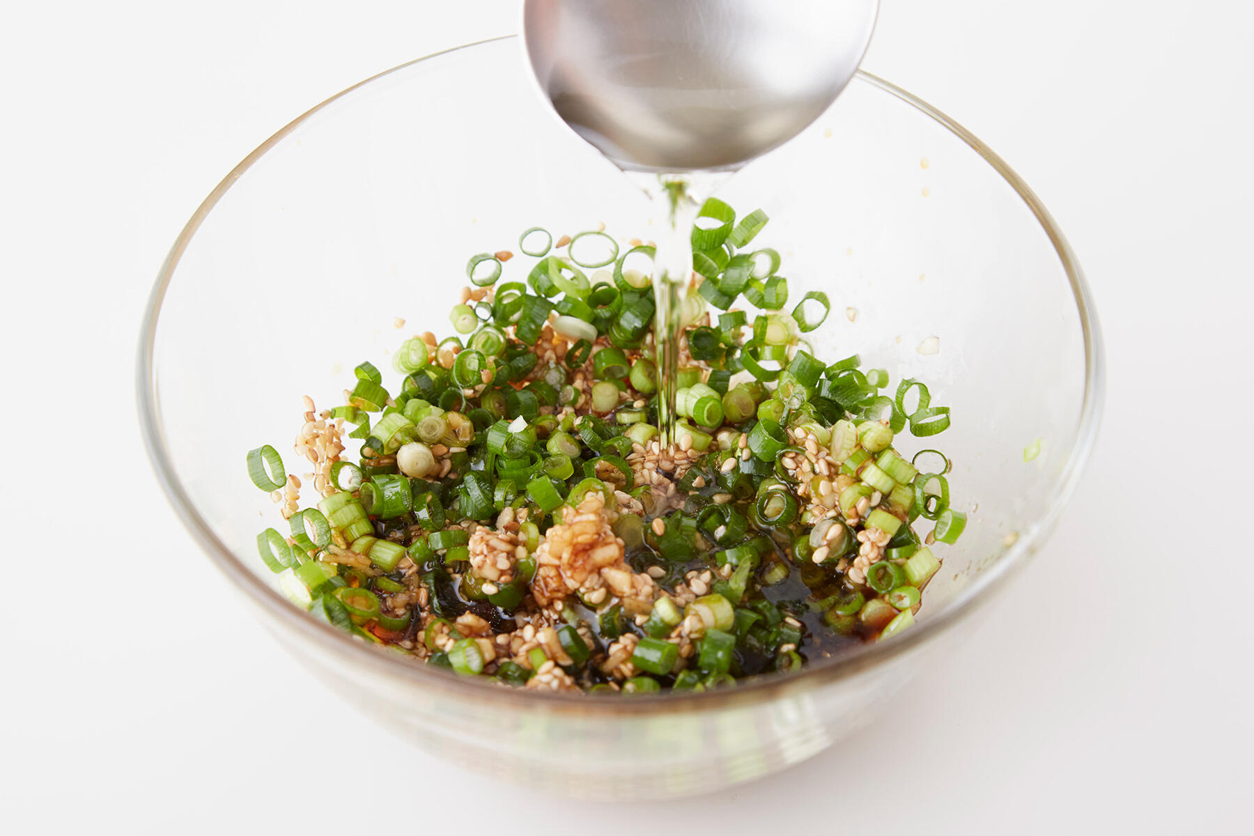薬味ソースは生姜と小ねぎに調味料を加えていきます。胡麻が味のアクセントに。砂糖が溶けるまでよく混ぜてください。