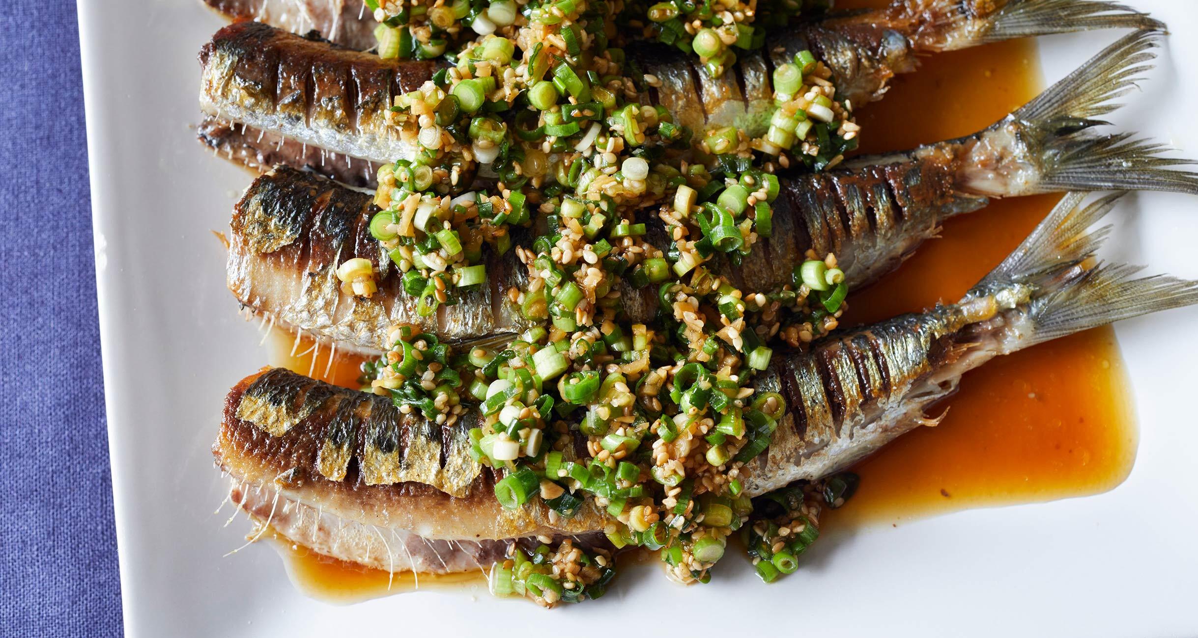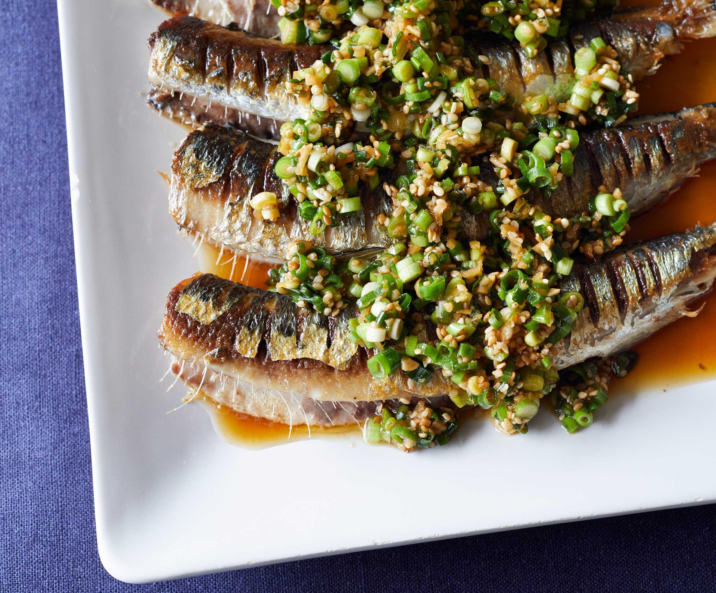 器にイワシを並べ、薬味ソースをかける。