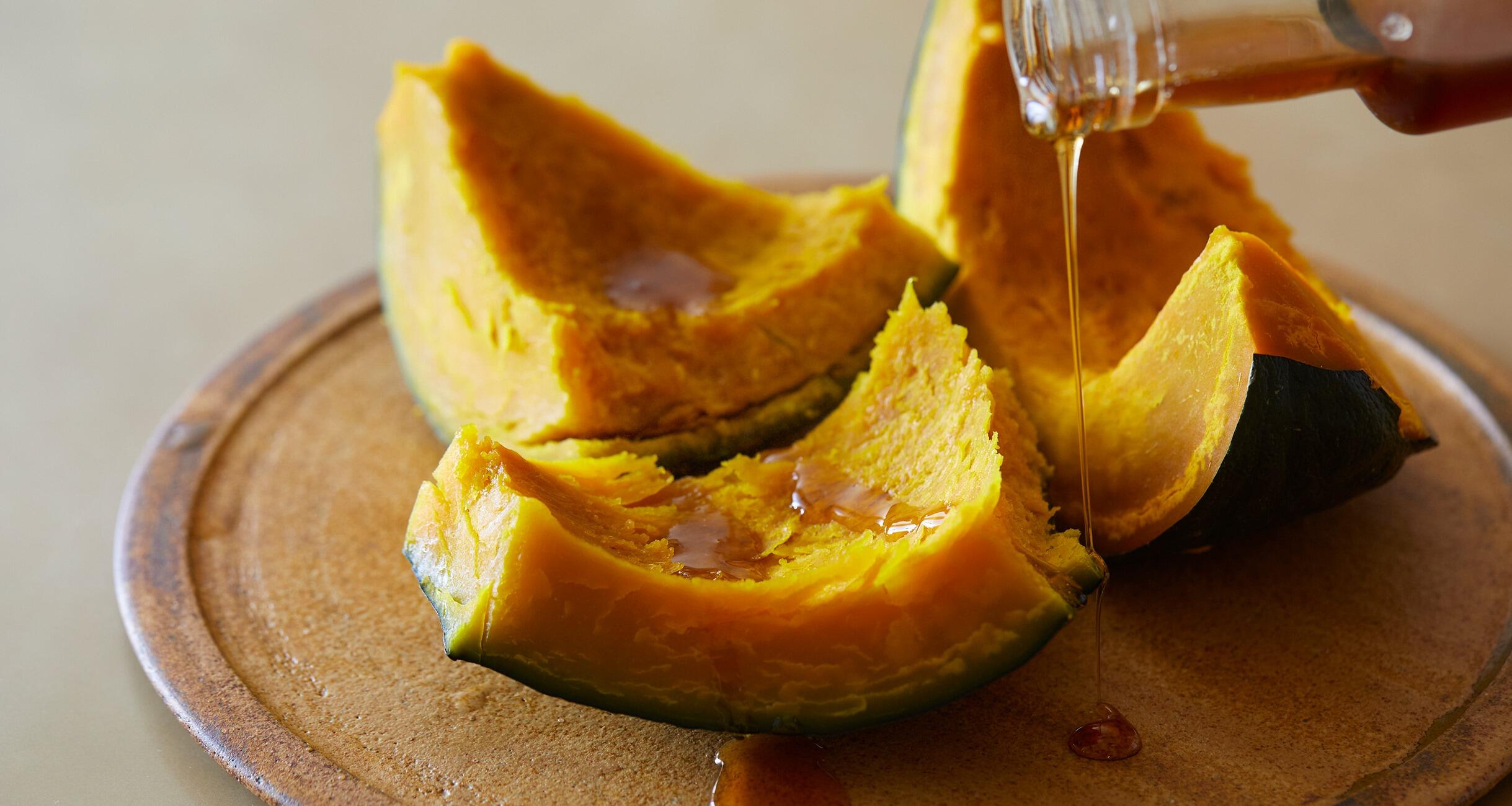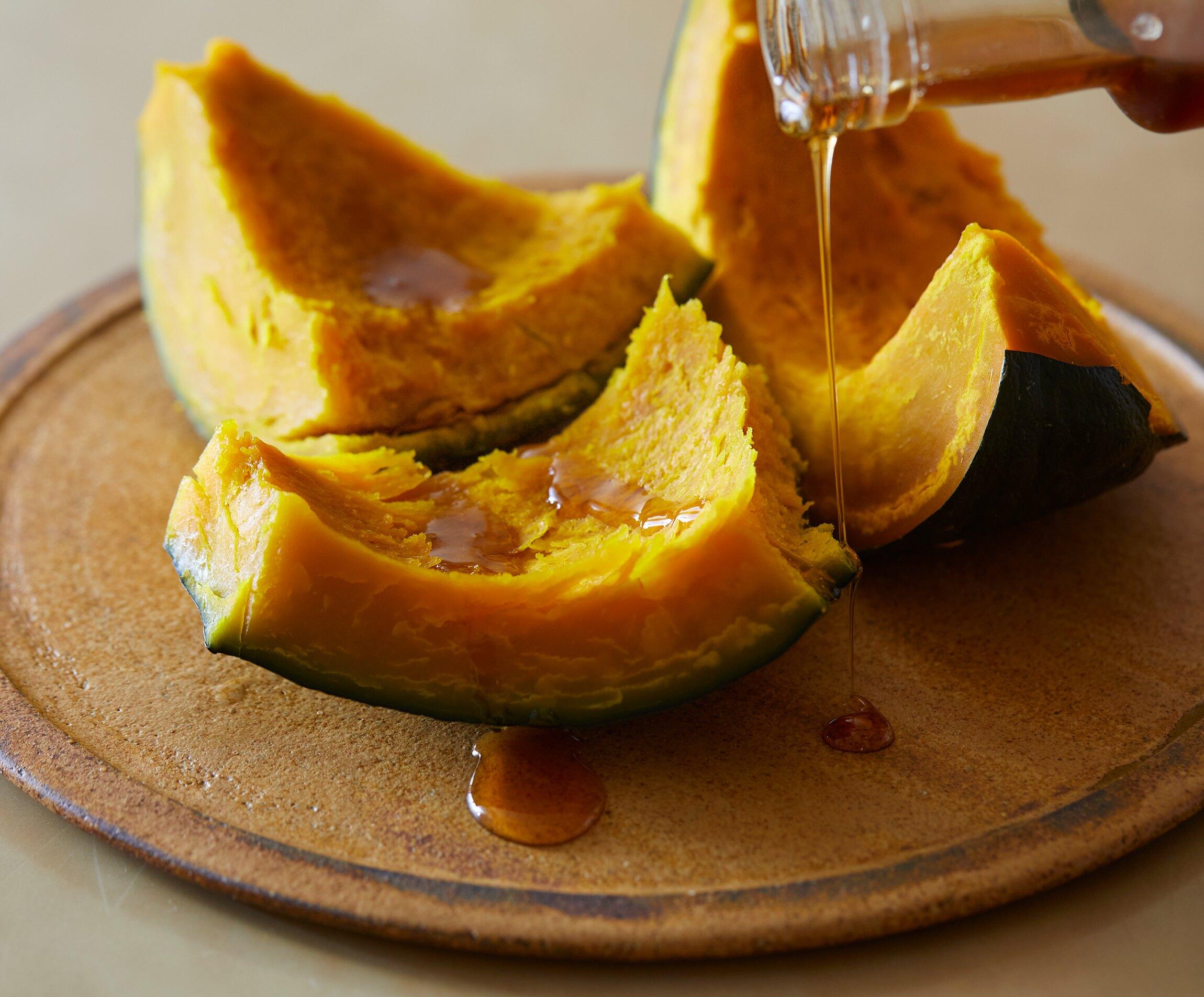 かぼちゃにはメープル香があるので「文句なしに合う」というメープルシロップをかければ完成。ほっくりしたかぼちゃにシロップがしみこんだ味はまるでスイーツ。ぜひお試しを!