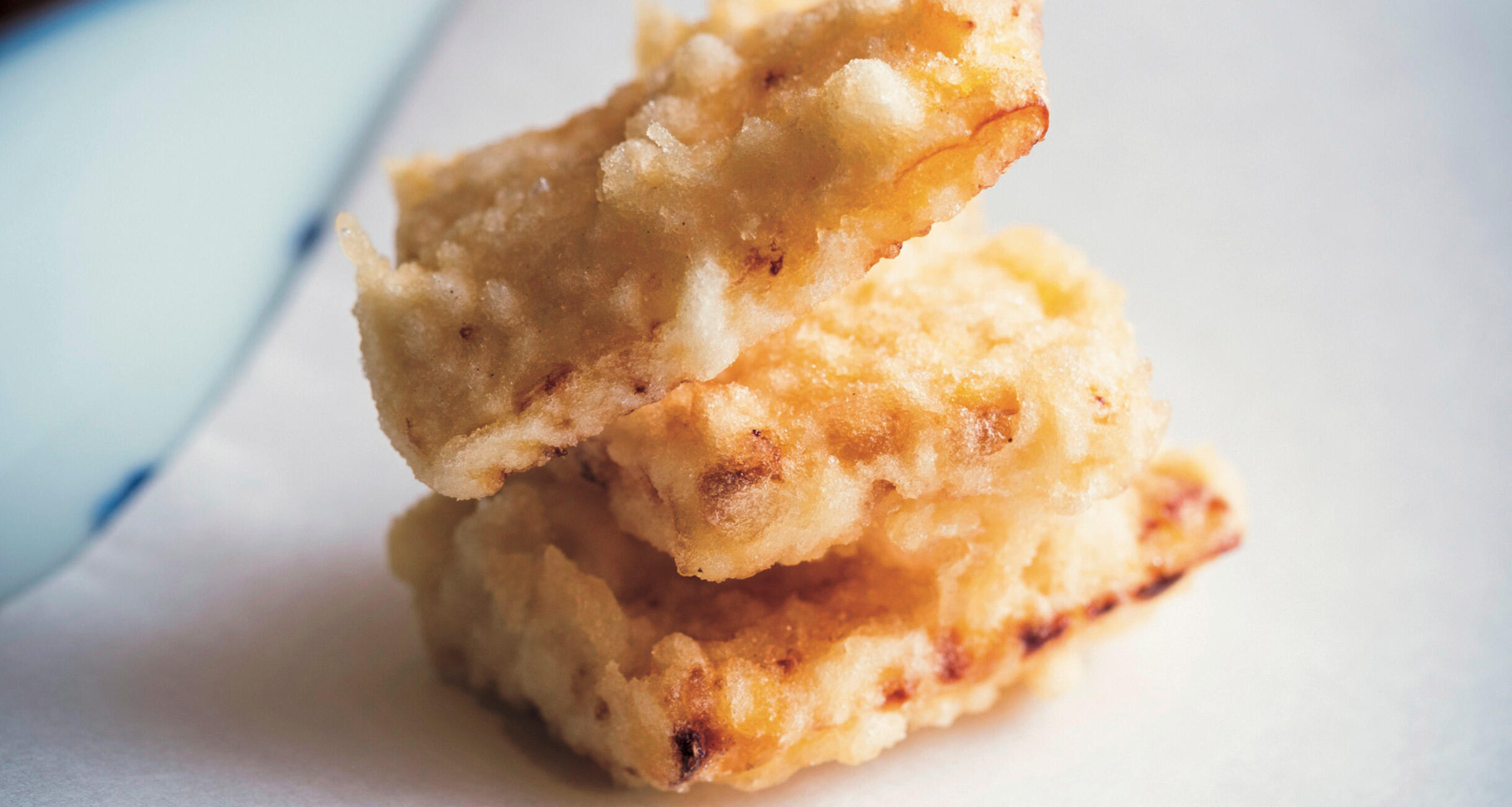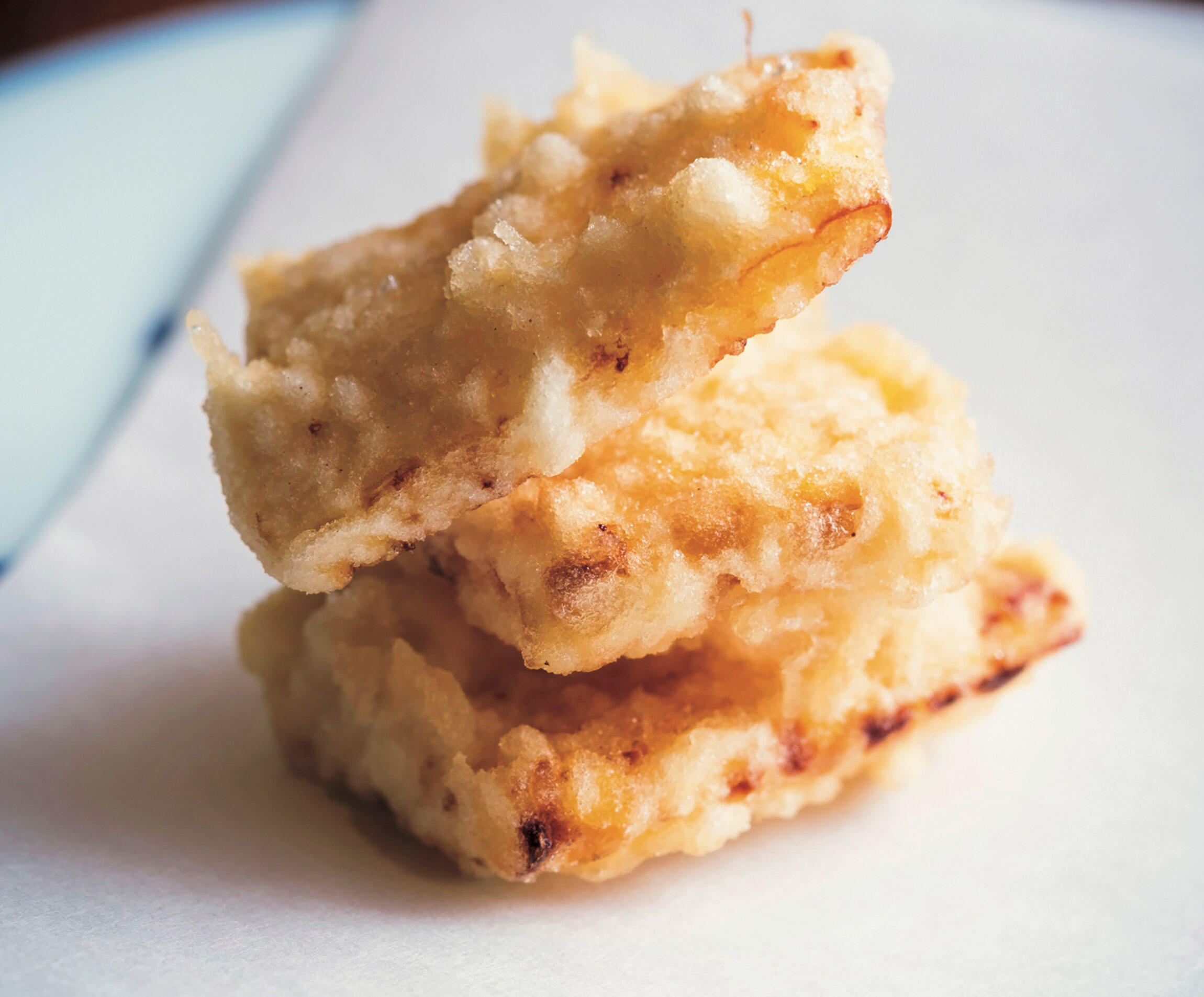 180℃の揚げ油に、粒々があるほうを上にしてそっと入れる。衣が固まってきたら天地を返して全体に火を入れる。時々、返しながら、さらに3分ほど揚げたら引き上げる。表面に軽く焦げ目がつくくらいだと香ばしさが際立つ。