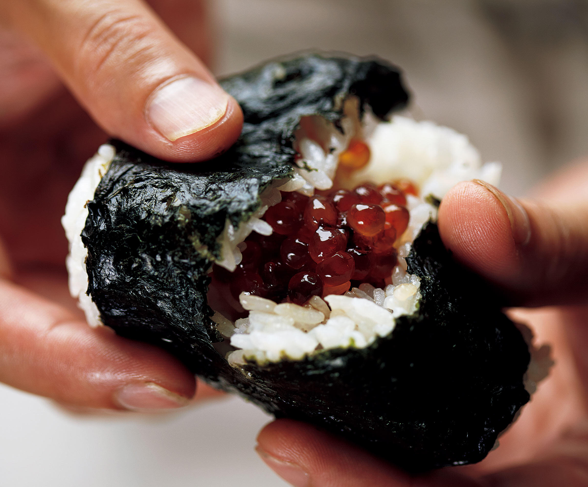 手に塩水(分量外)をつけて、筋子15gを具に、ご飯を三角にむすび、海苔を巻く。具は皿に個数分、あらかじめ取り出しておくと便利。