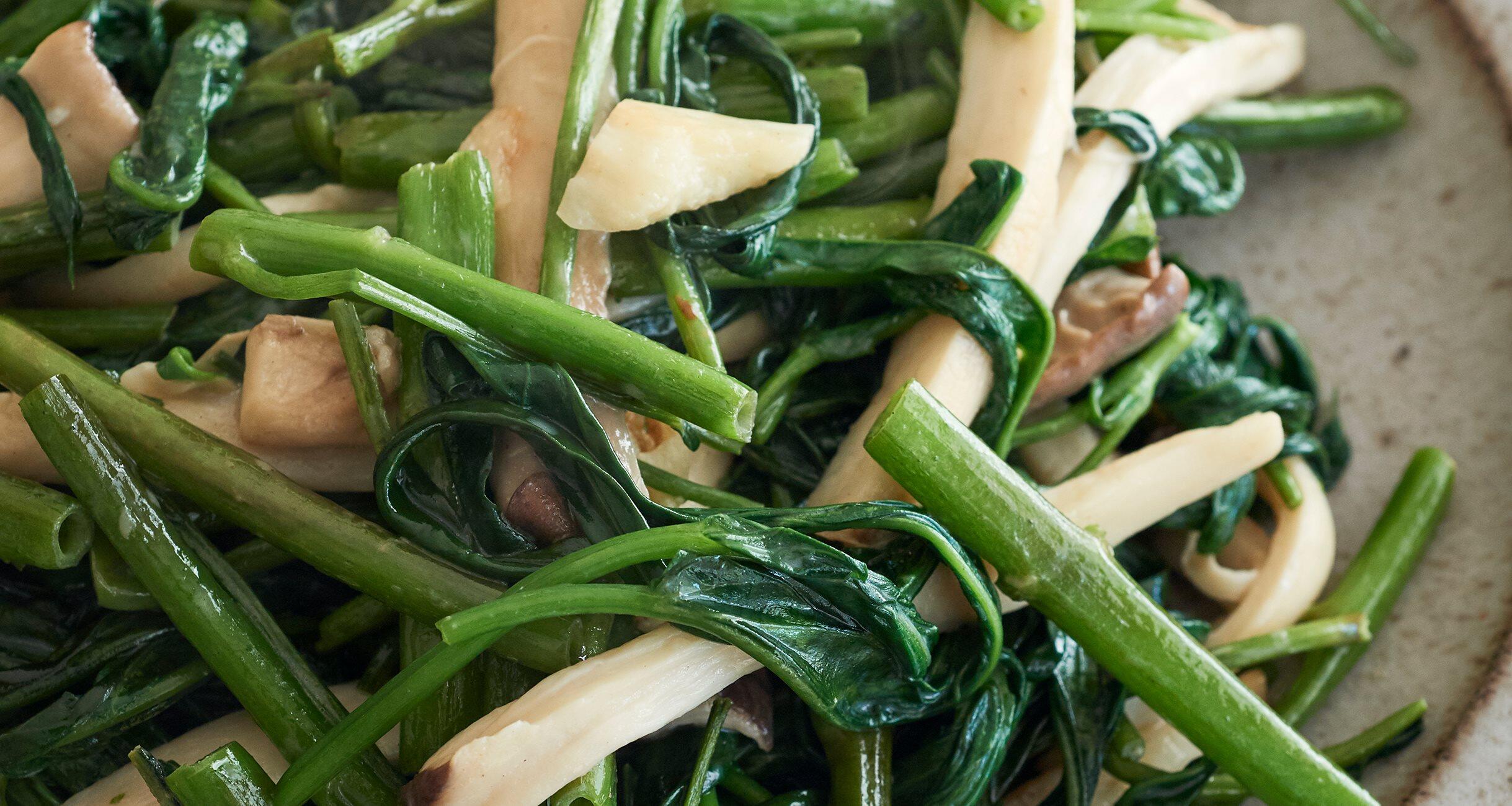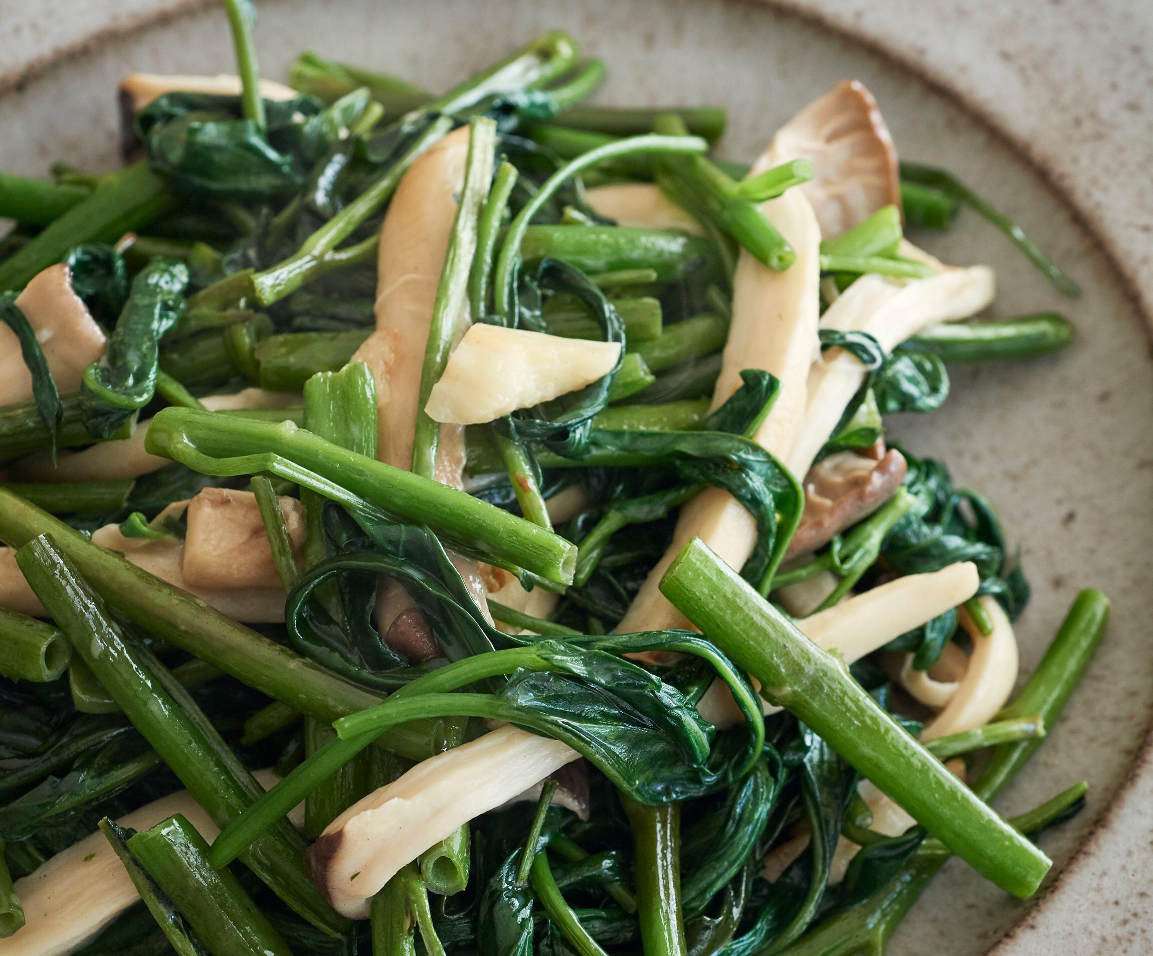 空芯菜は葉を摘んで茎と分ける。茎は長さ4㎝に切る。エリンギは根元に切り込みを入れて食べやすい大きさに裂いておく。