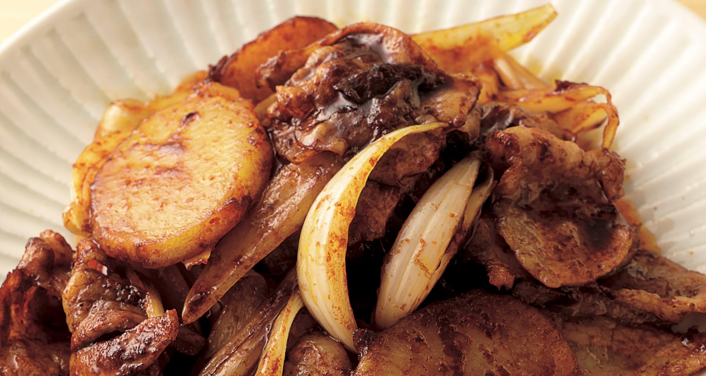 じゃがいもと玉ねぎに合わせて、甘味噌の甜麺醤を使用。コクのある、ほっとするような味わいだ。水気が多い新じゃがはゆでてから素揚げに。これで炒める際も崩れにくくなる。