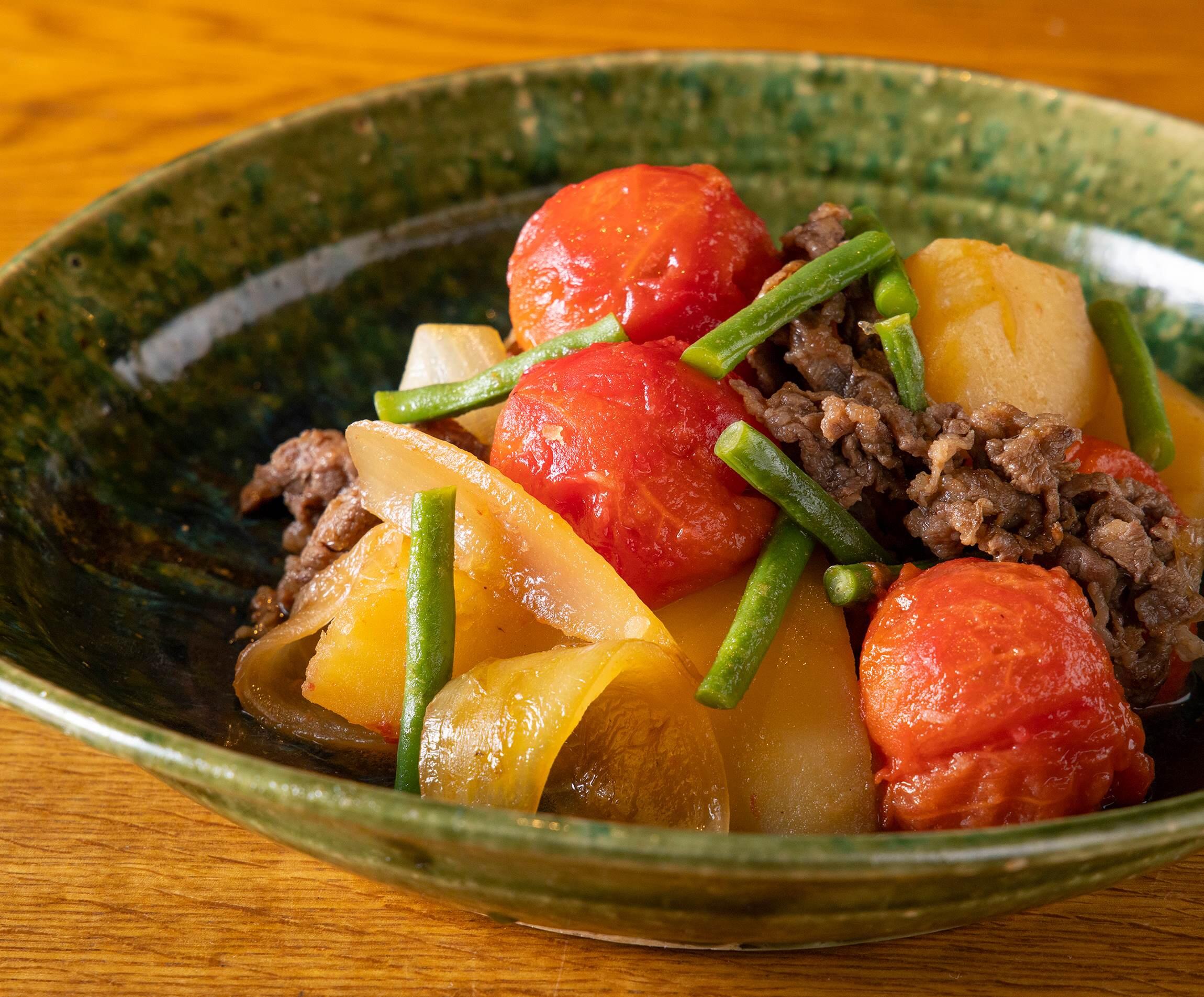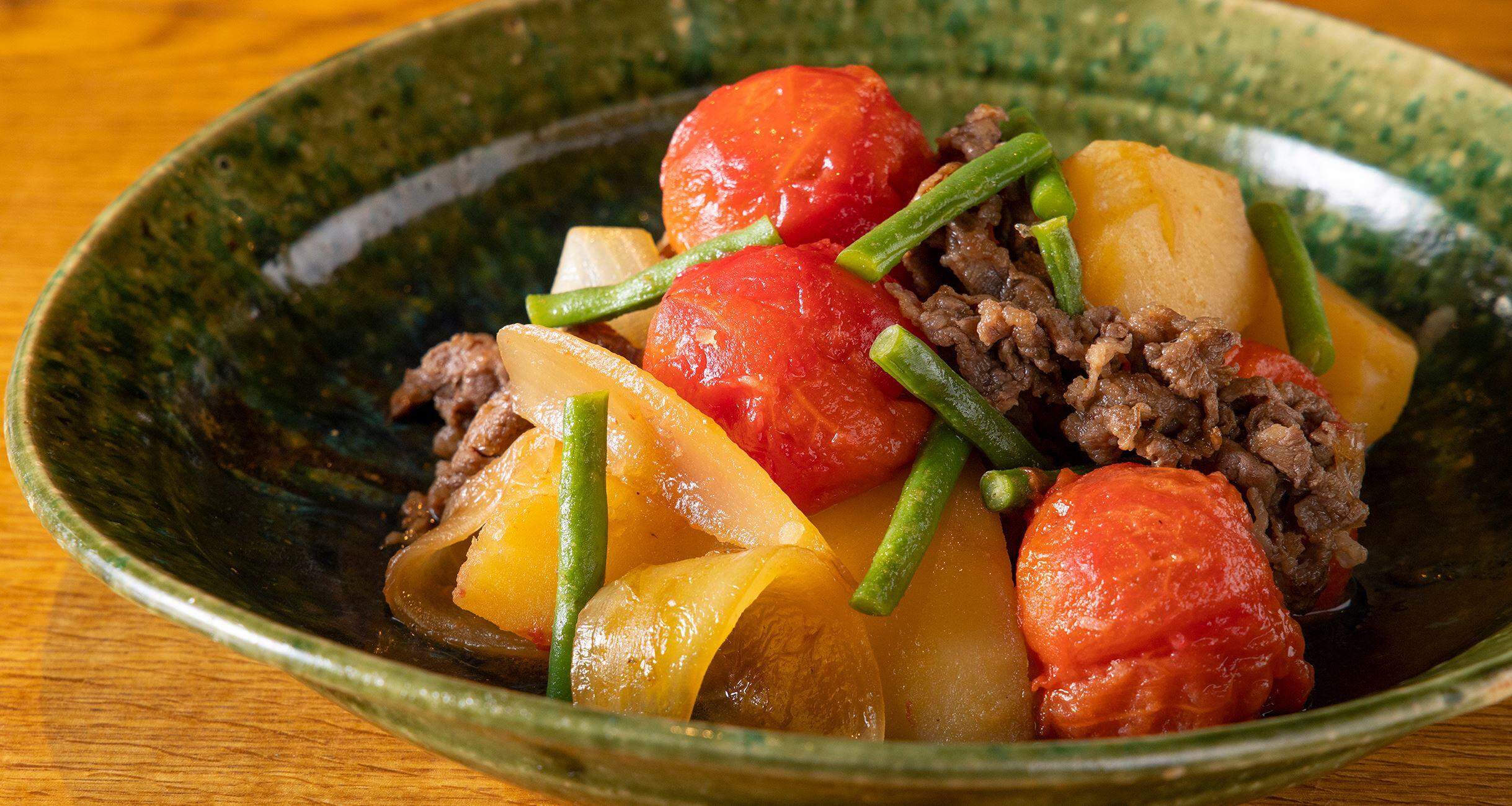 「油は調味料の一つ。質のいい油を使うと、料理がおいしくなりますよ」とも話す林さんの“トマト肉じゃが”は、白いご飯にぴったり!一日置くと味がしみて、また違ったおいしさを楽しめます。