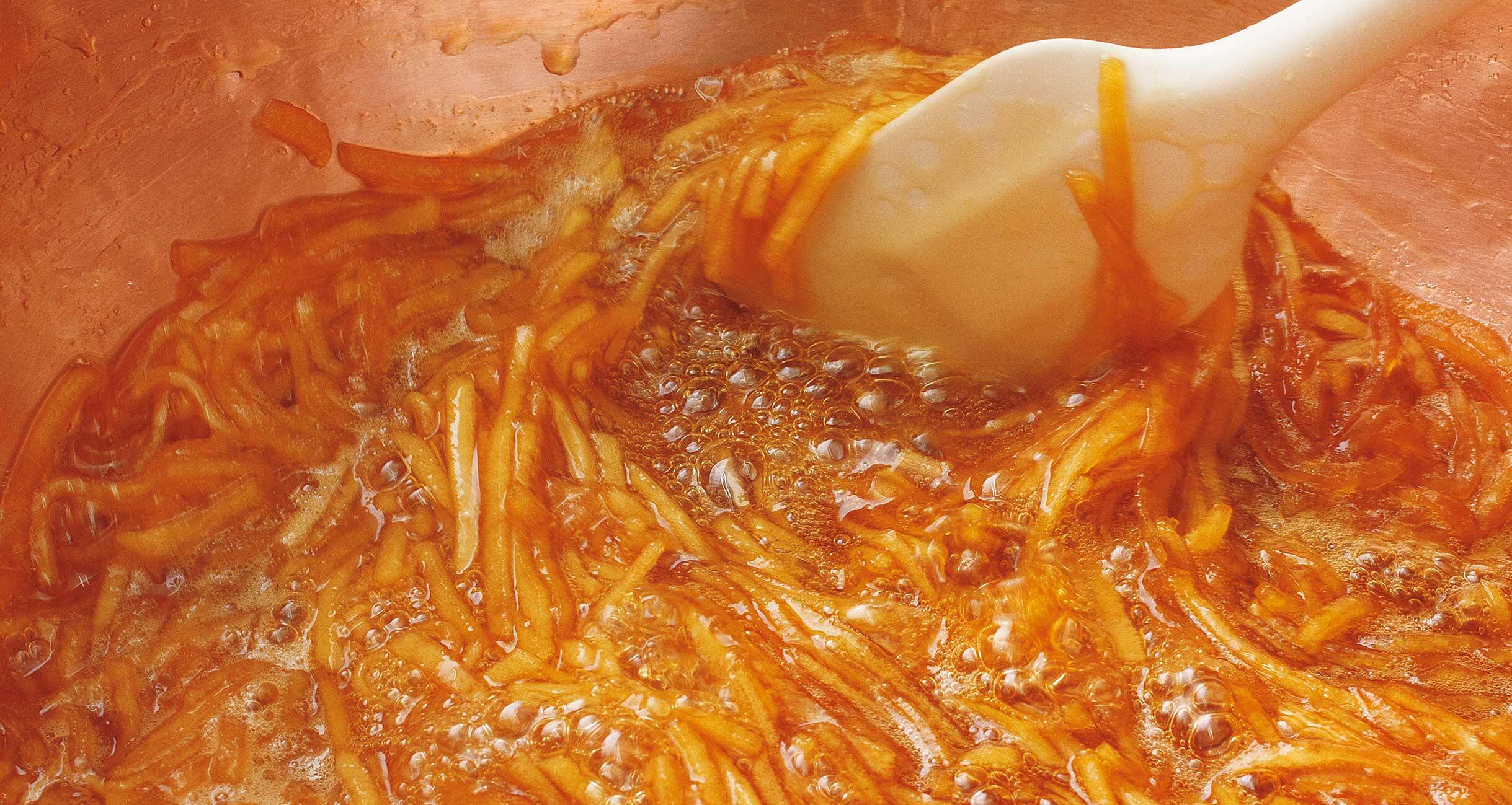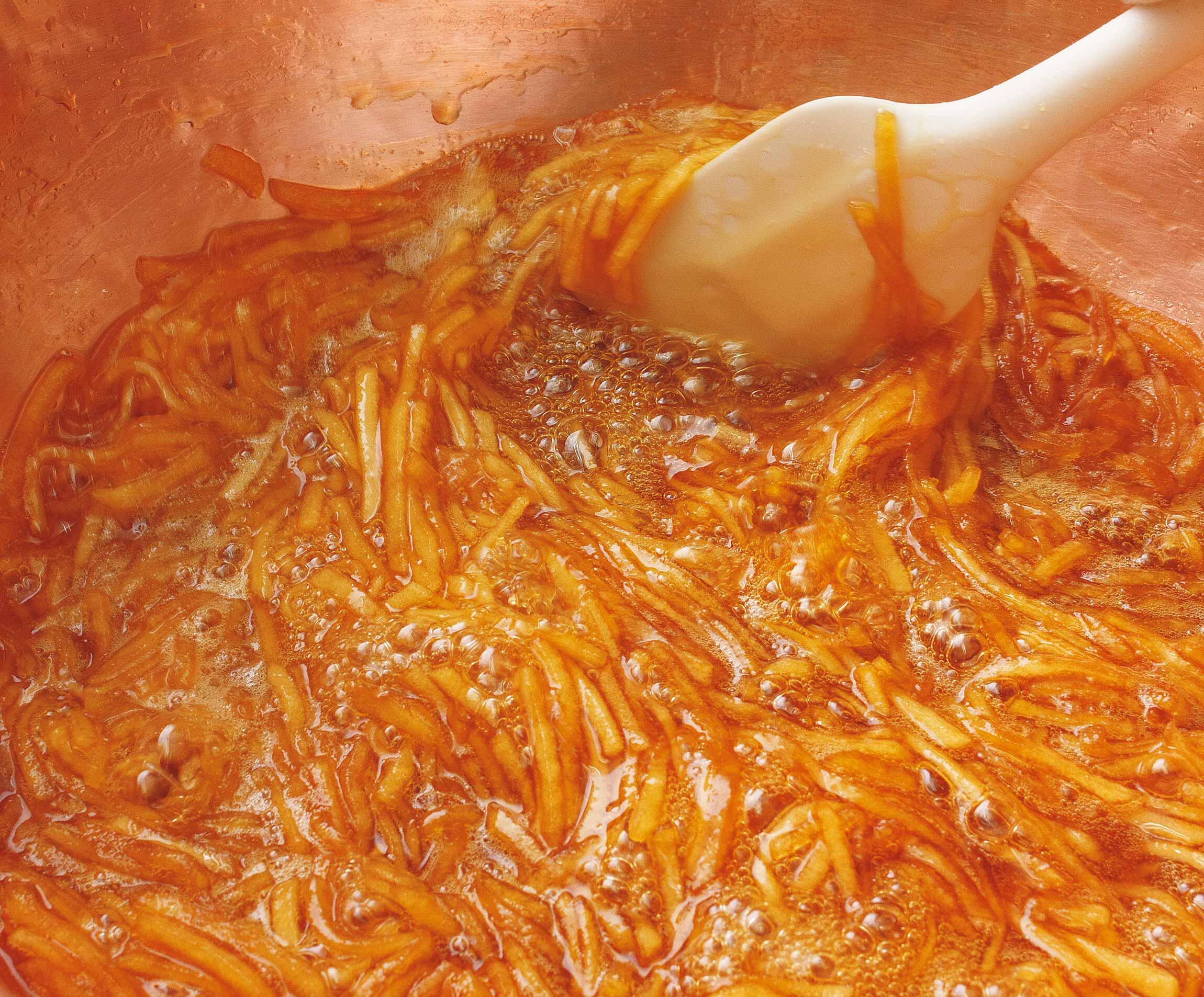 再び強火にかけ、残りのグラニュー糖400gを混ぜ合わせ、①のマッチ棒状のりんごを入れて、しんなりするまで煮る。中心がグツグツと沸騰し、細かい泡が立ったら、火を止める。ボウルに移し、完全に冷めたら空気に触れないようにラップを表面に密着させてかける。冷蔵庫に一晩置いてなじませる。