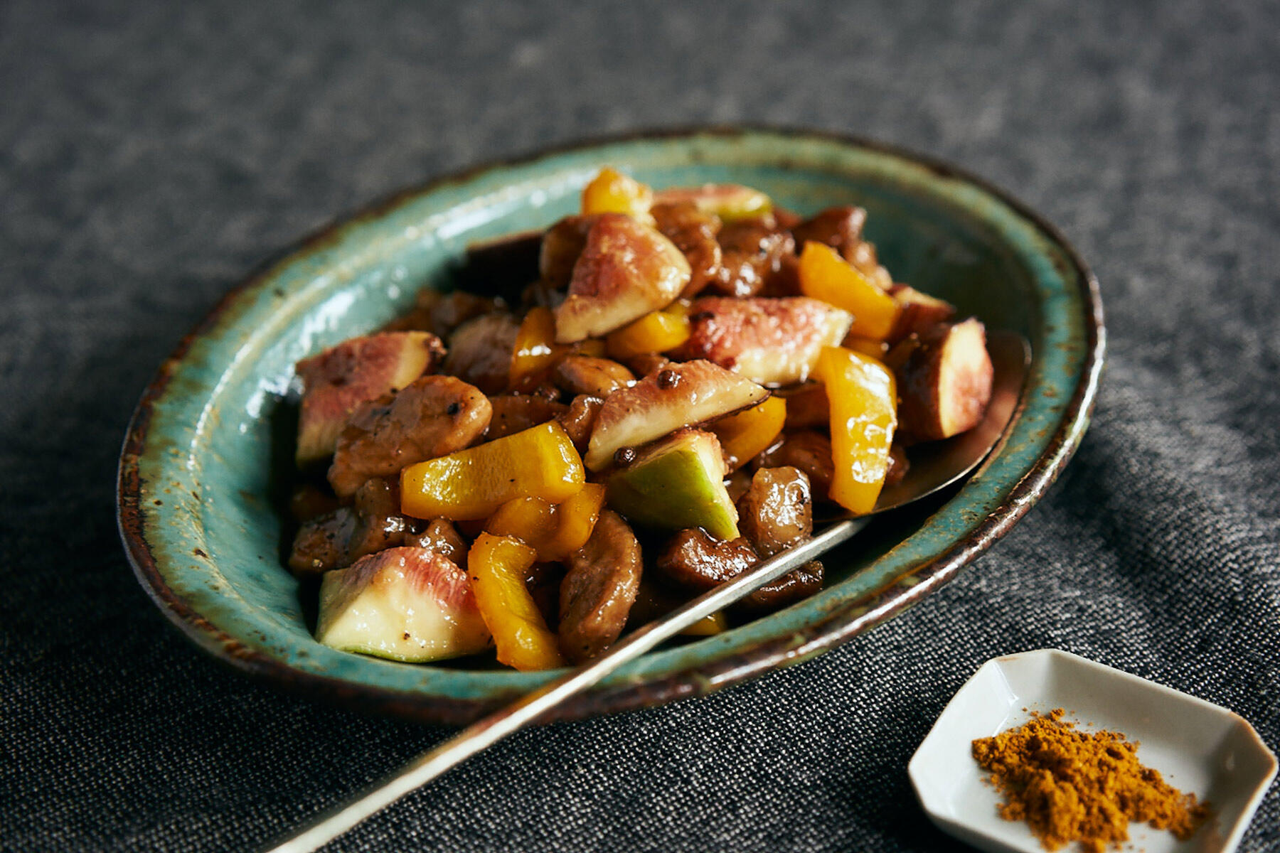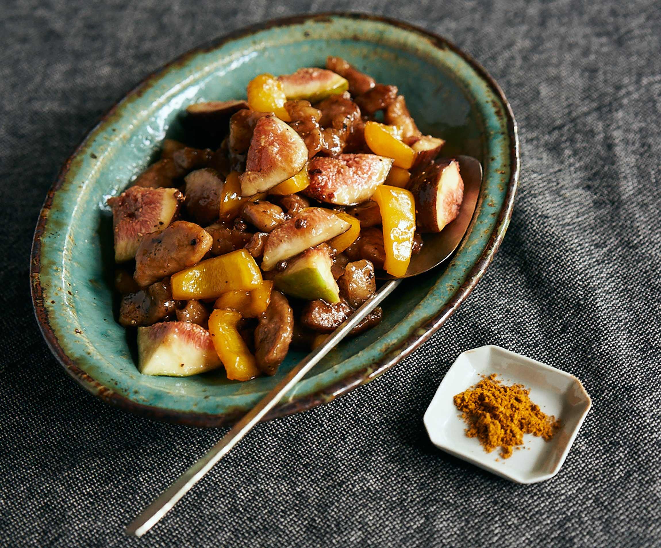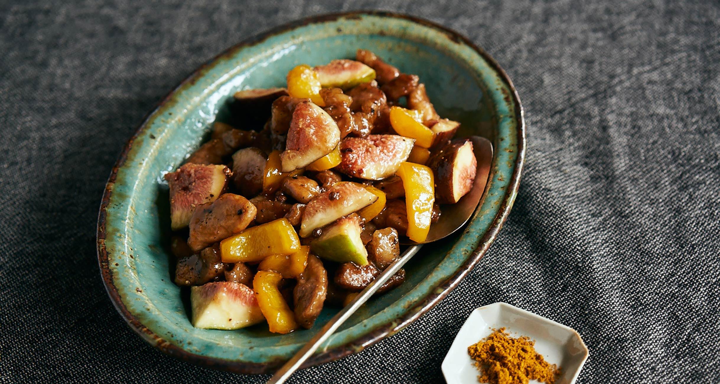 ふつふつと煮立ってとろみがつき始めたら、豚肉とパプリカを加えてからめる。火を止め、いちじくと黒胡椒(分量外)少々を加えて混ぜ、器に盛る。