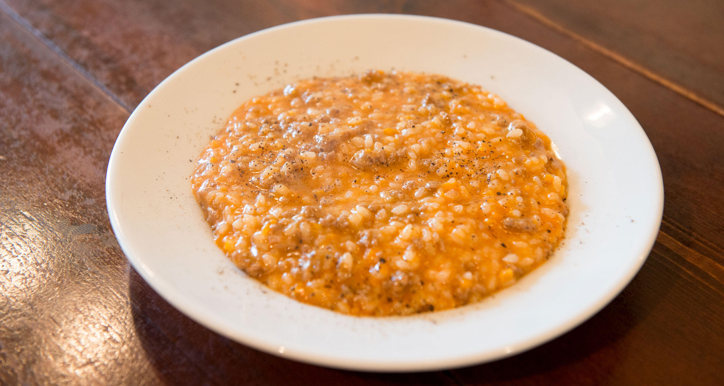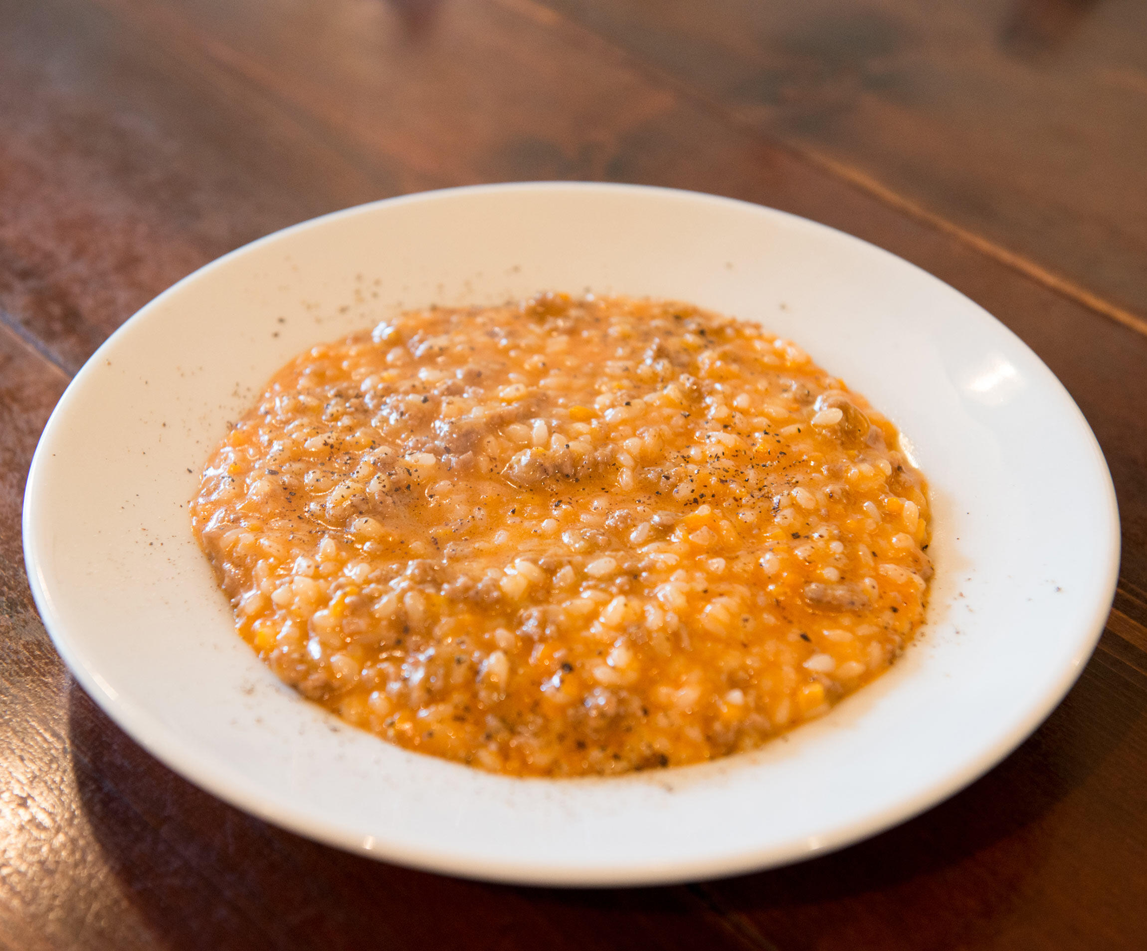 「前回のパスタと同じように、本来はリゾットもブロード(肉や野菜から取るだし)を使うのですが、家庭でつくるのなら、ひき肉と野菜、トマトソースで十分おいしくなります」と小串シェフ。