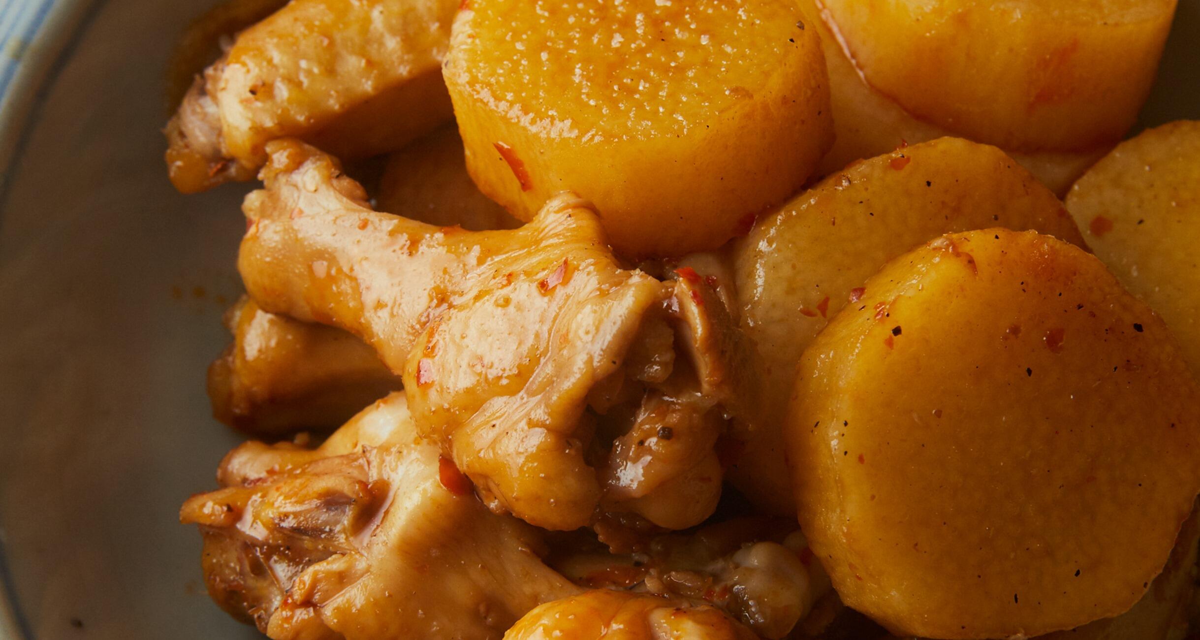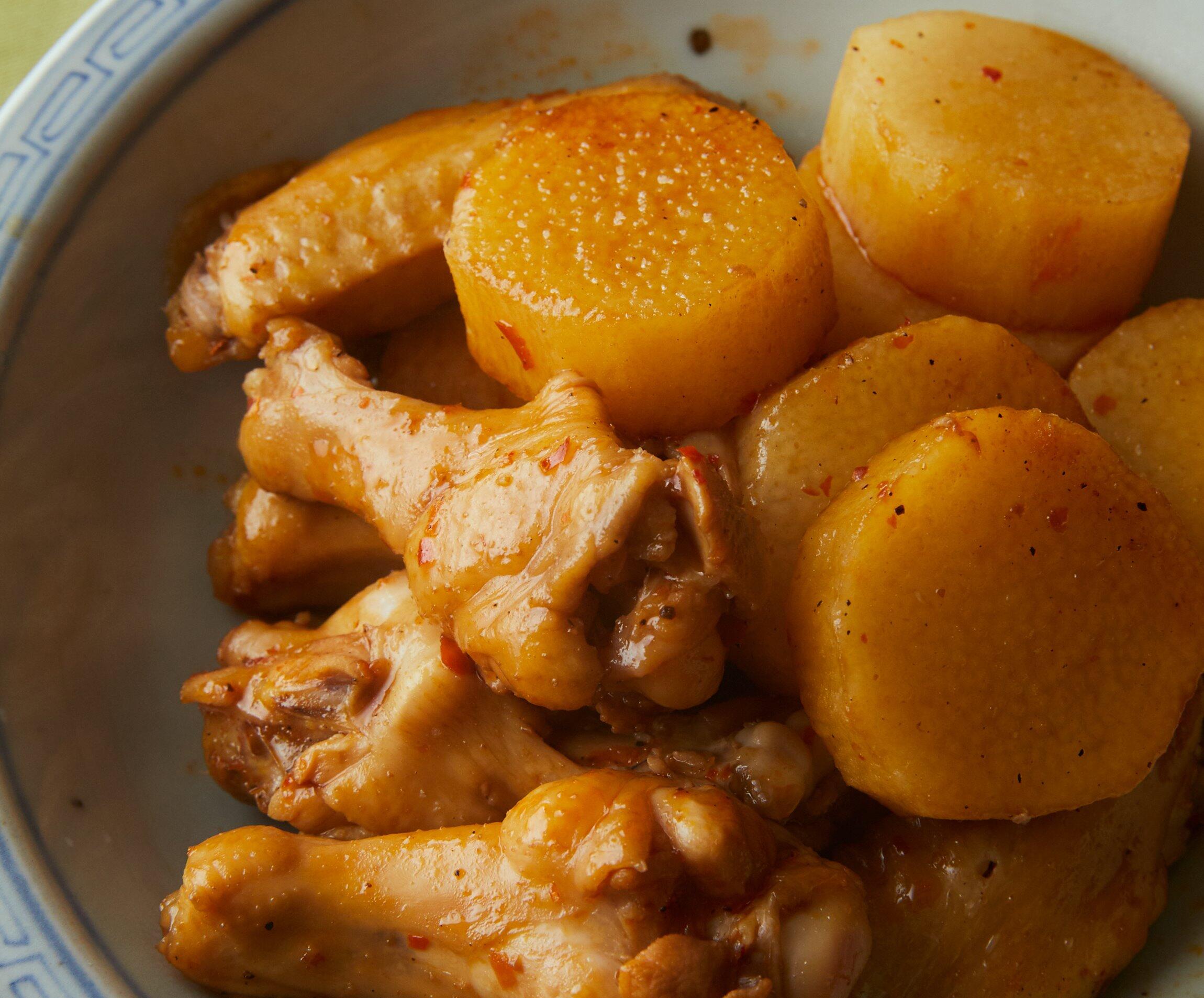 手羽先と手羽元を使った食べ応え十分なボリュームおかずです。鶏のだしと甘辛な味付けが長いもとよく絡んでご飯が進みます。