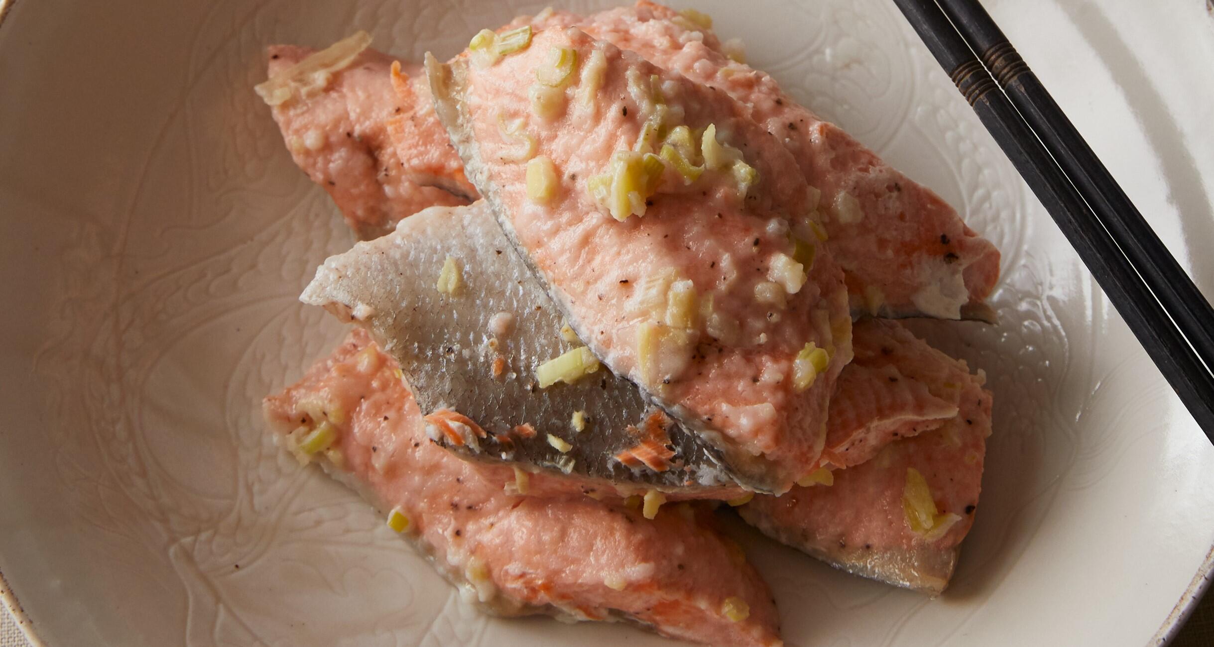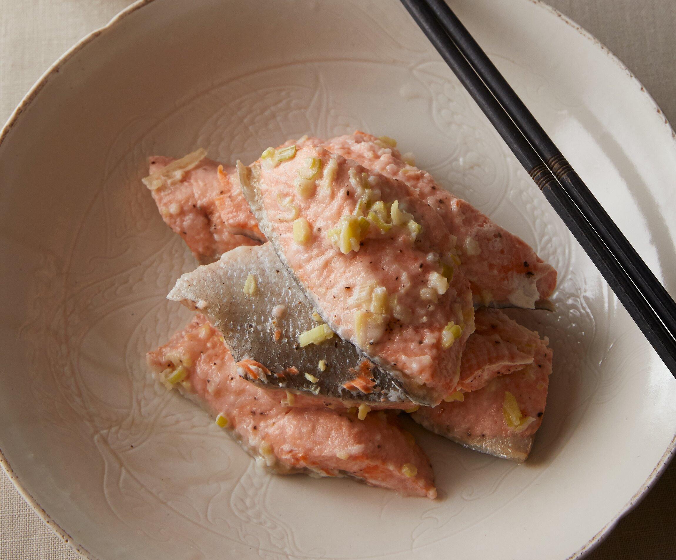 鮭に下味をしっかりつけ、旨味を凝縮した蒸し料理です。白身魚でも応用が利くので、いろいろと試してみてください。