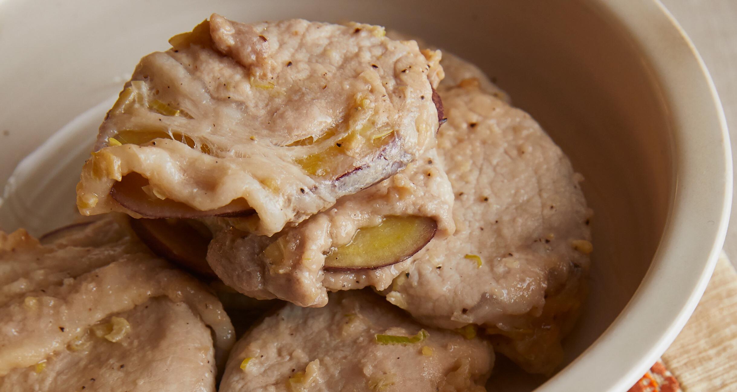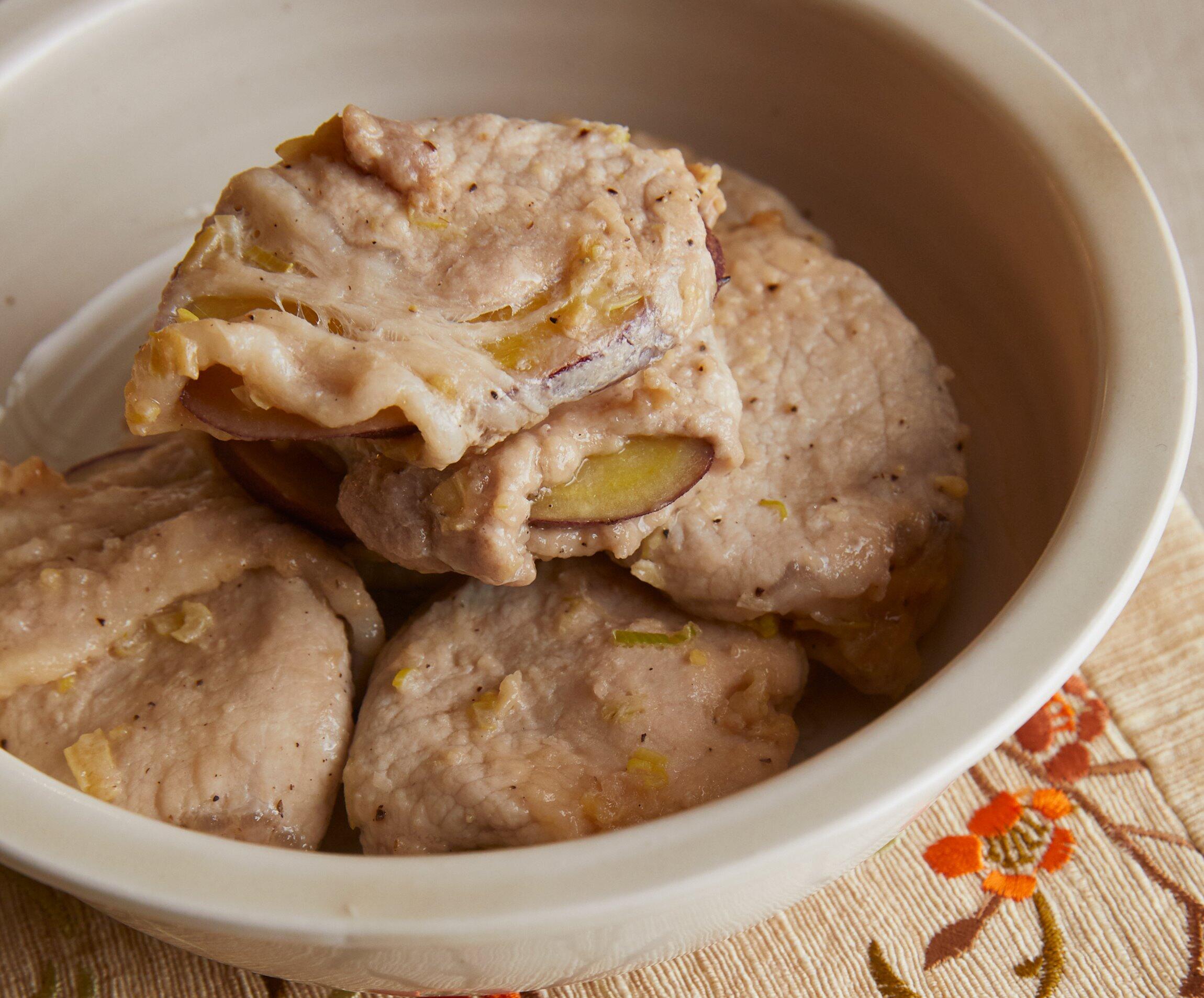 ほくほくのさつまいもを豚肉で包みボリュームもアップ。ずらしながら重ねて蒸すことで、蒸気がムラなく全体に行き渡り、豚肉の旨味と下味の調味料が、さつまいもにしっかりとしみ込みます。
