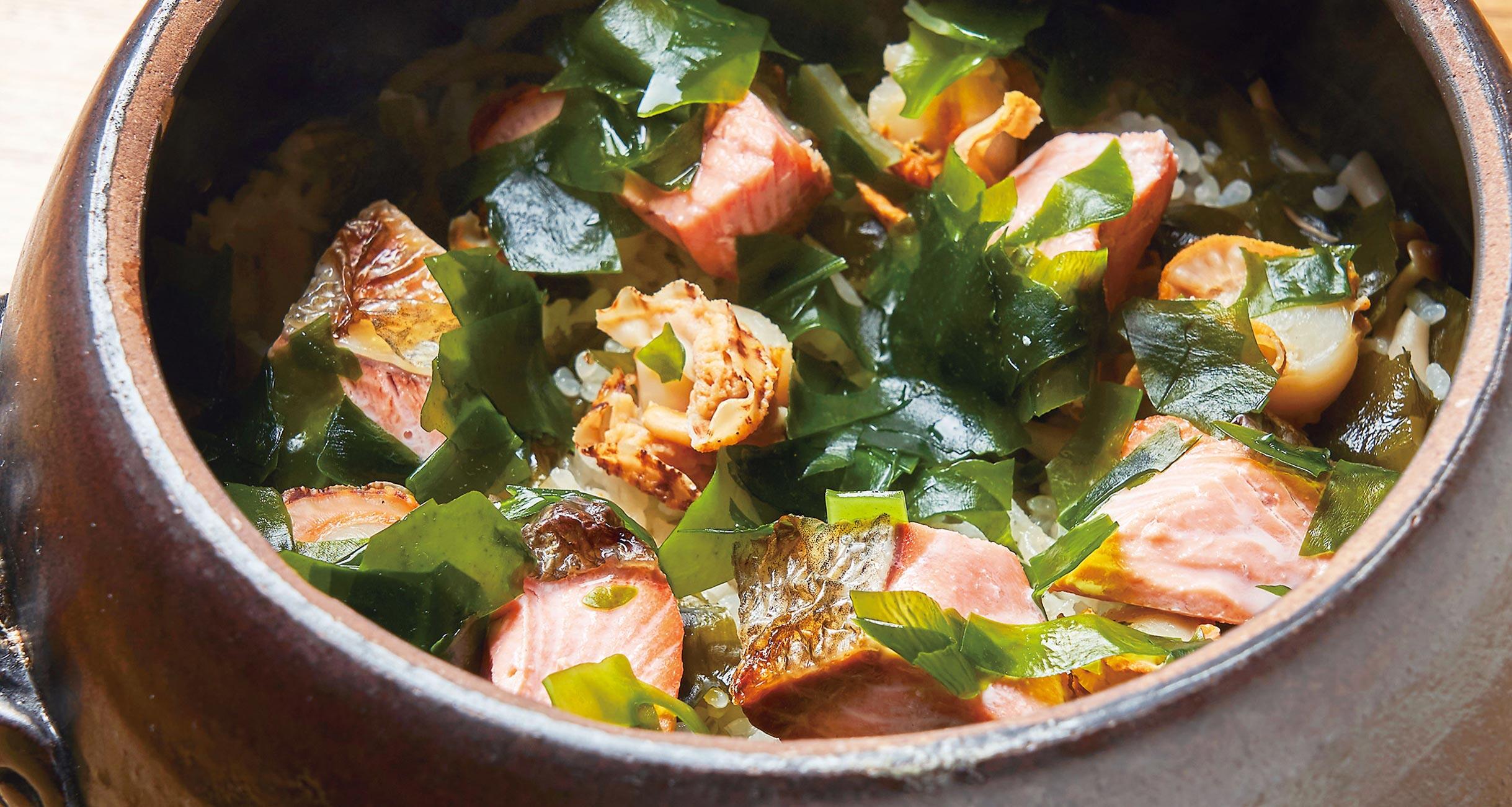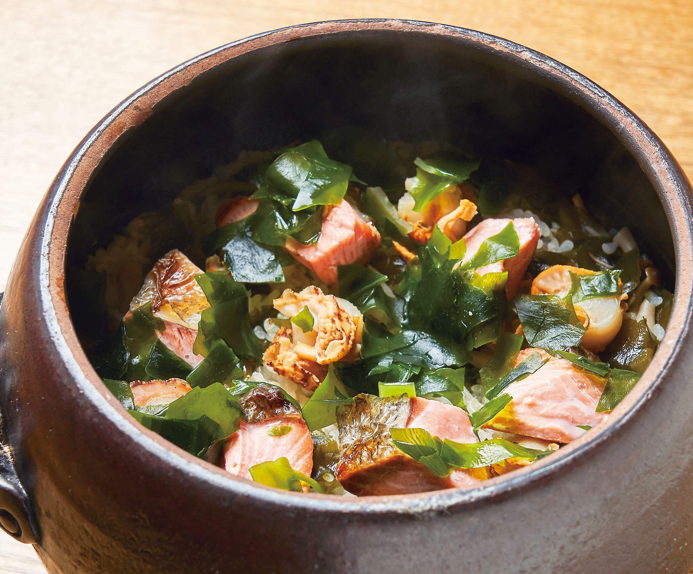 さらに仕上げに水で戻したわかめを加えれば、手軽にたっぷりのわかめを食べられる。秋鮭のほぐし身の焼けた香りとベビーホタテの旨味を吸ったご飯を、わかめの食感と海藻らしいミネラル感のある風味が見事にまとめ上げてくれる。