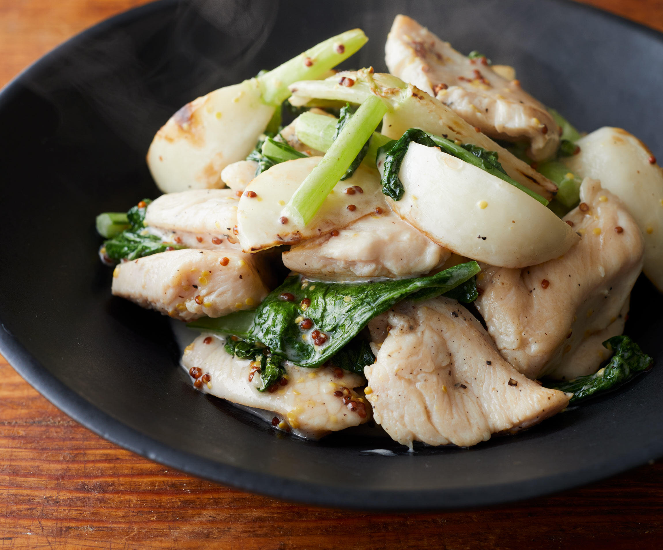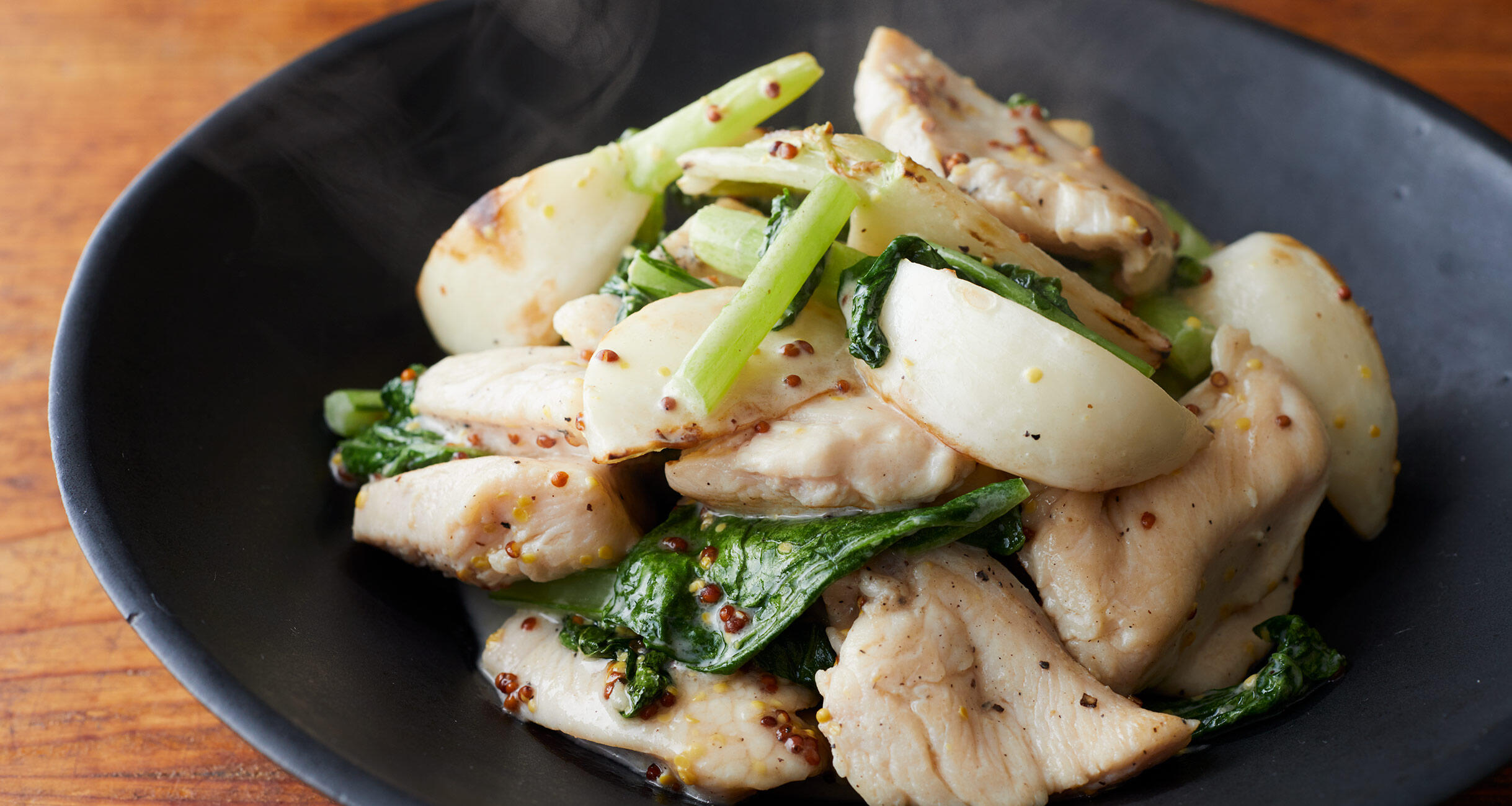 肉と野菜を炒めるときは、肉をゴロッと大きめに切りそろえることで、食べごたえが抜群のおかずになります。いまが旬のかぶは、火を入れることでシャクっとした食感で、ほんのり甘く美味!マスタードの酸味も効いているので、白ワインと合わせるのもお薦めです!