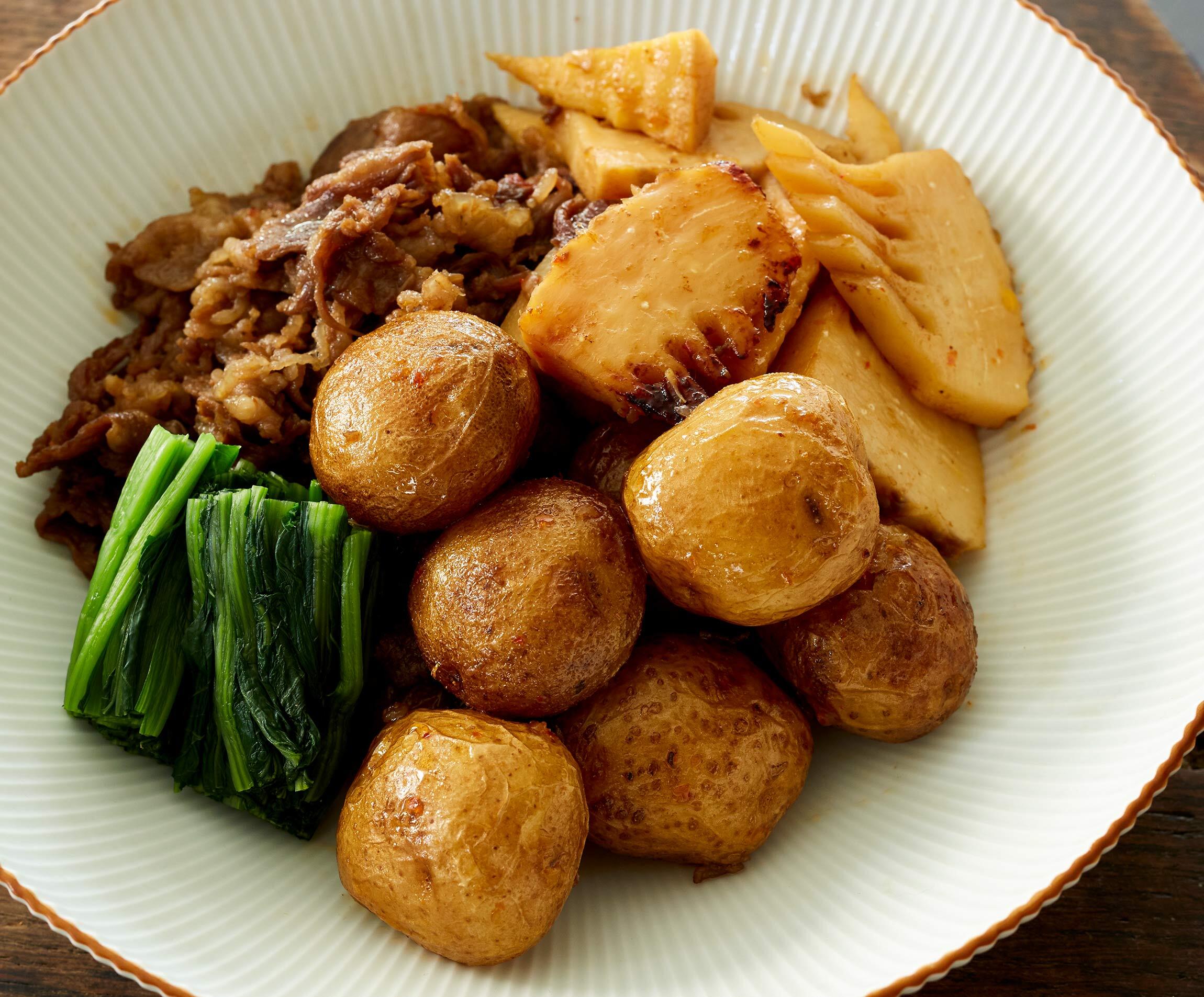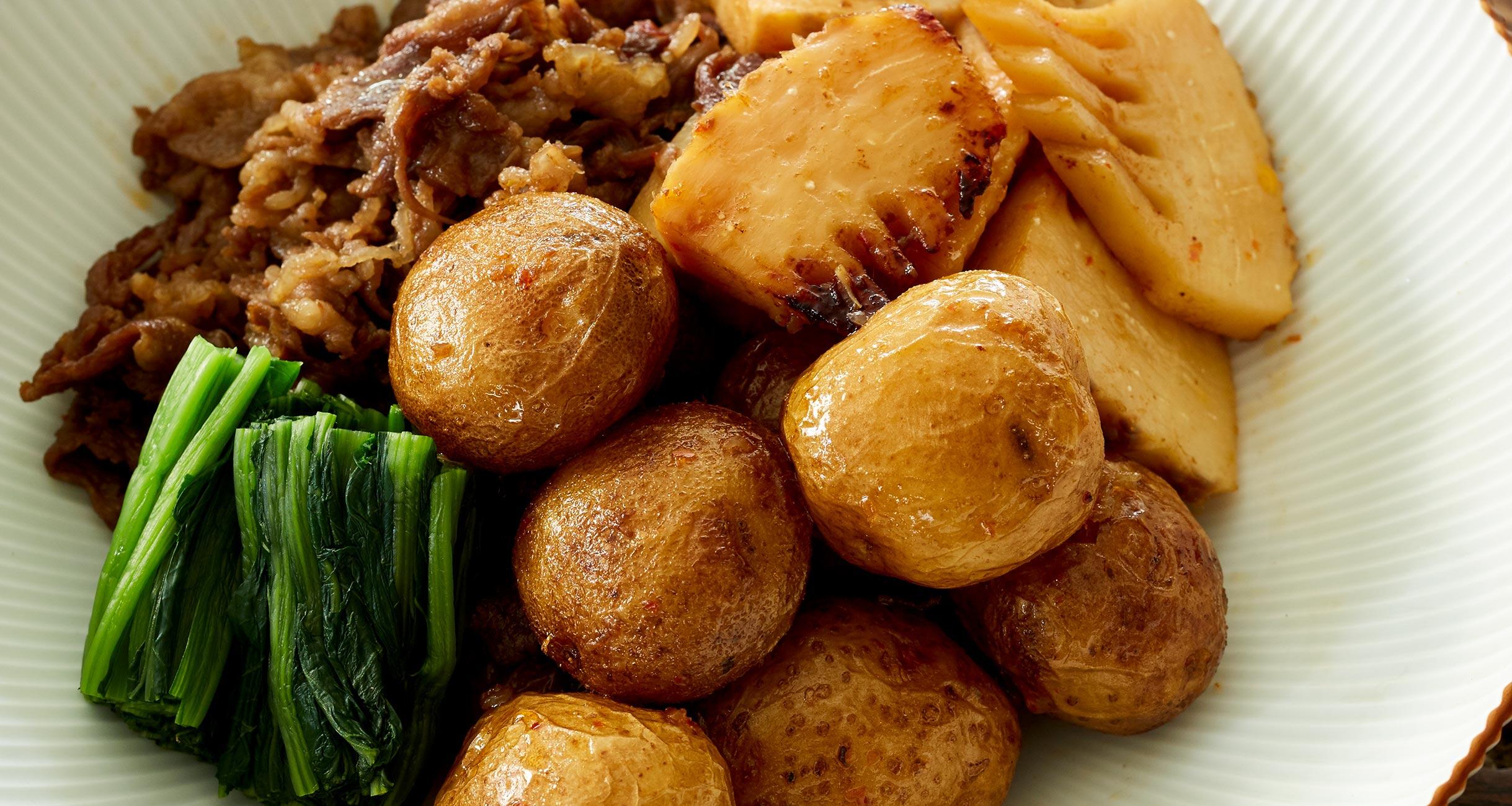 「牛肉をじっくりと炒めて鍋底にたまった肉の脂で、揚げじゃがを炒りつけます。じゃがいもをおいしくするための肉の脂だから、安い切り落とし肉で十分」。下ゆでしたじゃがいもを皮つきのまま揚げると、中はほくほく、外はカリカリ。肉の脂の旨味を吸わせると、ほろりとくずれるやわらかさに。煮詰まったたれも余すことなく、からませながら食べよう。